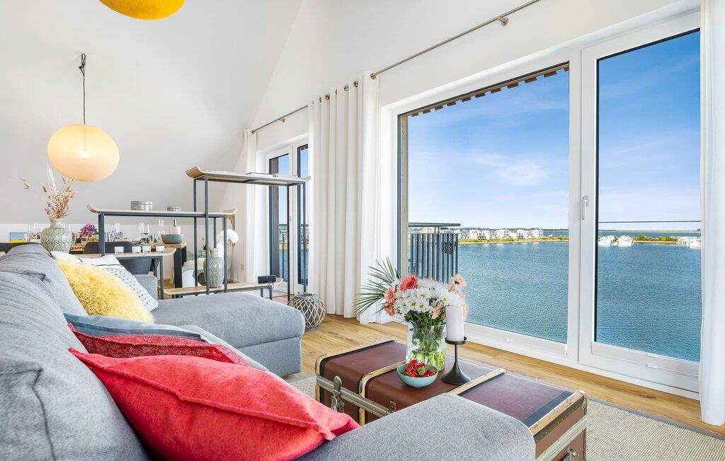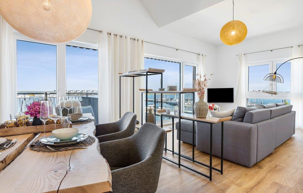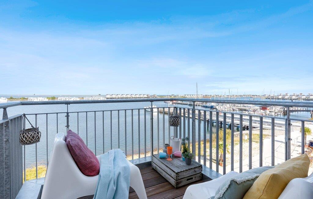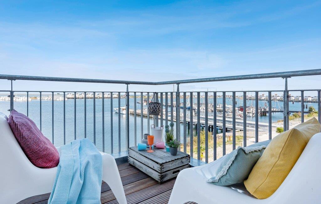 Moderne Ferienwohnung mit Balkon und Hafenblick im OstseeResort Olpenitz, ideal für Familien und Wassersportfans.