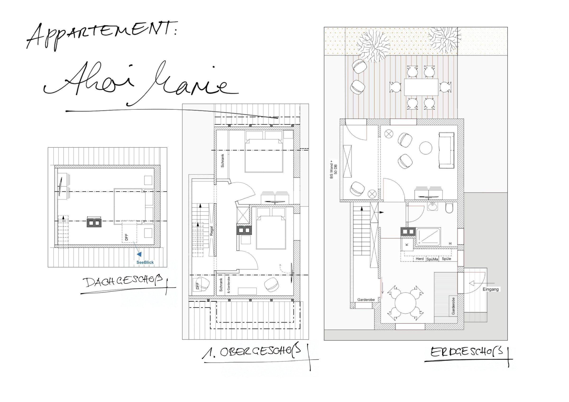 Die Ferienwohnung „Ahoi Marie“ in Sechendorf bietet Platz für bis zu sechs Personen in drei gemütlichen Schlafzimmern, die sich unter dem Dach mit schrägen Wänden befinden. Das stilvolle Wohnzimmer schafft eine einladende Atmosphäre zum Entspannen, während die voll ausgestattete Küche die Zubereitung kulinarischer Kreationen ermöglicht. Ein modernes Badezimmer sorgt für den nötigen Komfort während des Aufenthalts.