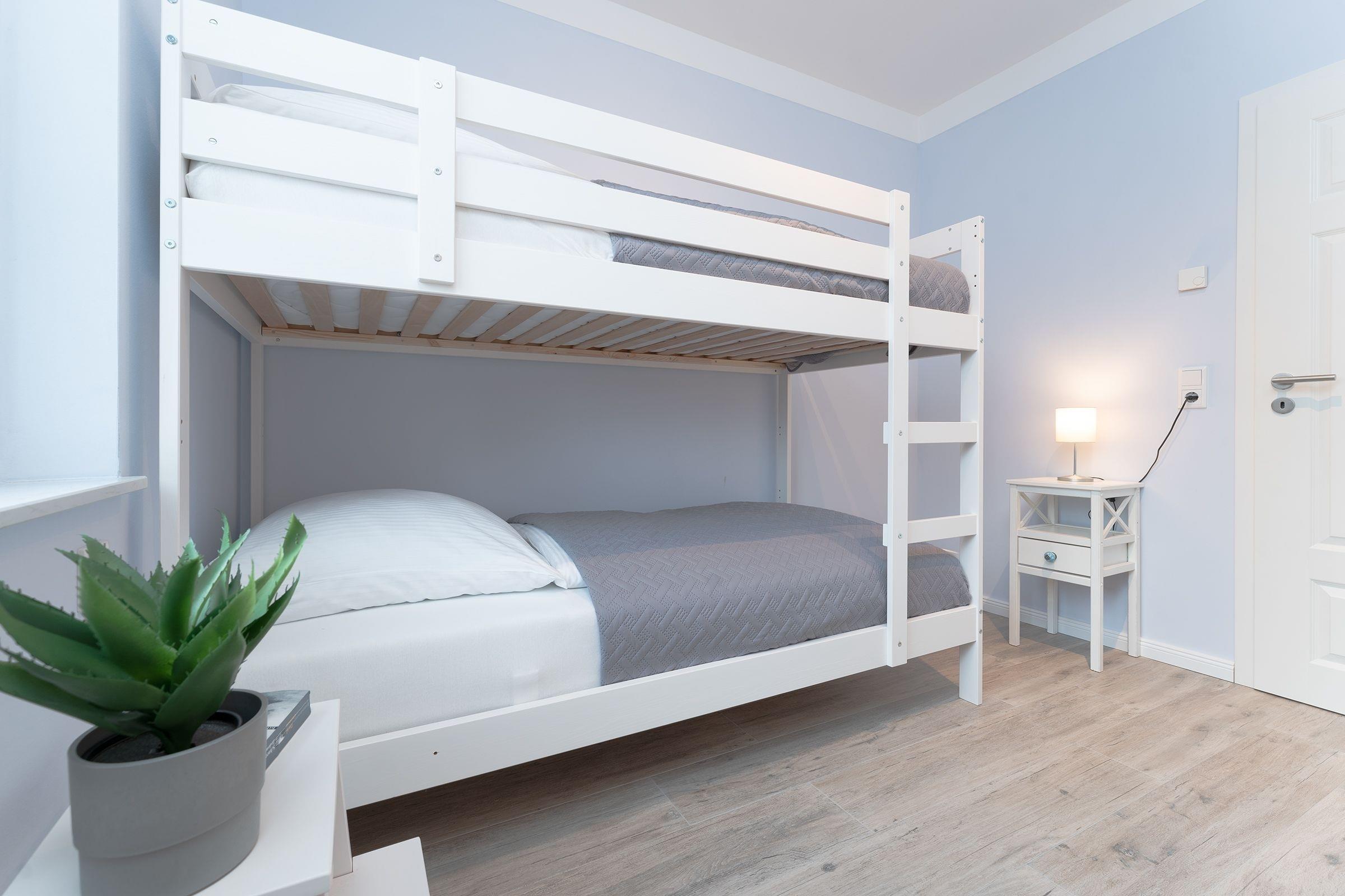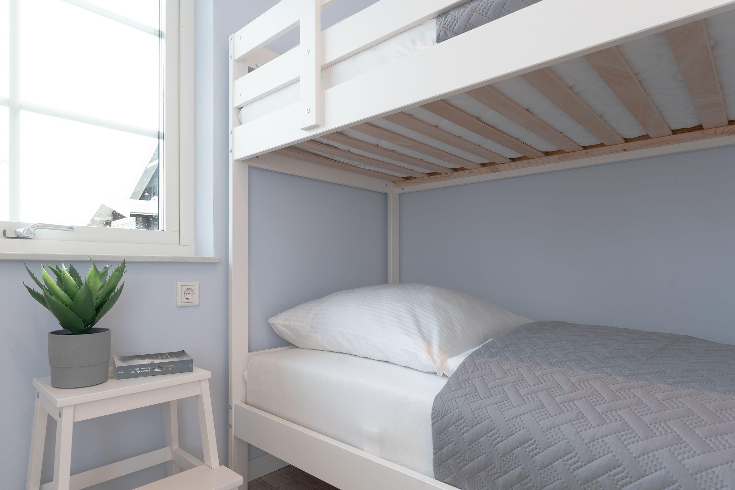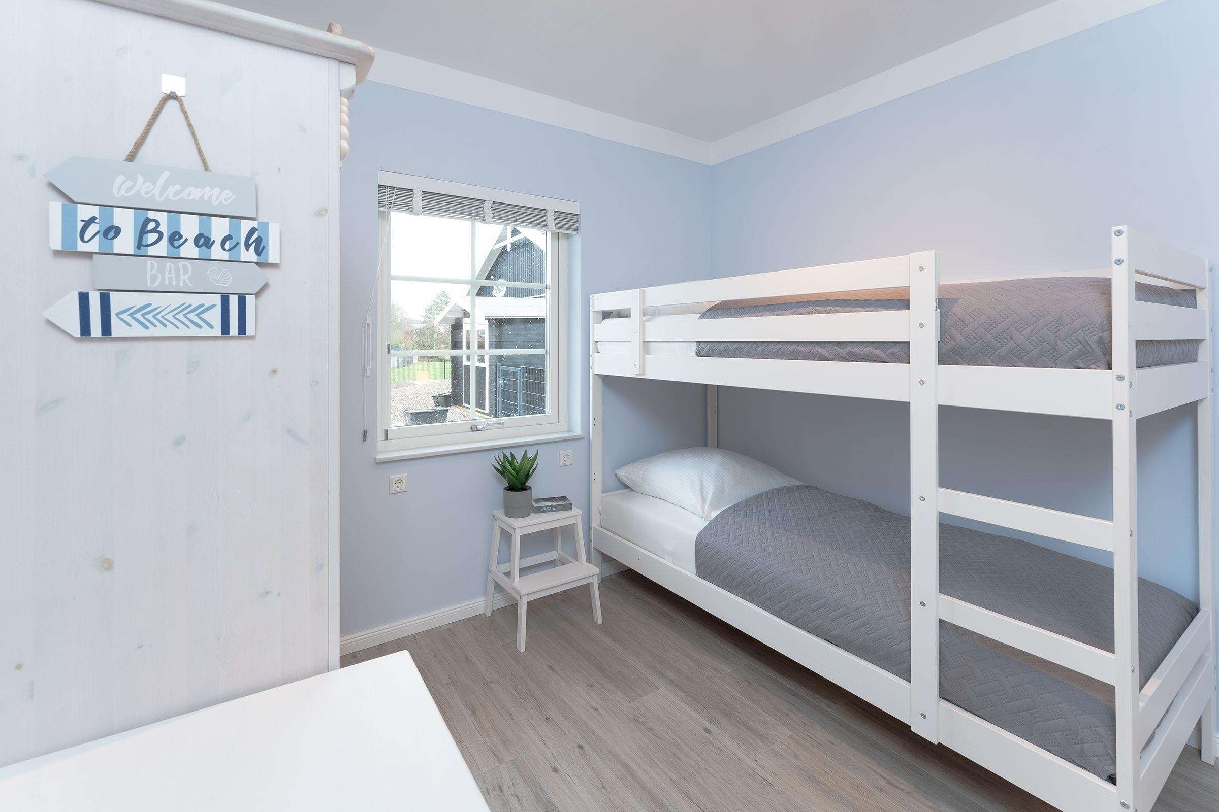 Schlafzimmer 2: 1 Etagenbett (2x 80x200 cm), Kleiderschrank, TV, Verdunkelung (Holzjalousien)