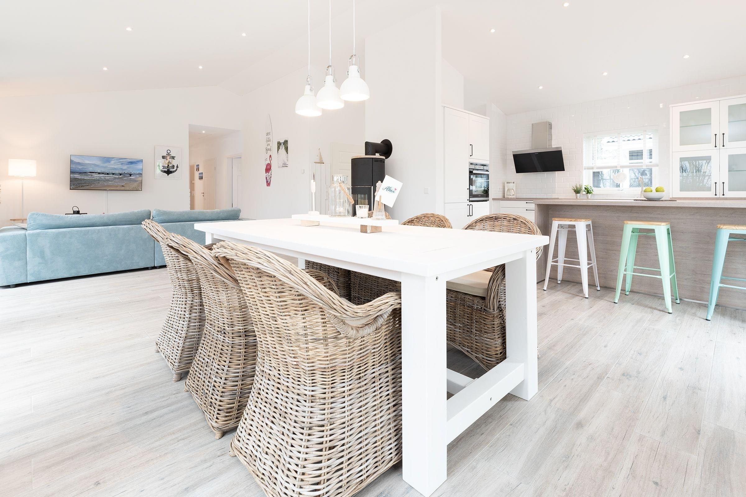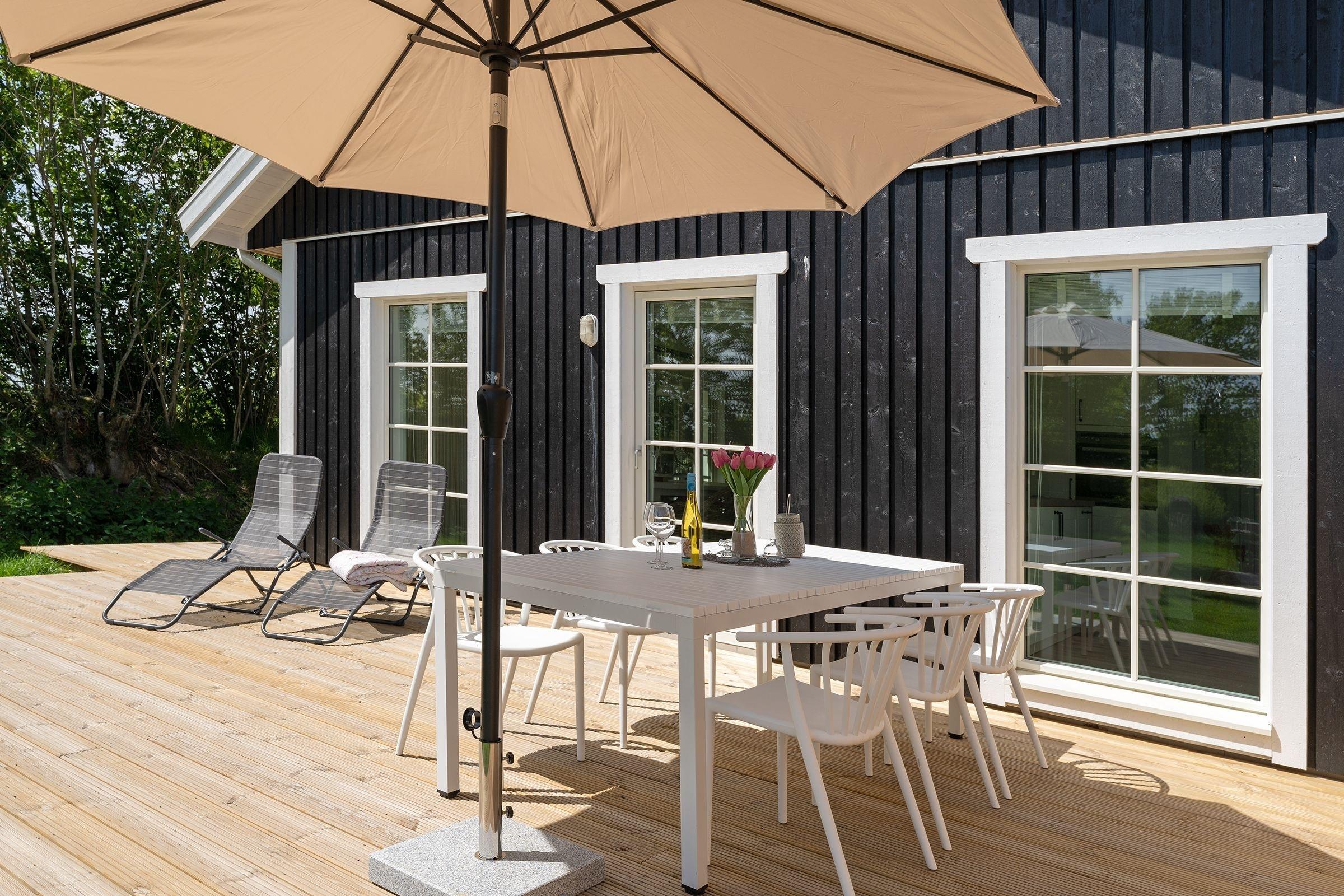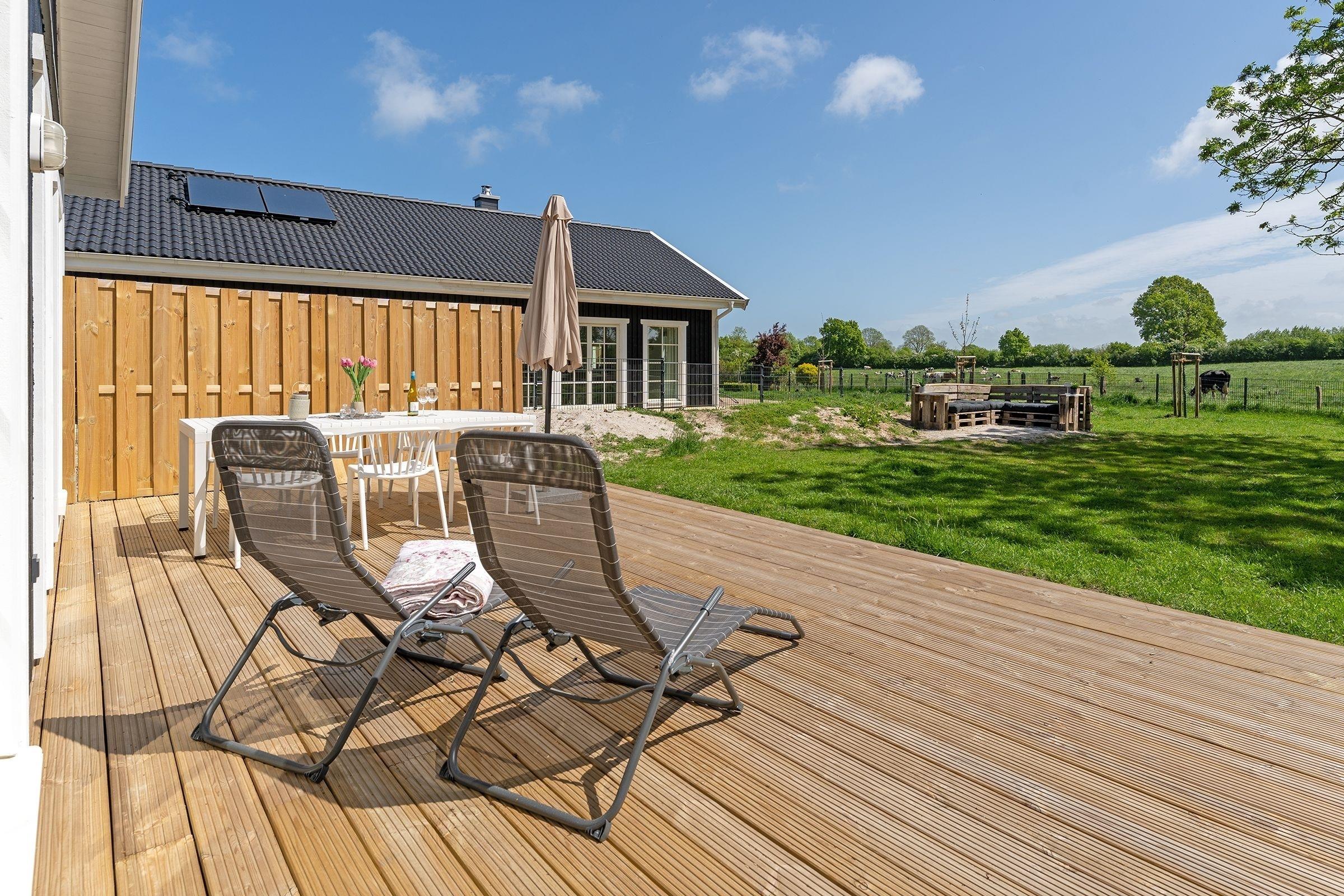 Dieses skandinavische Ferienhaus empfängt Sie mit einem offenen Wohnraum, der durch seine hohe Decke besticht. Die geschmackvolle Einrichtung und das gemütliche Sofa laden direkt zum Entspannen ein - von dort aus haben Sie einen guten Blick auf das flackernde Feuer im Kamin. Für die nächtliche Erholung gibt es drei Schlafzimmer, eines mit einem Boxspringdoppelbett (180x200 cm), eines mit normalem Doppelbett (140x200 cm) und eines mit einem Etagenbett (2x 80x200 cm). Für den frischen Start in den Tag stehen zwei Tageslicht-Bäder zur Verfügung, die unter anderem mit offener Dusche und Fußbodenheizung begeistern. Als besonderes Highlight gibt es eine eigene Sauna im Haus. Der Außenbereich lässt mit Terrasse, Grill, Gartenmöbeln und Sonnenliegen keine Wünsche offen. Die Terrasse ist überdacht, sodass Sie bei jeder Wetterlage die frische Luft genießen können.