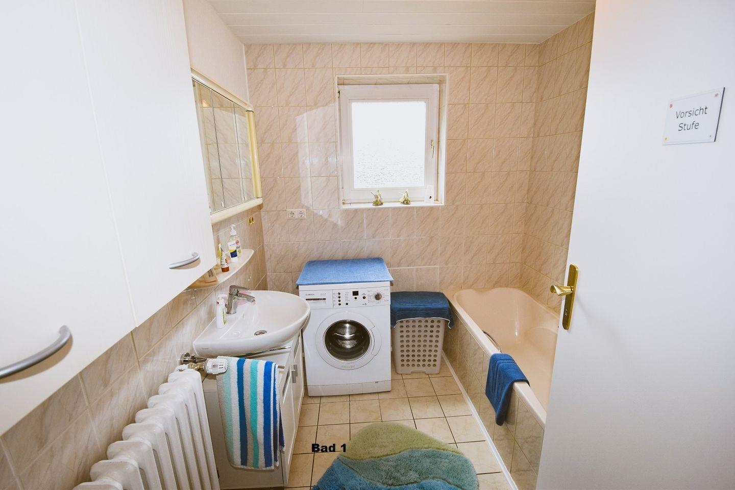 Der letzte Raum im Erdgeschoss ist das 1. Badezimmer des Hauses, in diesem finden Sie eine Badewanne, ein Waschbecken, über diesem einen Spiegelschrank, ein WC, eine Waschmaschine, ein Fenster, welches für Tageslicht sorgt, sowie reichlich Stauraum für Ihre Pflegeartikel.