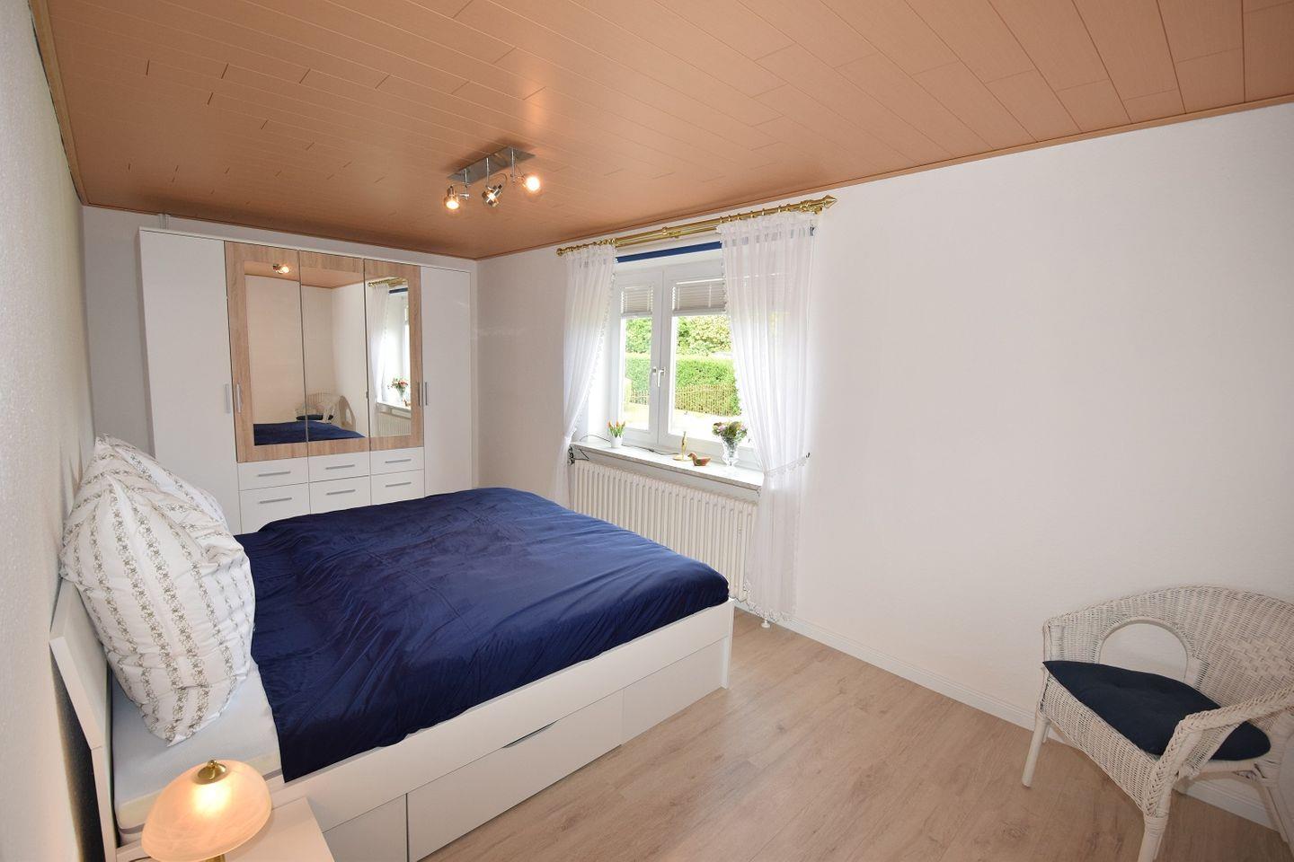Das 1. Schlafzimmer im Erdgeschoss des Hauses bietet mit einem großen Kleiderschrank einen hervorragenden Komfort sowie mit einem bezaubernden Blick auf den Vorgarten des Hauses ein wunderschönes Ambiente.