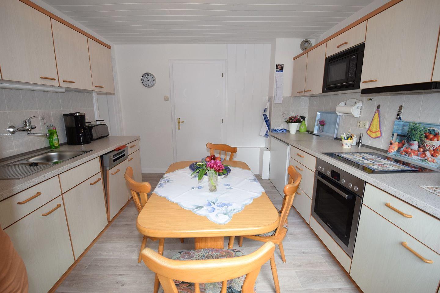 Des Weiteren finden Sie im Erdgeschoss eine große Küche, mit einem Sitzbereich, welche keine Wünsche offenlässt. Diese ist durch das große Fenster mit viel Tageslicht durchflutet.