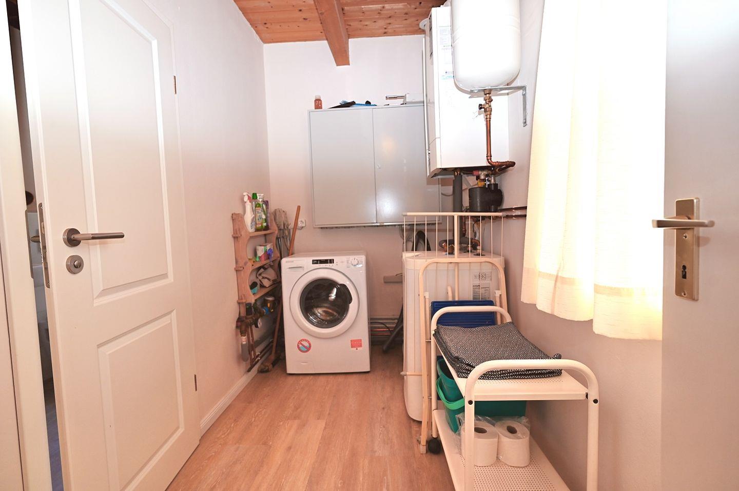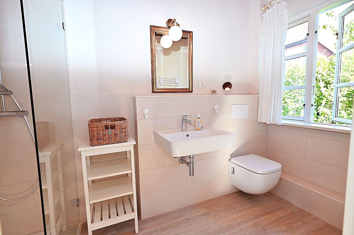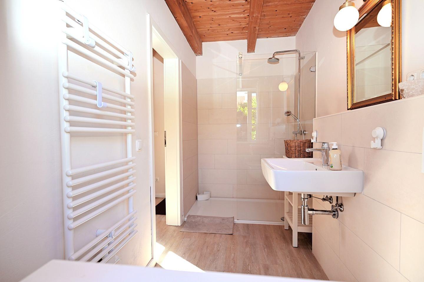 Das Badezimmer ist ebenfalls neu gestaltet und befindet sich ebenerdig. Es verfügt über eine moderne Dusche und sorgt durch seine frische, helle Gestaltung für eine angenehme Atmosphäre. Eine Waschmaschine steht Ihnen ebenfalls zur Verfügung, sodass Sie während Ihres Aufenthalts keine Gedanken an die Wäsche verschwenden müssen.