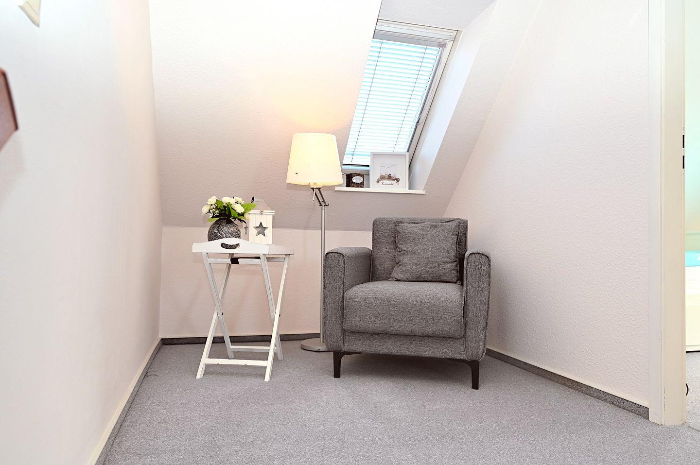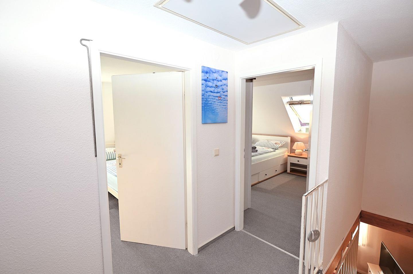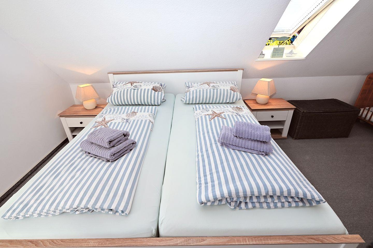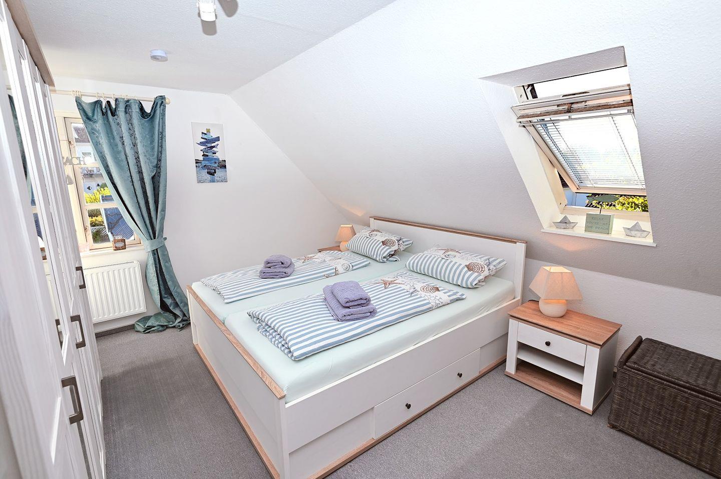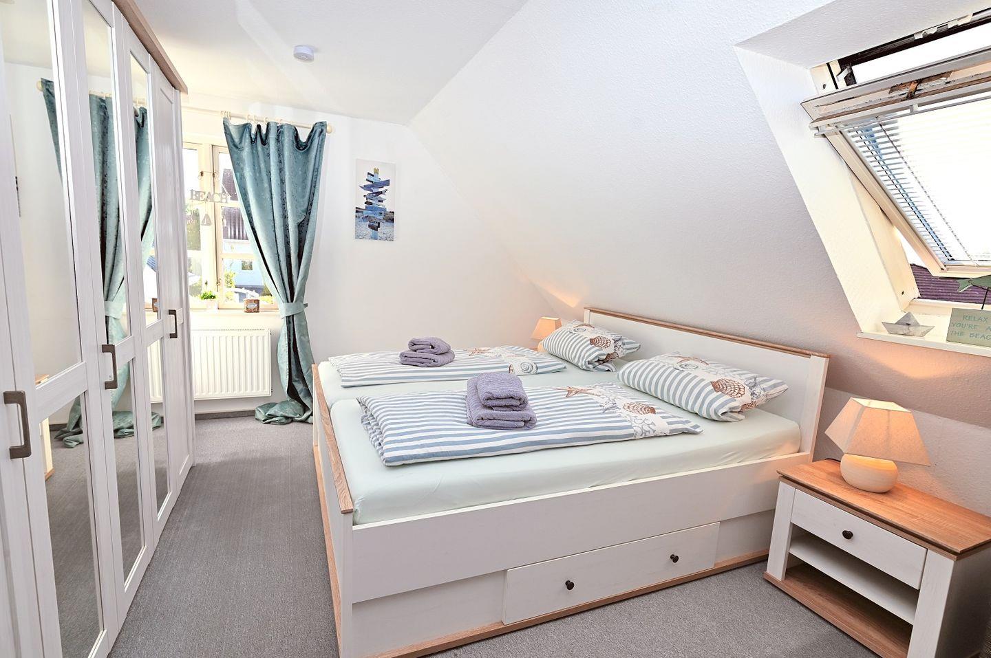 Zwei stilvoll eingerichtete Schlafzimmer sorgen für erholsamen Schlaf. Beide Räume sind hell und freundlich gestaltet und bieten ausreichend Stauraum für Ihre Urlaubsgarderobe. Eines der Schlafzimmer ist mit einem Doppelbett ausgestattet, während das zweite Schlafzimmer mit zwei Einzelbetten aufwartet – ideal für Familien oder kleinere Reisegruppen.