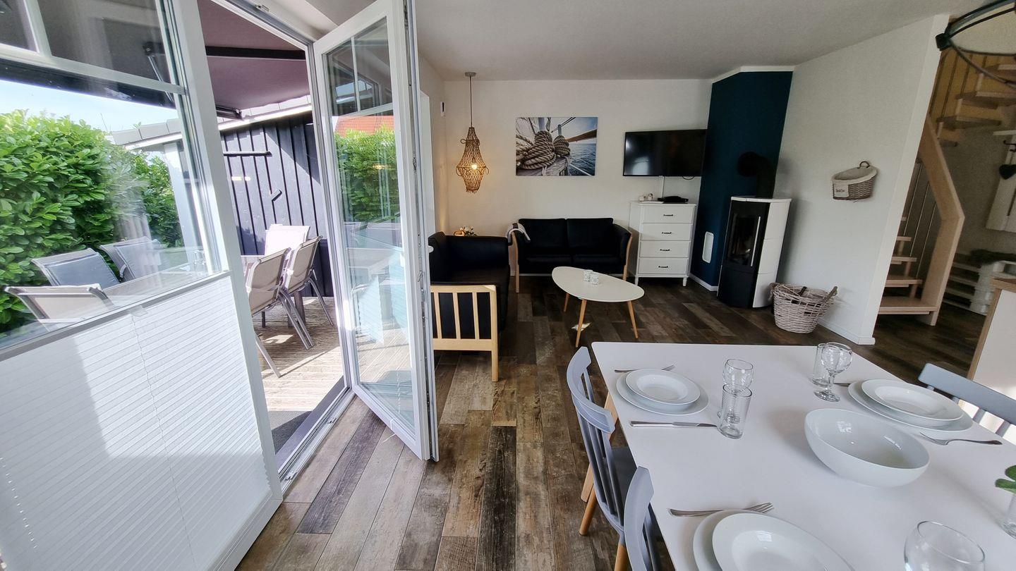 Wohn- Essbereich: 2 gemütliche Sofas / Fernseher / Kamin (Holz exkl.) / Esstisch / 6 Stühle