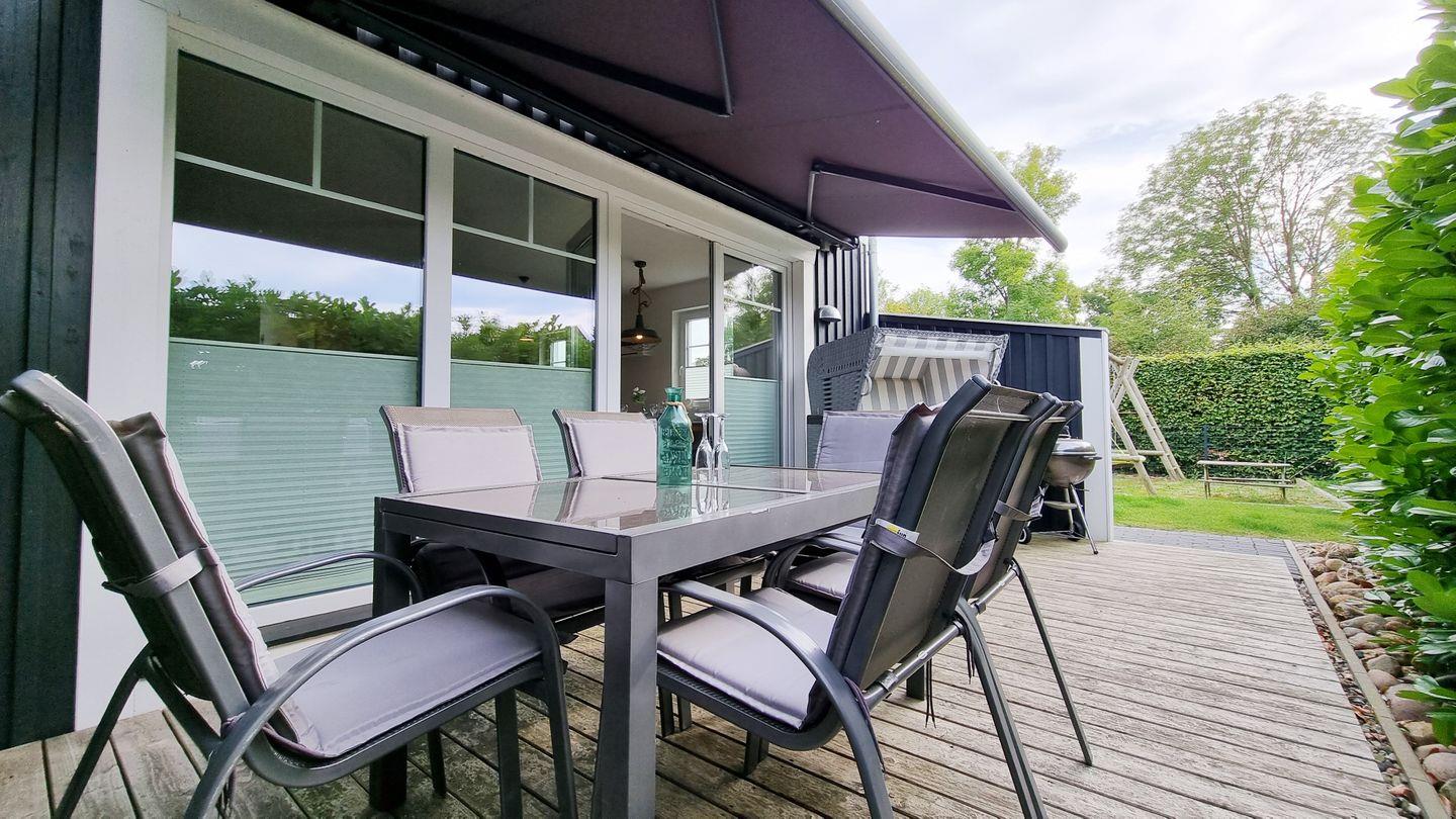Garten und Terrasse: 320qm eingezäunt / Strandkorb am Haus / Tisch / 6 Stühle / Holzkohlegrill / elektrische Markise / Kinderspielturm