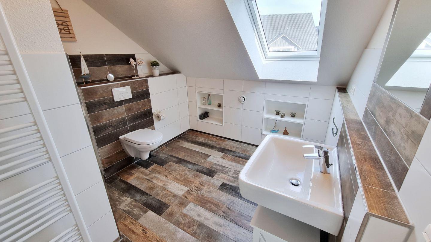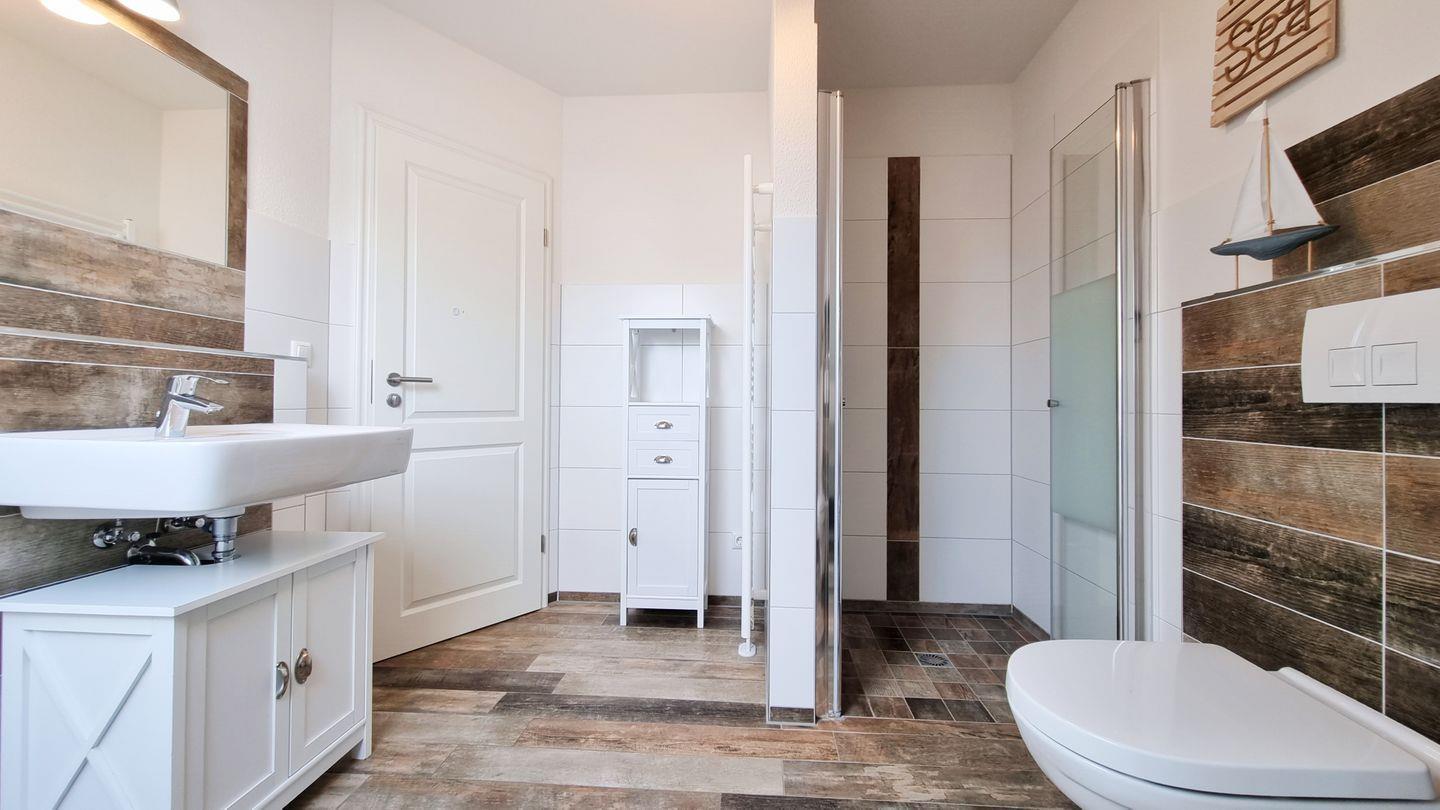 Badezimmer I (OG): Dusche / Waschbecken / WC / Föhn / Handtuchheizkörper