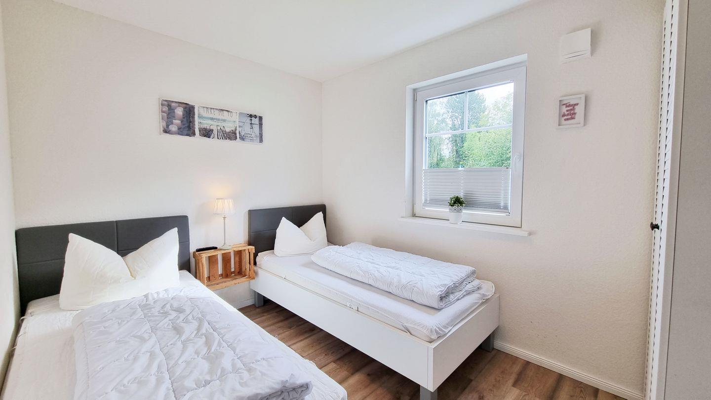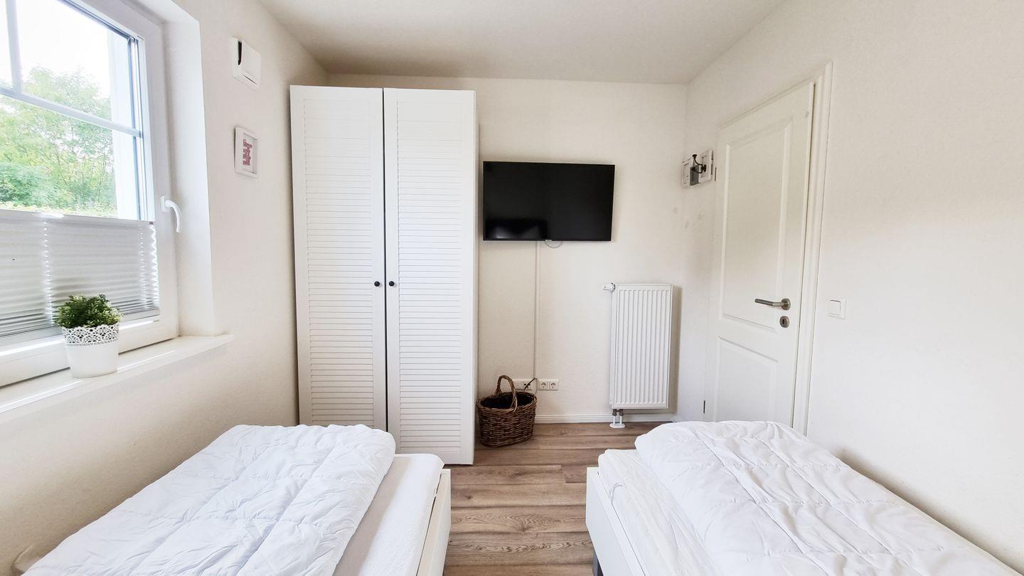 Schlafzimmer III (EG): zwei Einzelbetten / Schrank / Plissees