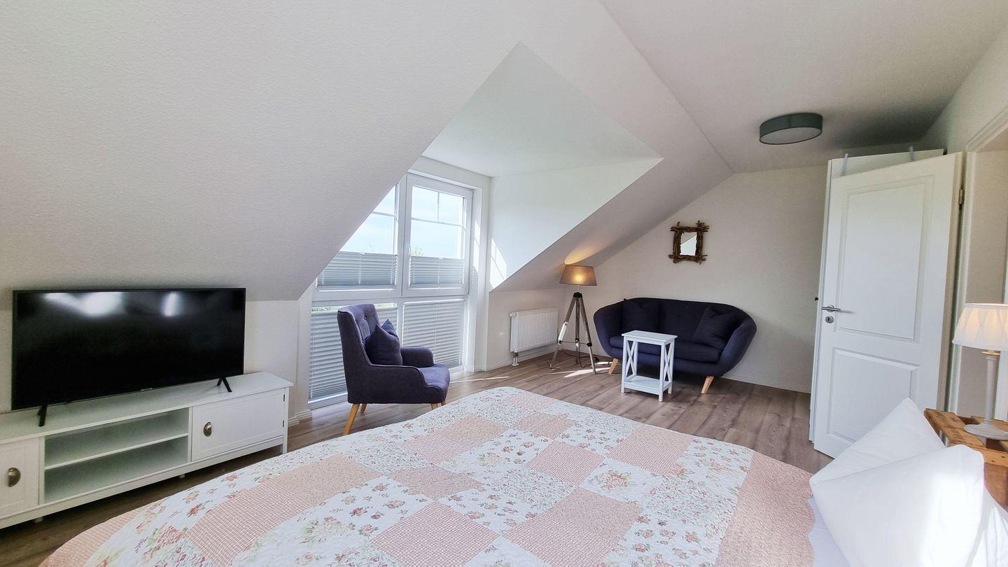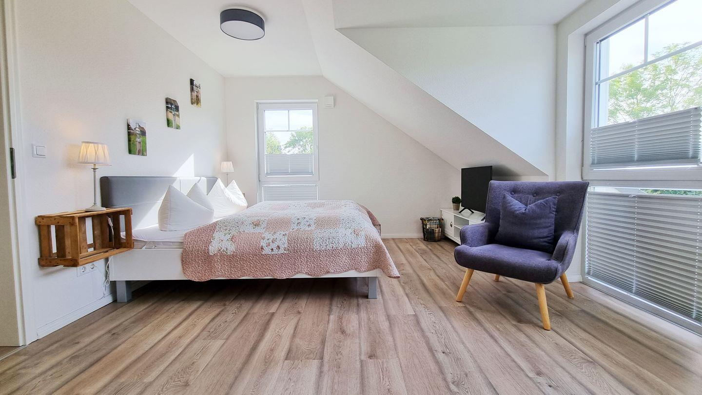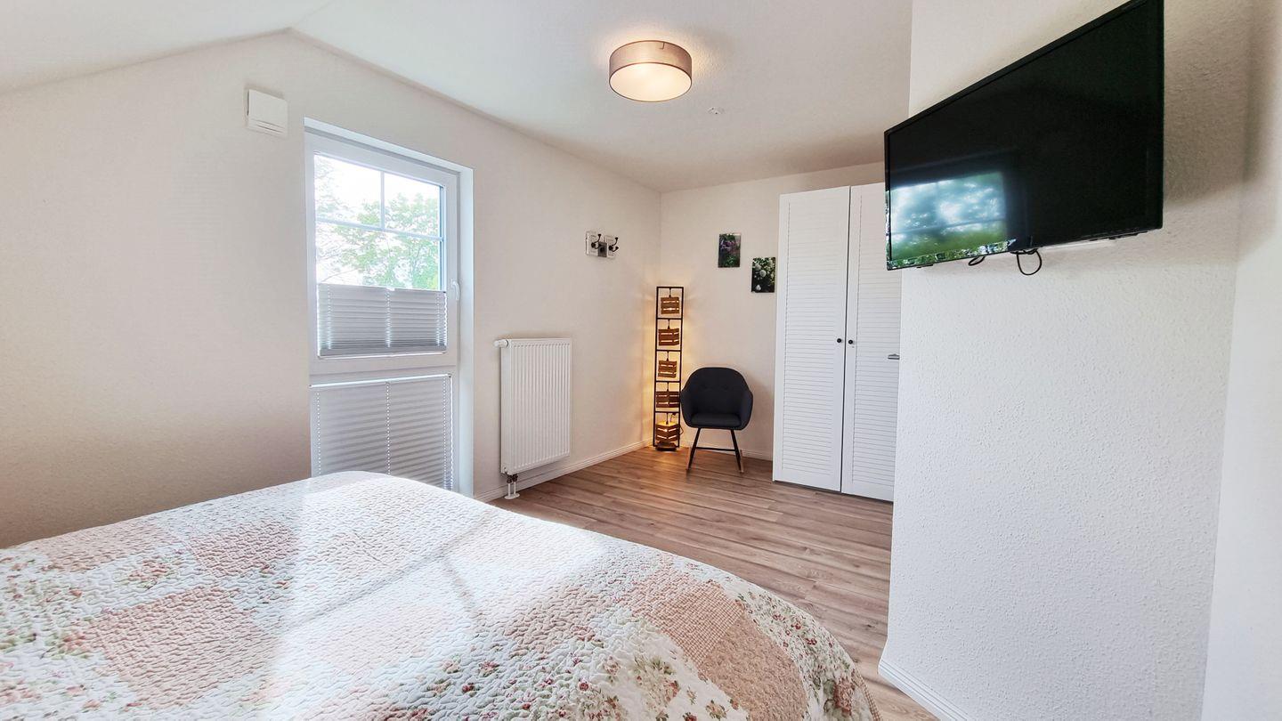 Schlafzimmer II (OG): Doppelbett (180x200cm) / Schrank / Fernseher / Sessel / Plissees