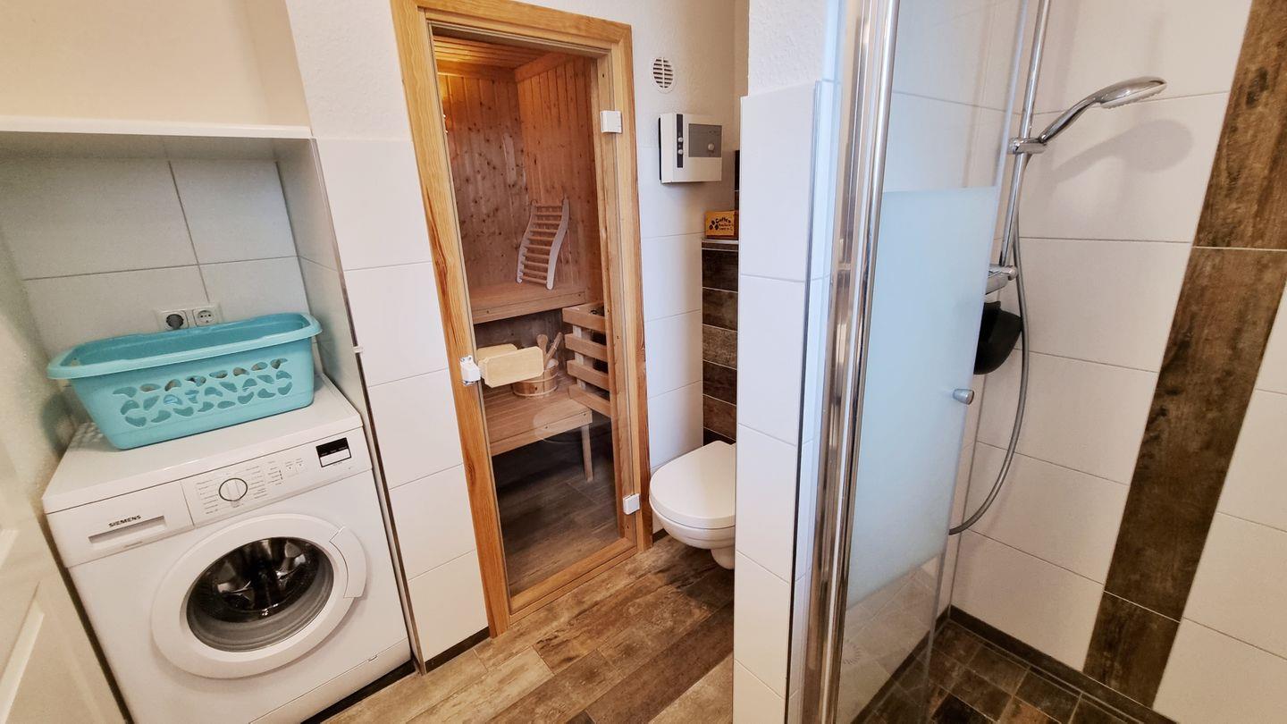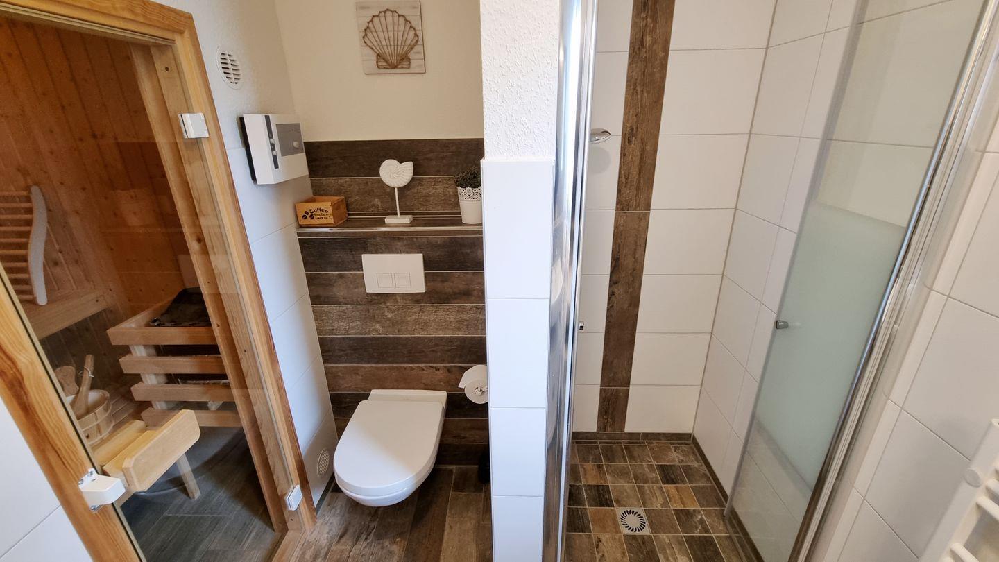 Badezimmer II (EG): Dusche / Waschbecken / WC / Handtuchheizkörper / Sauna