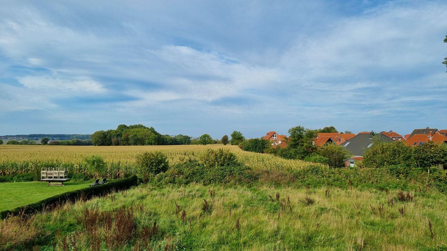 Der voll eingezäunte Garten kann mit viel Rasenfläche, Strandkorb am Haus, Holzkohlegrill und Kinderspielturm auf feinem Sand aufwarten. Wer den Blick in die Weite schweifen lässt, wird mit einem wunderbaren Fernblick auf die Ostsee belohnt.