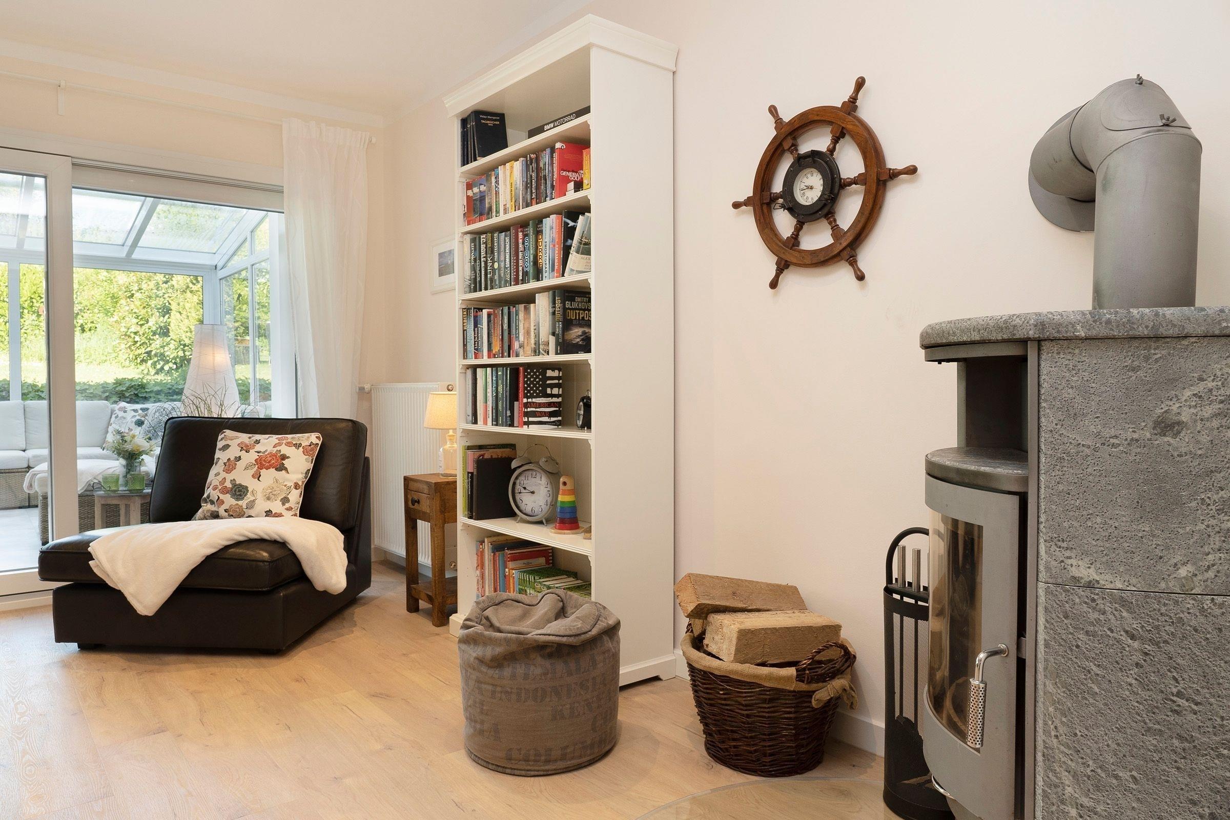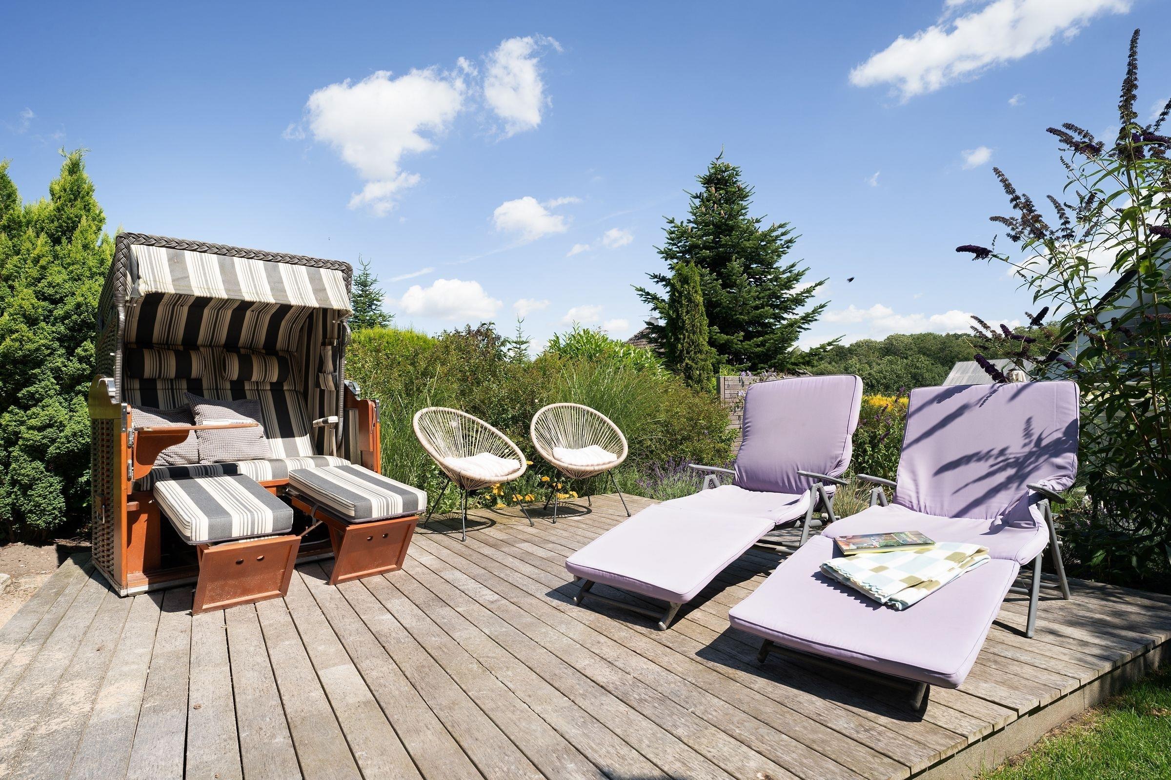 Die Ausstattung ist in modernem, natürlichem Design mit Wohlfühlcharakter und viel Liebe zum Detail. Eine gut ausgestattete große Wohnküche mit Fußbodenheizung bietet jeglichen Komfort und lässt keine Wünsche offen. Dort trifft sich die ganze Familie zum Kochen & Beisammensein. Für wohlige Wärme und Gemütlichkeit sorgt nach einem langen Strandspaziergang der Kamin im geräumigen Wohnzimmer. In dem mit exklusiven Loungemöbeln ausgestattetem Wintergarten können Sie das ganze Jahr in wohliger Wärme die direkte Nähe zur Natur mit Blick in den Himmel genießen. Die drei separaten Schlafzimmer mit je einem Doppelbett (2x 180x200 cm, 1x 160x200cm) garantieren Ihnen erholsame Nächte. Eins der Schlafzimmer bietet mit einem Schlafsofa (140x190 cm) zwei weitere Schlafplätze für unsere kleinen Gäste. Der großzügige Garten mit hochwertigen Gartenmöbeln, Sonnenliegen, Sonnenschirm und Strandkorb lädt zum Verweilen im Grünen ein und schafft Urlaub vom Alltag.