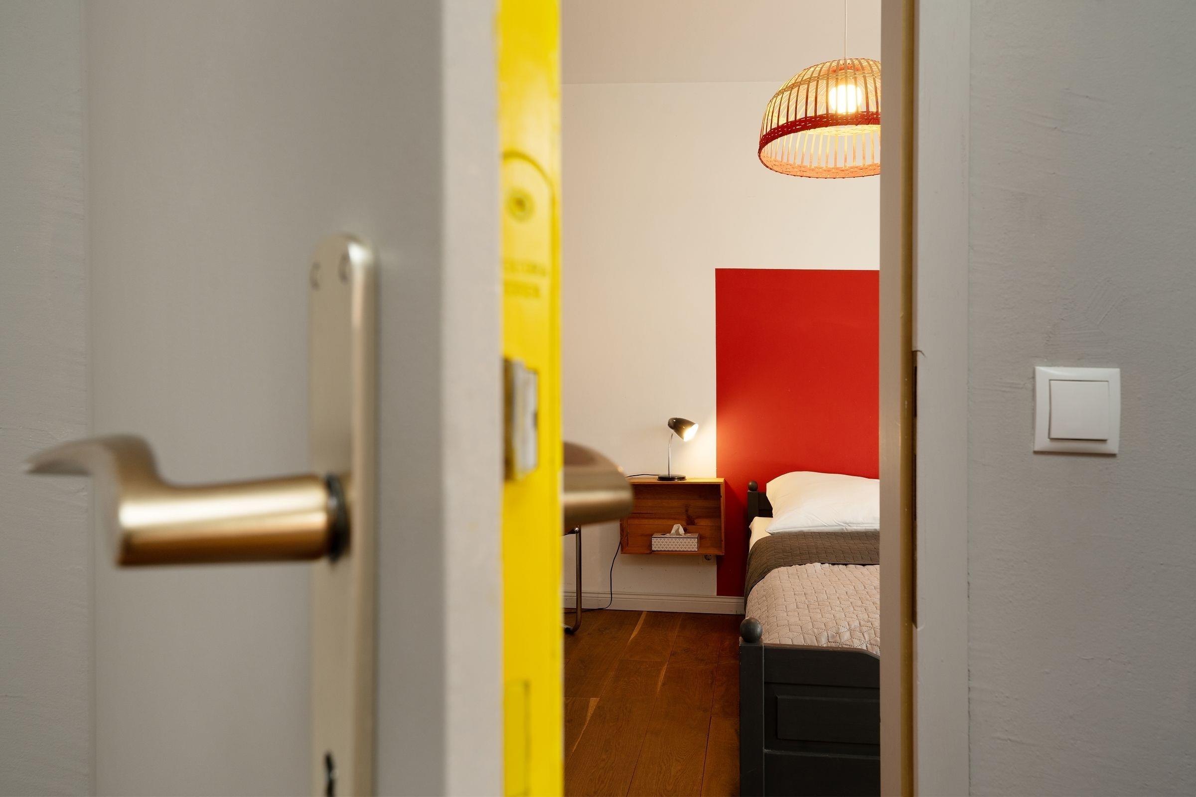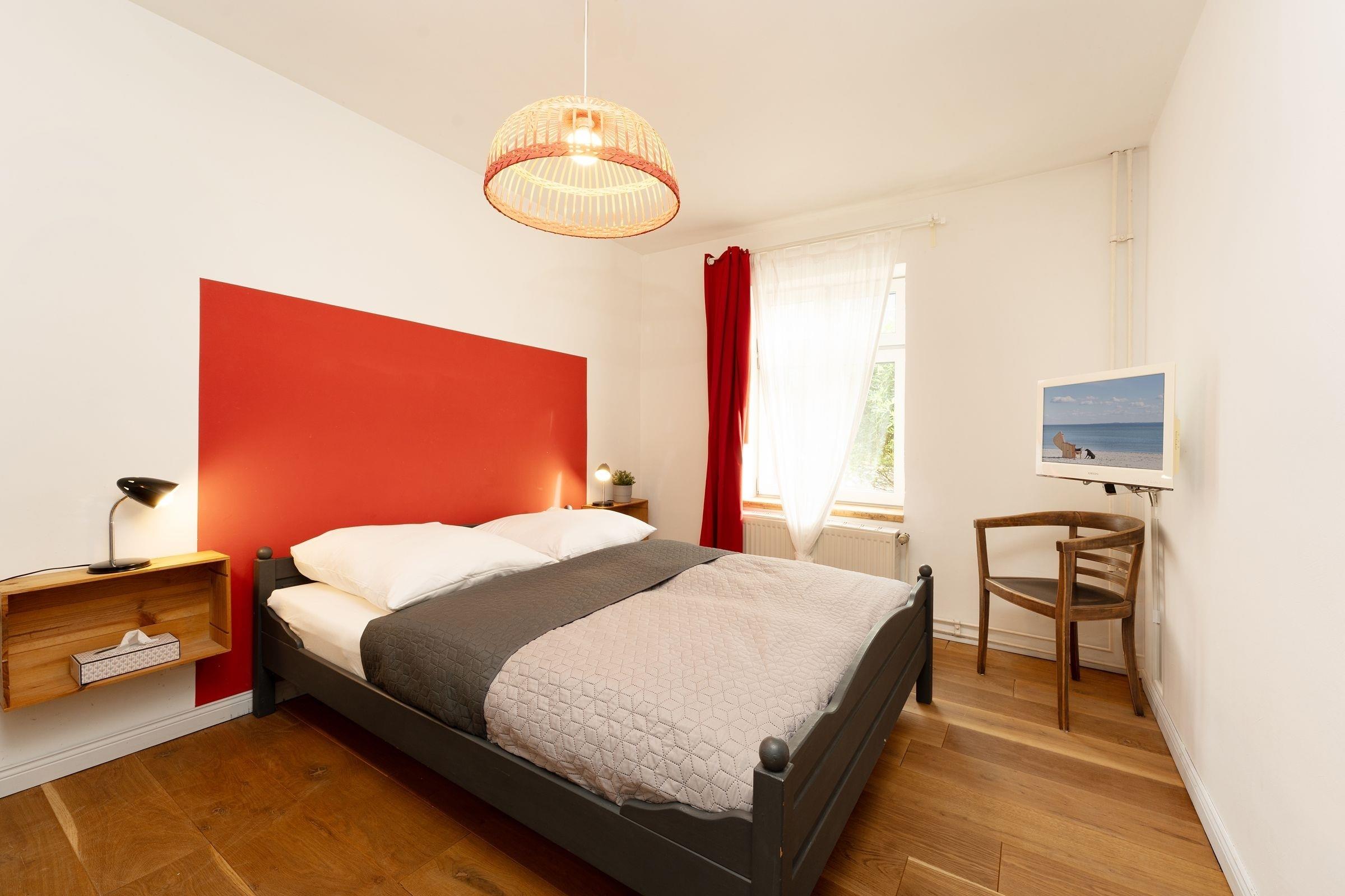 Schlafzimmer 1: 1 Doppelbett (160x200 cm), Kleiderschrank, TV, Verdunkelungsvorhang, Platz für Babybett vorhanden