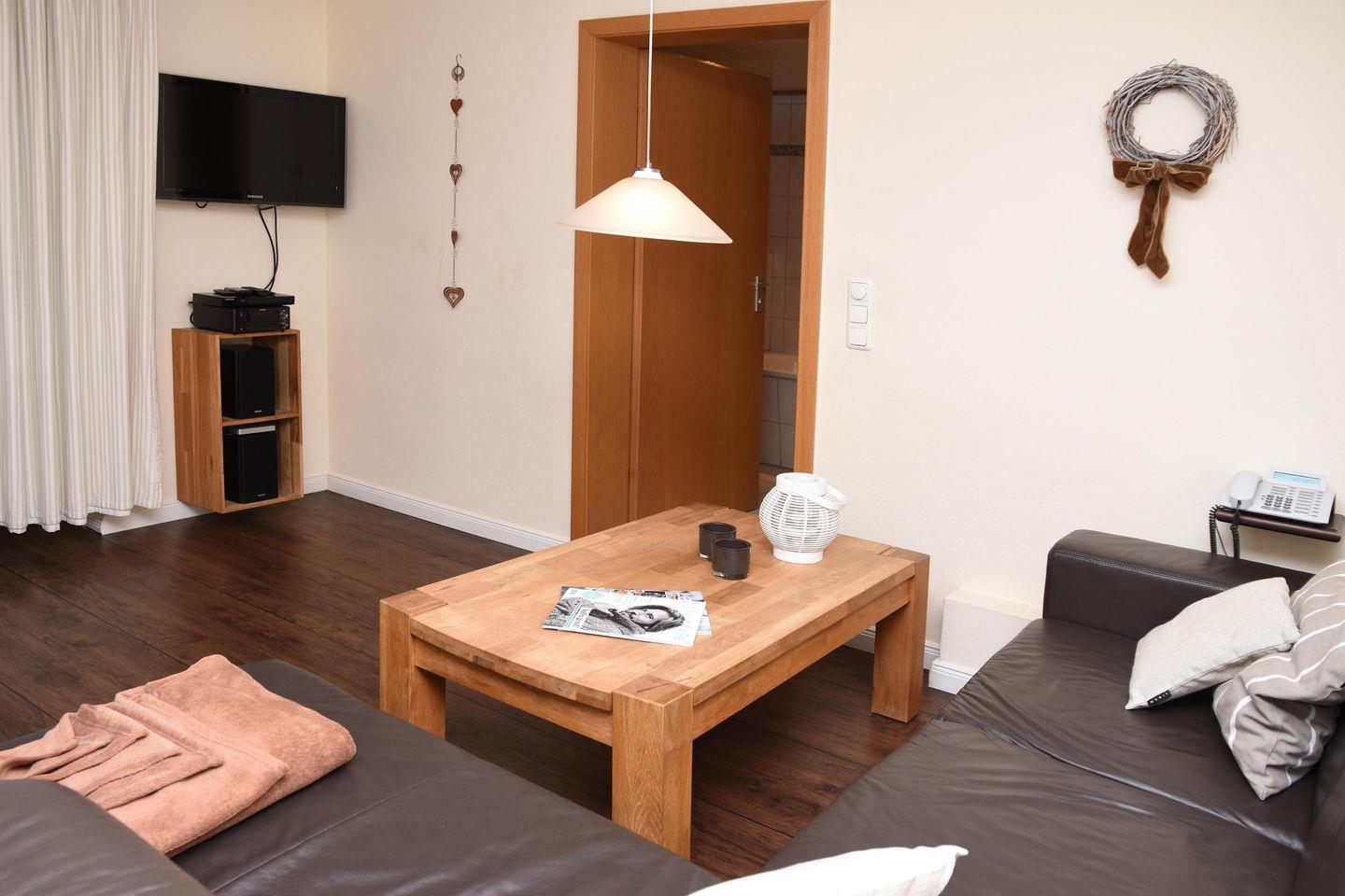 Im Wohnzimmer erwartet Sie ein Fernseher mit DVD Player, ein Radio mit CD Player und ein kostenloser W-LAN Anschluss um immer Up to Date zu sein.