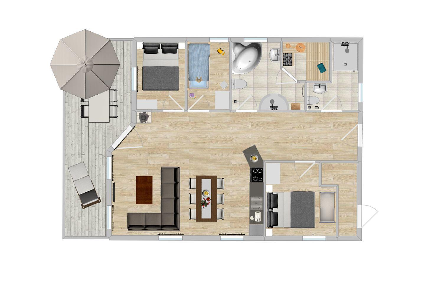 Unser 5* Wellness-Haus Sonnenschein bietet auf 90 m² Platz für 6 Personen (der angegebene Preis bezieht sich immer auf 2 Erwachsene und 2 Kinder, extra Personen können ggf. auf Anfrage dazu gebucht werden). Es befindet sich auf dem Ostsee Ferienhof Bendfeldt mit direktem Blick über die Pferdeweide zur Ostsee.