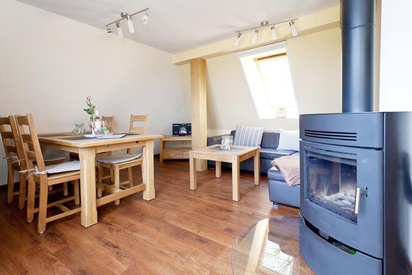 dänischen Kaminofen inkl. Feuerholz • voll ausgestattete Küche • gemütlicher Wohnbereich • Sonnigen Balkon mit wunderschönem Ostseeblick