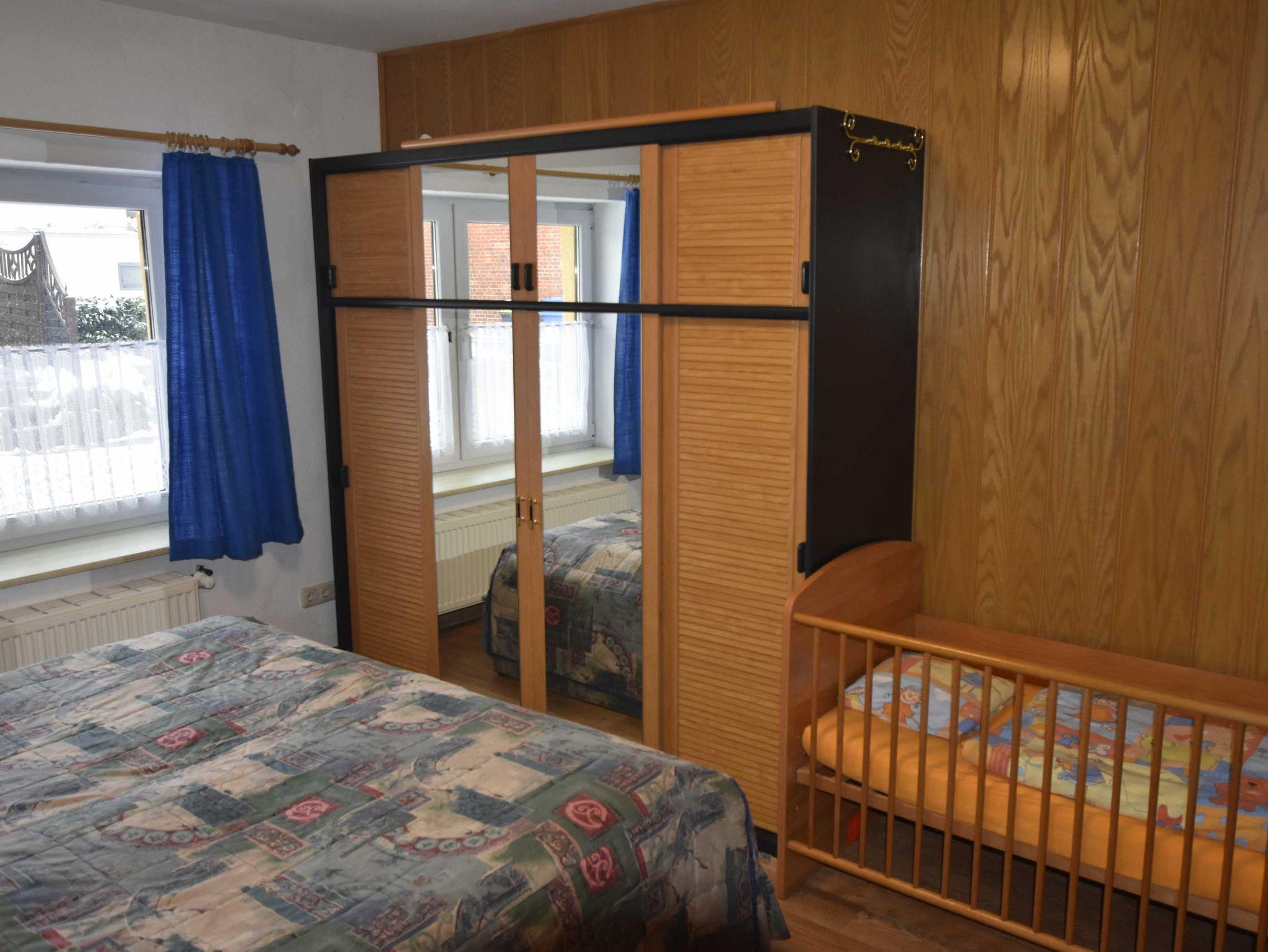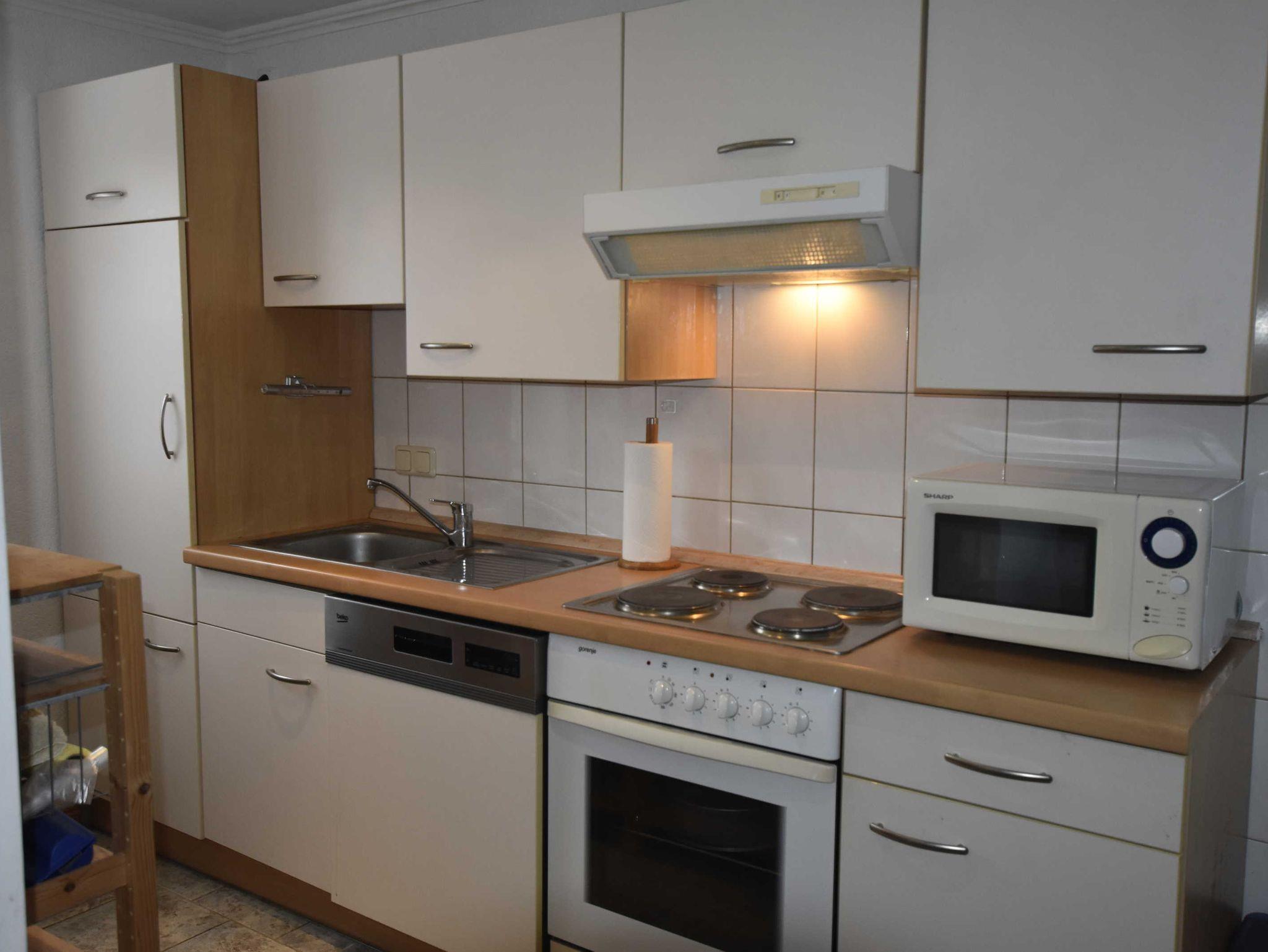 Wohnküche (Eßtisch, E-Herd, Mikrowelle, Kühlschrank mit Gefrierfach, Backofen, Kaffeemaschine, Toaster, Geschirrspüler). Badezimmer mit Dusche/ WC. 1 Schlafzimmer mit Doppelbett, Liege und Babybett. 1 Schlafzimmer mit einem französischen Doppelbett