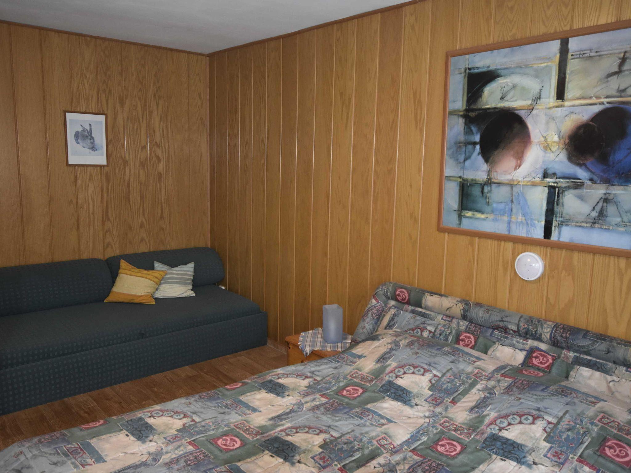 2-Raum-Ferienwohnung mit 1 Schlafzimmer, Du/WC, Küche, Wohnzimmer mit ausziehbarer Schlafcouch.
