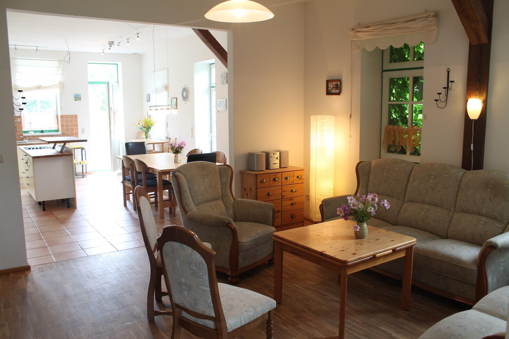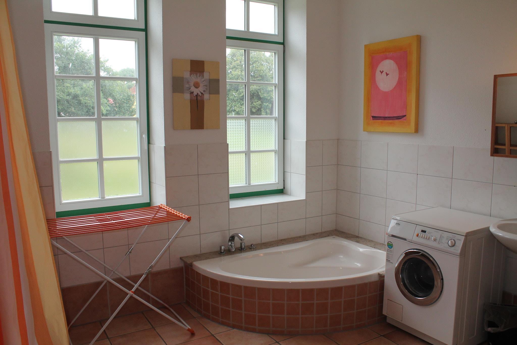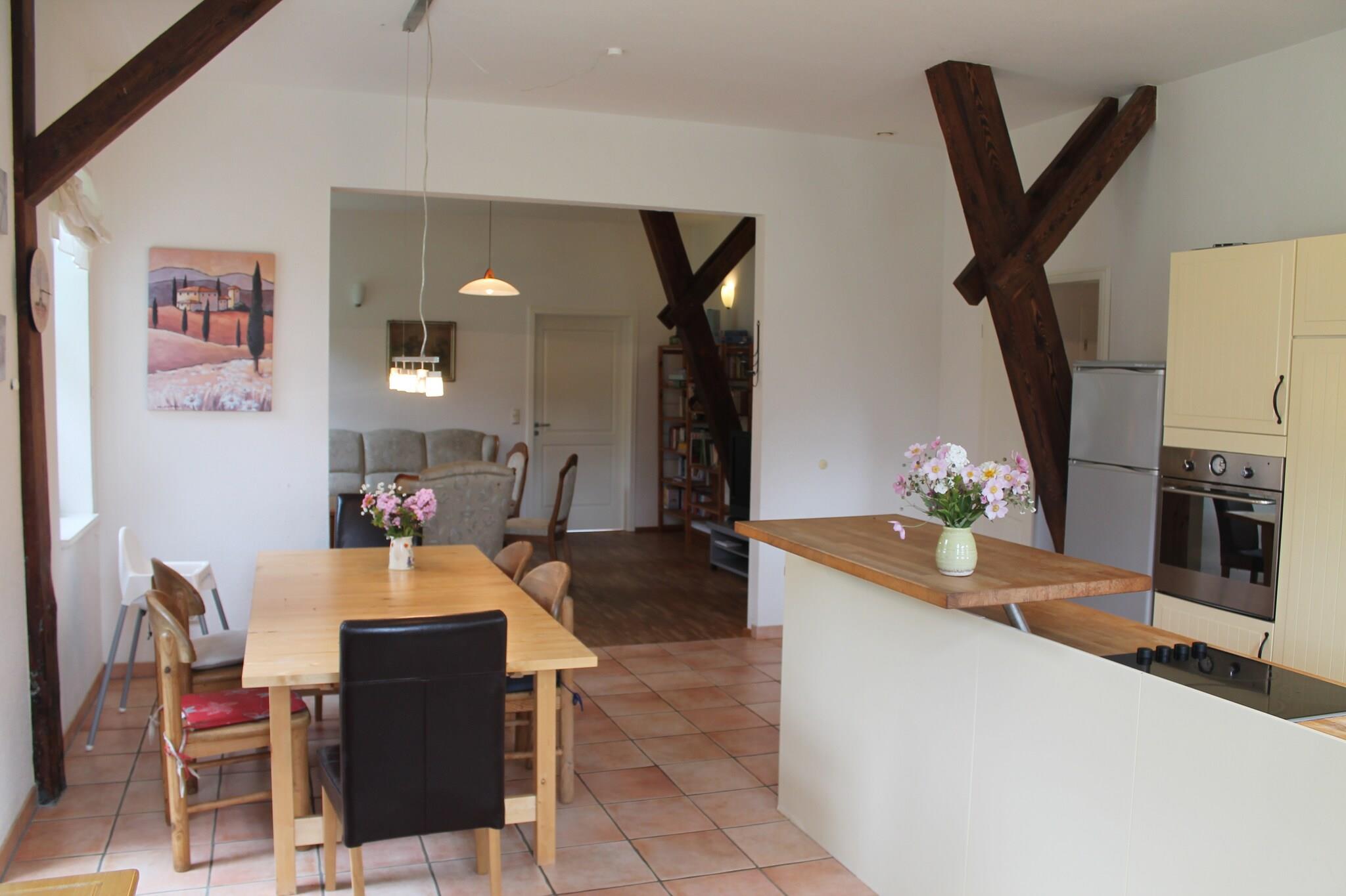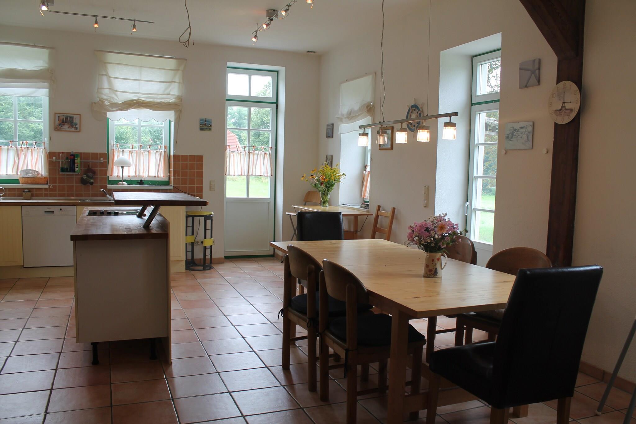 Komfortabel eingerichtete Ferienwohnung in einem alten Pferdestall, der 1937 erbaut und 2005 saniert wurde, im kleinen ruhigen Dorf Blowatz, direkt am Ostseeradweg gelegen. In dem Haus befindet sich noch eine weitere Ferienwohnung. Diese 5-Raum-Ferienwohnung bietet Platz für max. 7 Personen, liegt im Erdgeschoß mit umlaufender Terrasse (Ost-Süd-West). Zu den Räumlichkeiten gehört 1 große Wohnküche mit 6 m Küchenzeile. Es gibt 2 Terrassenausgänge. Desweiteren gibt es 1 geräumiges Wohnzimmer, 4 separate Schlafzimmer sowie 2 separate Bäder, davon ein großes Bad mit Wanne und bodengleicher Dusche und WC und ein kleines Bad mit Dusche/ WC. Babybett und Hochstuhl stehen kostenlos zur Verfügung. Bitte bringen Sie für die Kinderbetten die Bettwäsche für Ihr Kind selber mit! Für die kleinen Gäste befindet sich im Garten ein Gartentrampolin, eine Sandspielkiste, ein Klettergerüst sowie eine Schaukel. Hinweis: Jugendgruppen sind nicht erwünscht! Per Rad, zu Fuß oder auf dem Pferderücken können Sie direkt vom Haus aus viele Feld- und Waldwege erkunden. Im Ort befindet sich ein kleiner Dorfladen für den ersten Bedarf. Zum Ostseestrand sind es 3 km, mit dem Fahrrad 15 Minuten zum Naturstrand des Salzhaffs