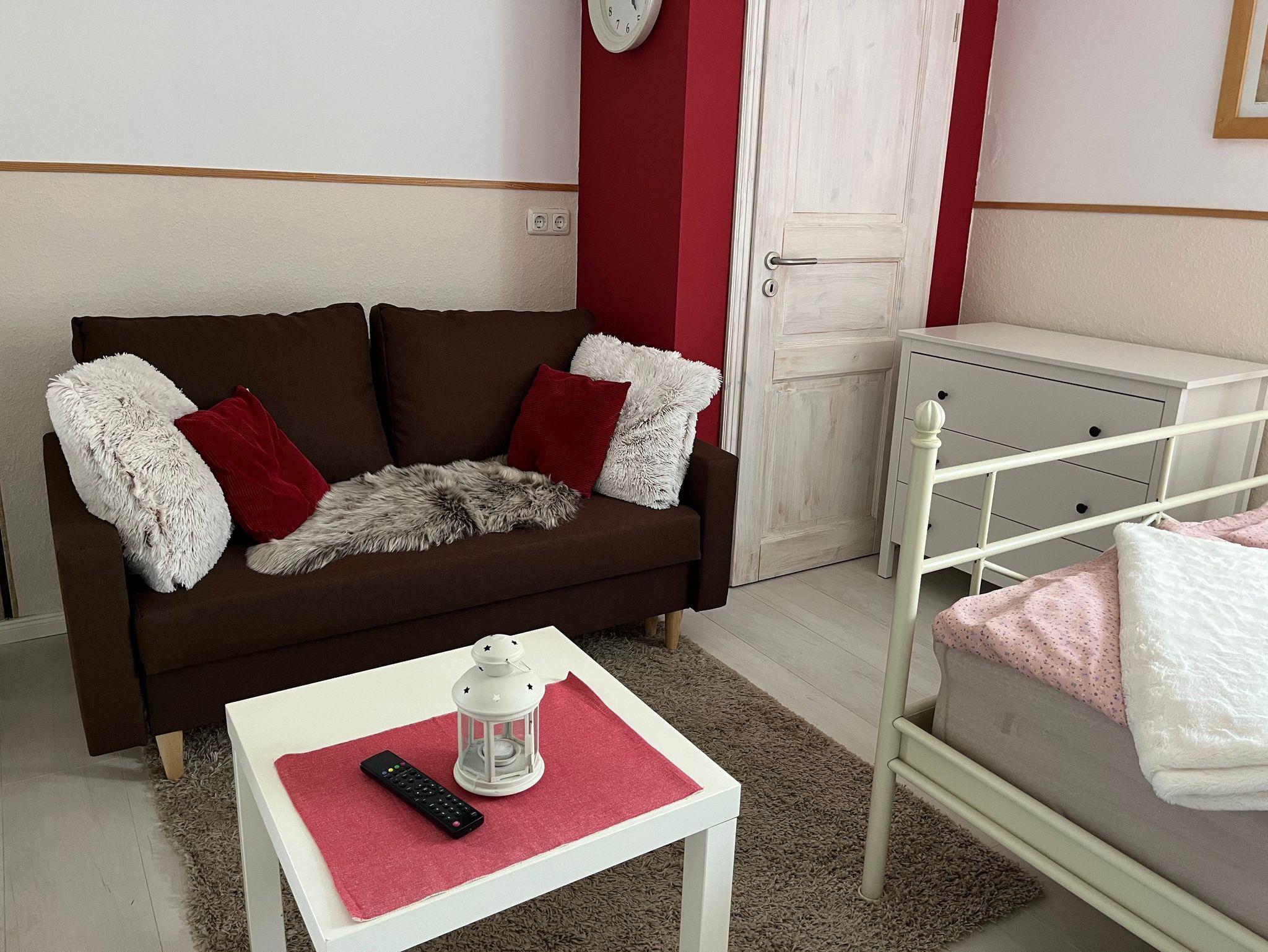Gemütliche farbenfrohe Ferienwohnung im Erdgeschoß. Wohnschlafraum mit Sitzecke und Eßtisch. Integrierte Küchenzeile mit 2-Plattenherd, Kaffeemaschine, Wasserkocher, Toaster und Kühlschrank. Badezimmer mit Du & WC. Föhn vorhanden. Garten mit Sitzecke, Gartenmöbel und Fahrradschuppen.
