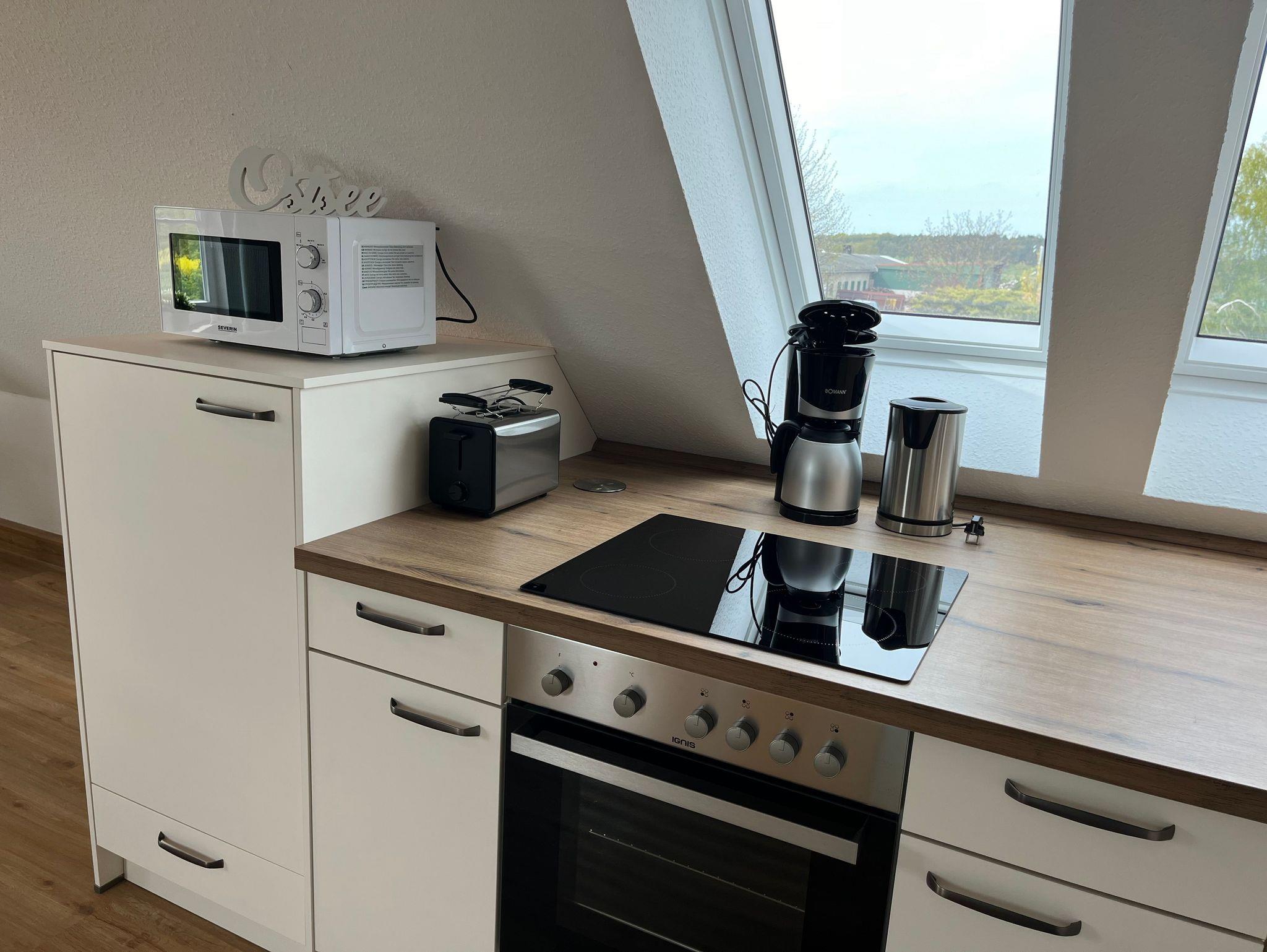 Wohnbereich mit gemütliche Sitzecke und Eßbereich. Küche mit Backofen, Ceranfeld, Mikrowelle, Kühlschrank mit Gefrierfach, Toaster, Kaffeemaschine, Wasserkocher.