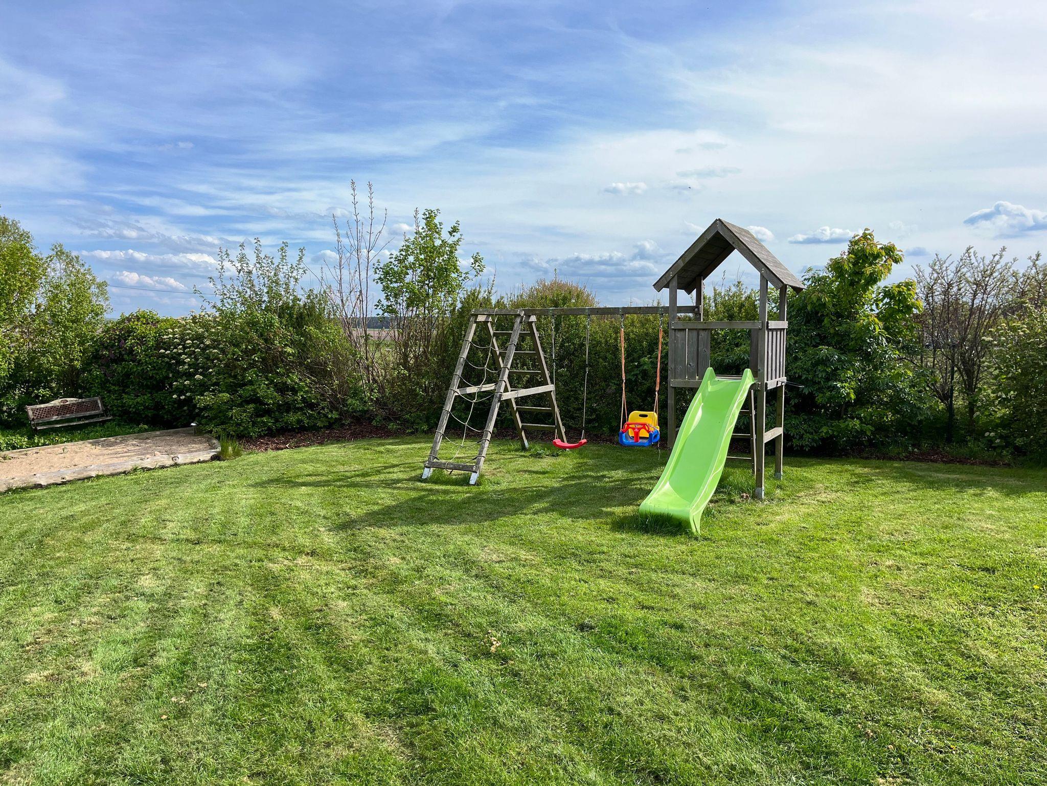 Auf dem Grundstück befindet sich eine Terrasse mit Wiese und für die Kinder Rutsche und Schaukel.
