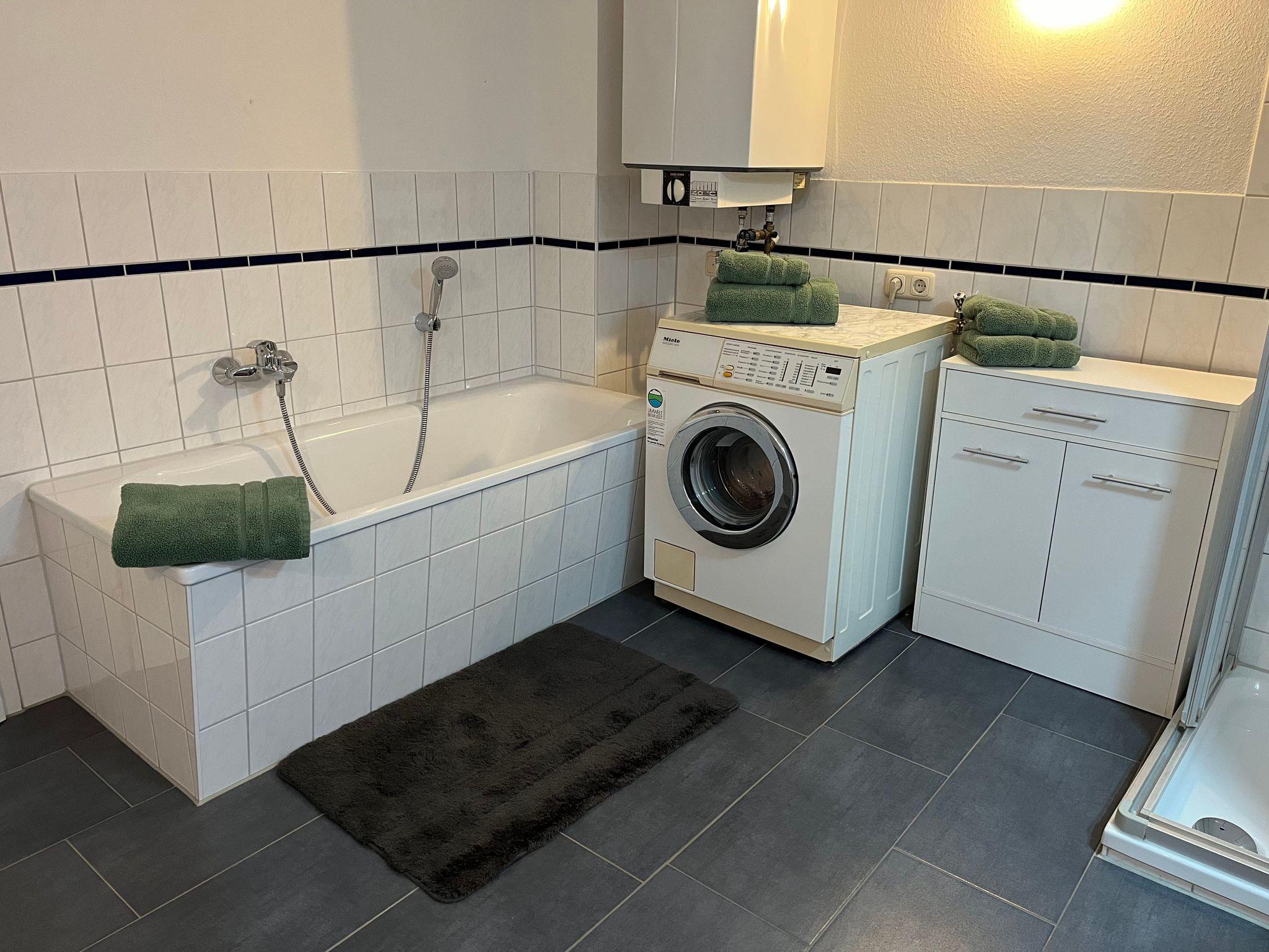 1 Schlafzimmer mit Doppelbett und Kinder-Doppelstockbett (bis 10 Jahre). Das Badezimmer verfügt über Badewanne, Dusche, Waschbecken, Waschmaschine und separates WC.