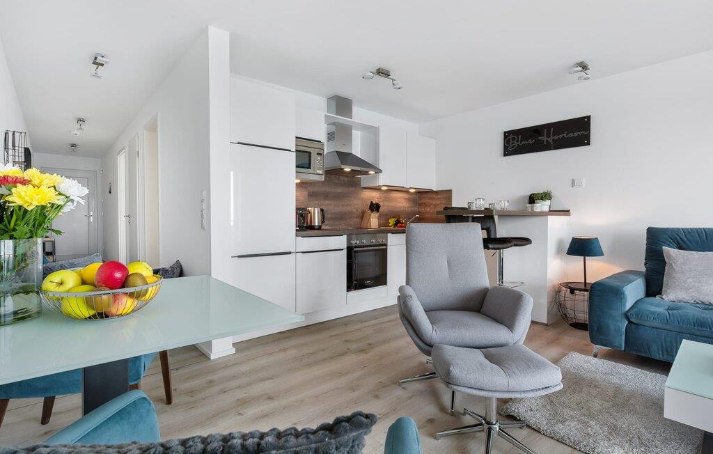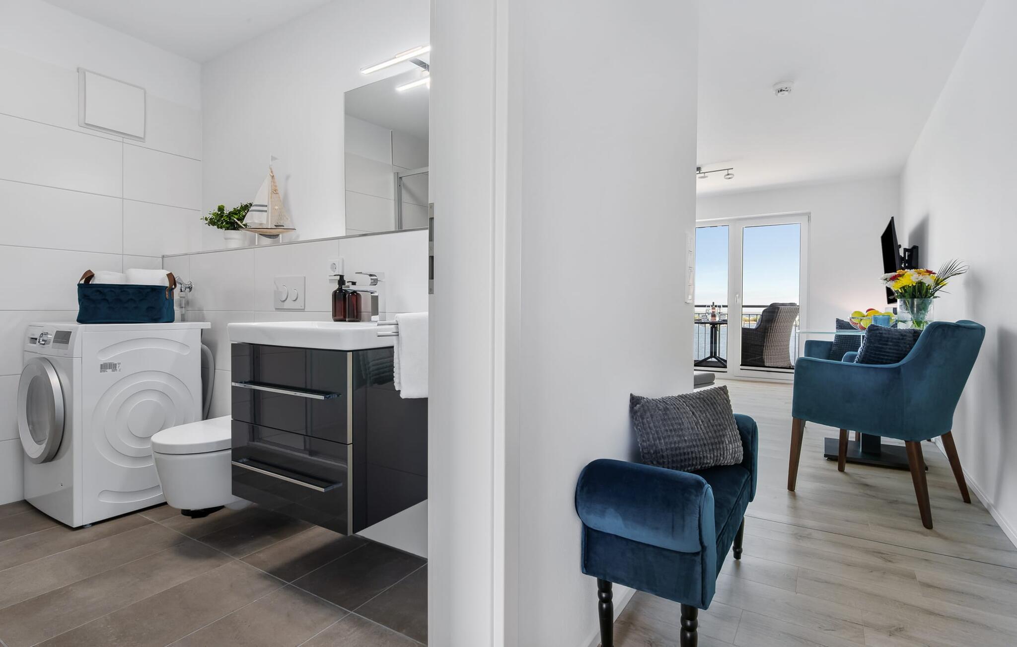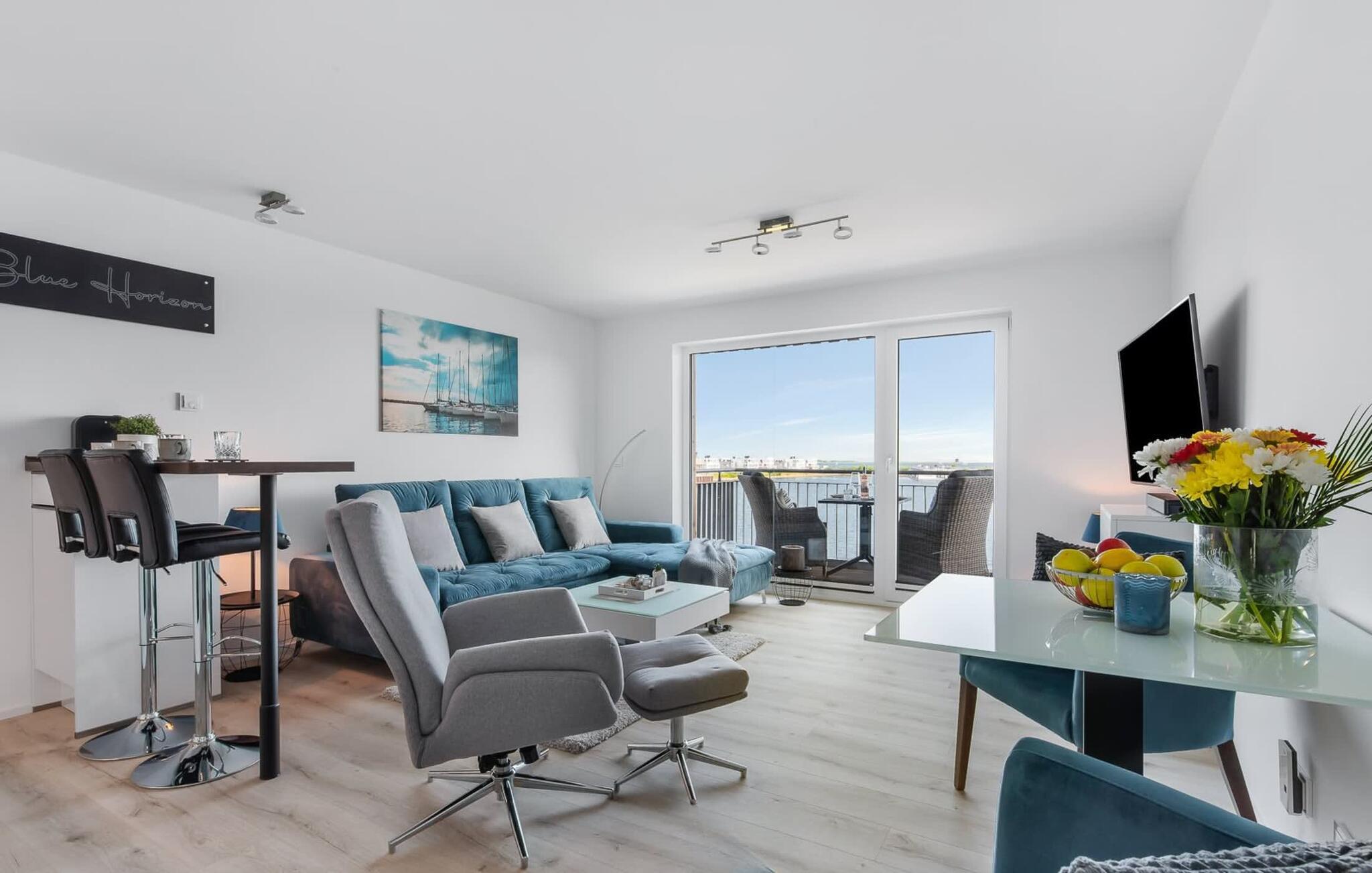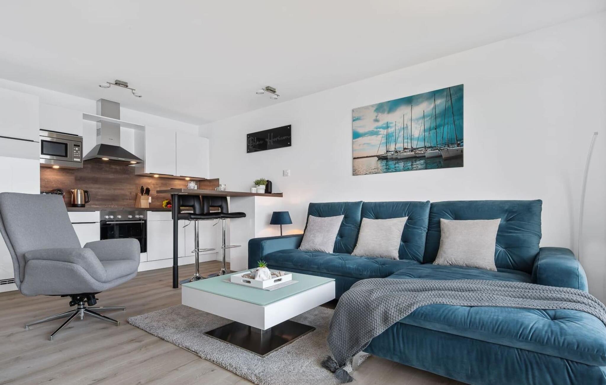 Die umfangreich ausgestattete offene Küche mit Bartresen lässt keine Wünsche offen. Hier lassen sich köstliche Urlaubsmahlzeiten zaubern. Der Balkon lädt zu einem Grillabend bei Wasserblick ein.