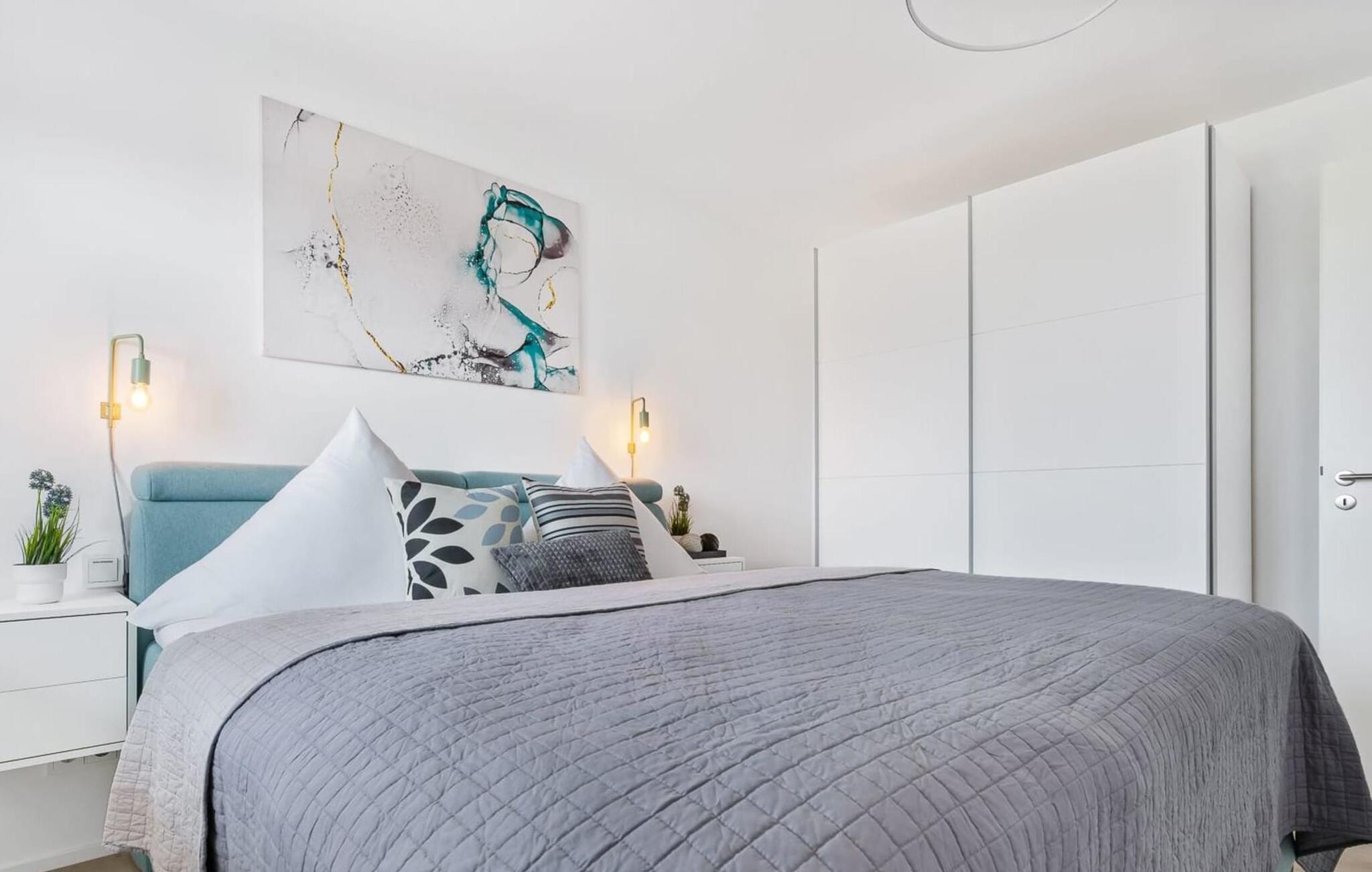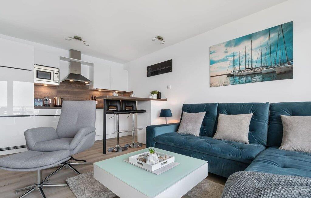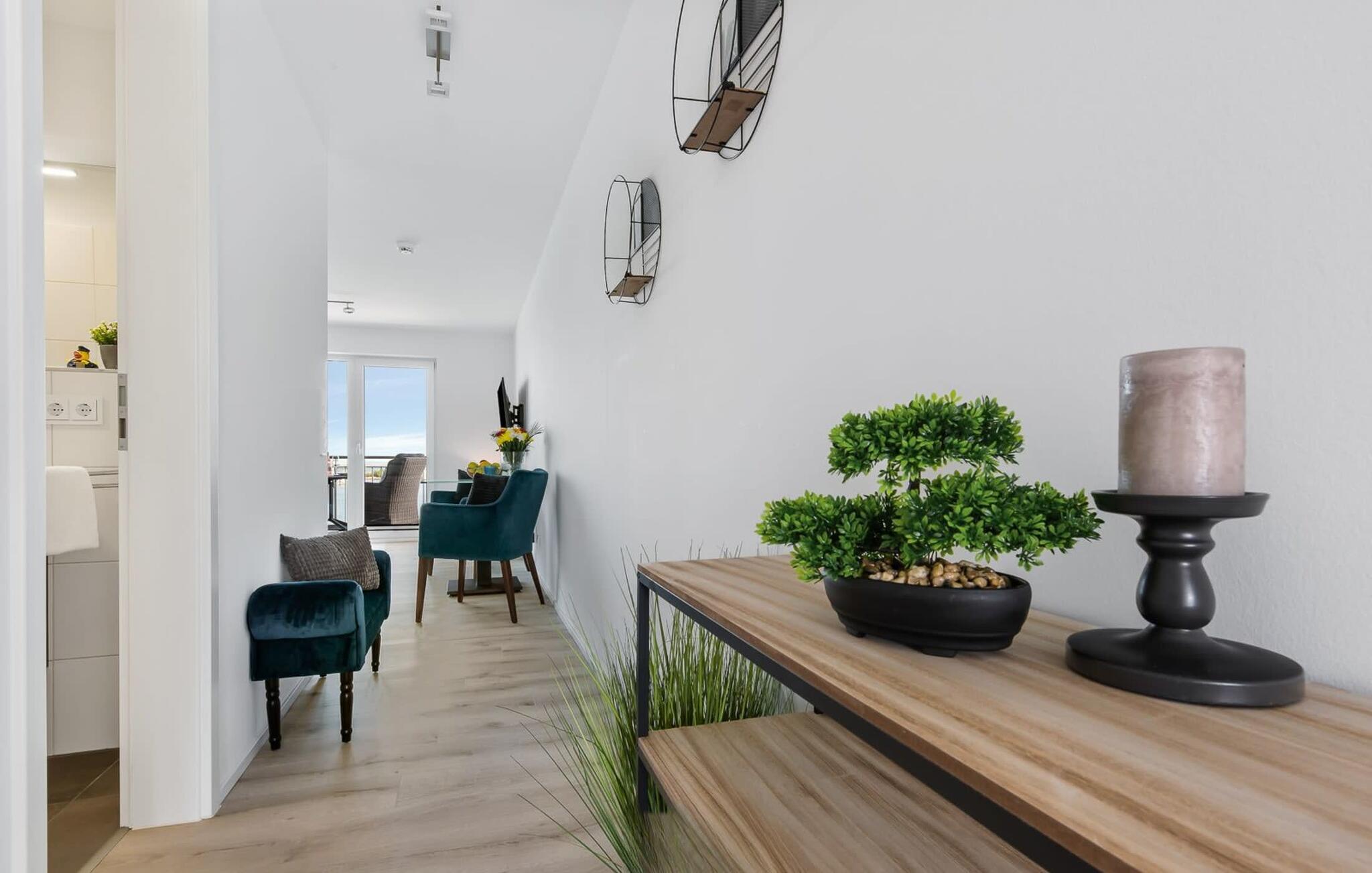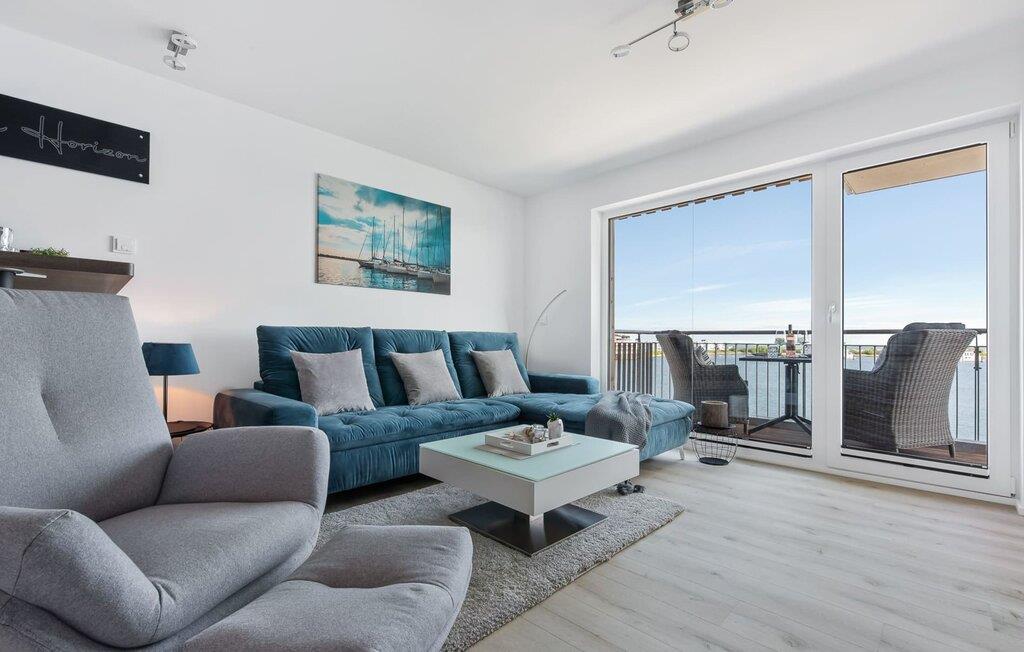 Die umfangreich ausgestattete offene Küche mit Bartresen lässt keine Wünsche offen. Hier lassen sich köstliche Urlaubsmahlzeiten zaubern. Der Balkon lädt zu einem Grillabend bei Wasserblick ein.