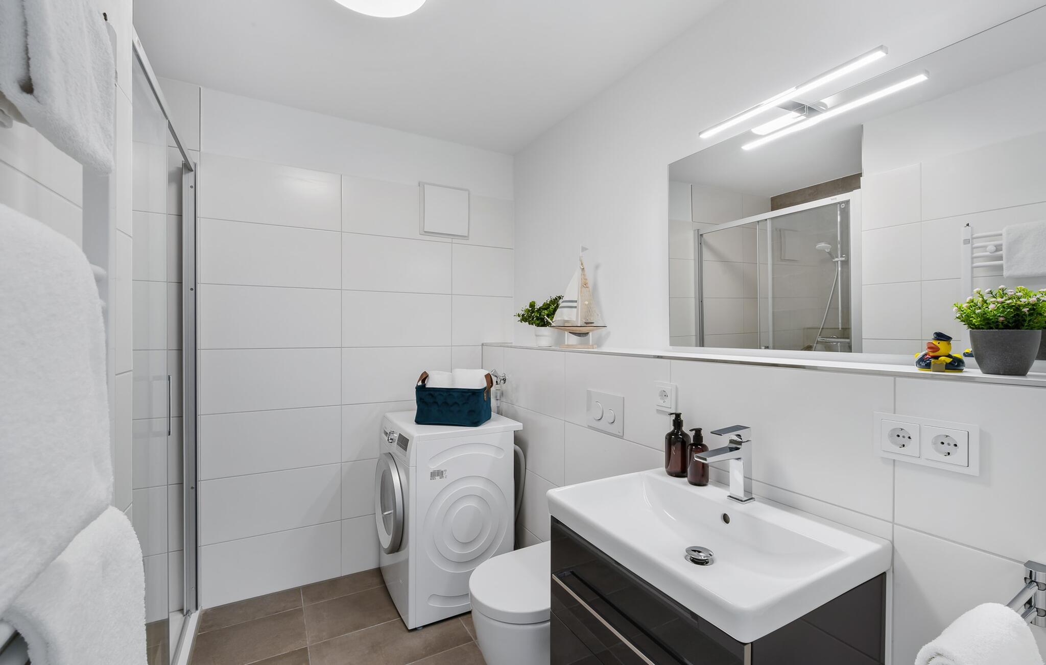Das Duschbad verfügt über eine große bodengleiche Dusche.