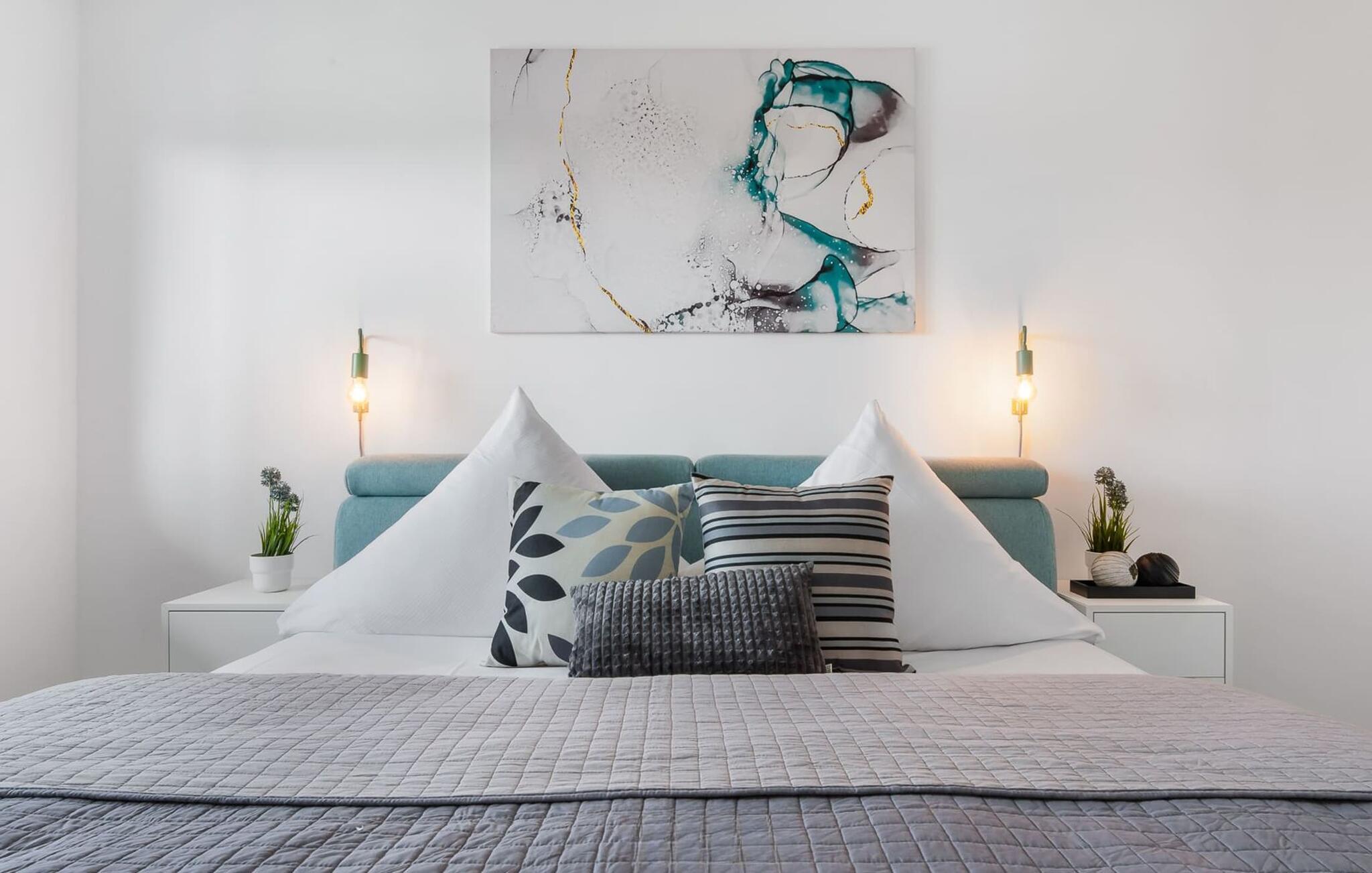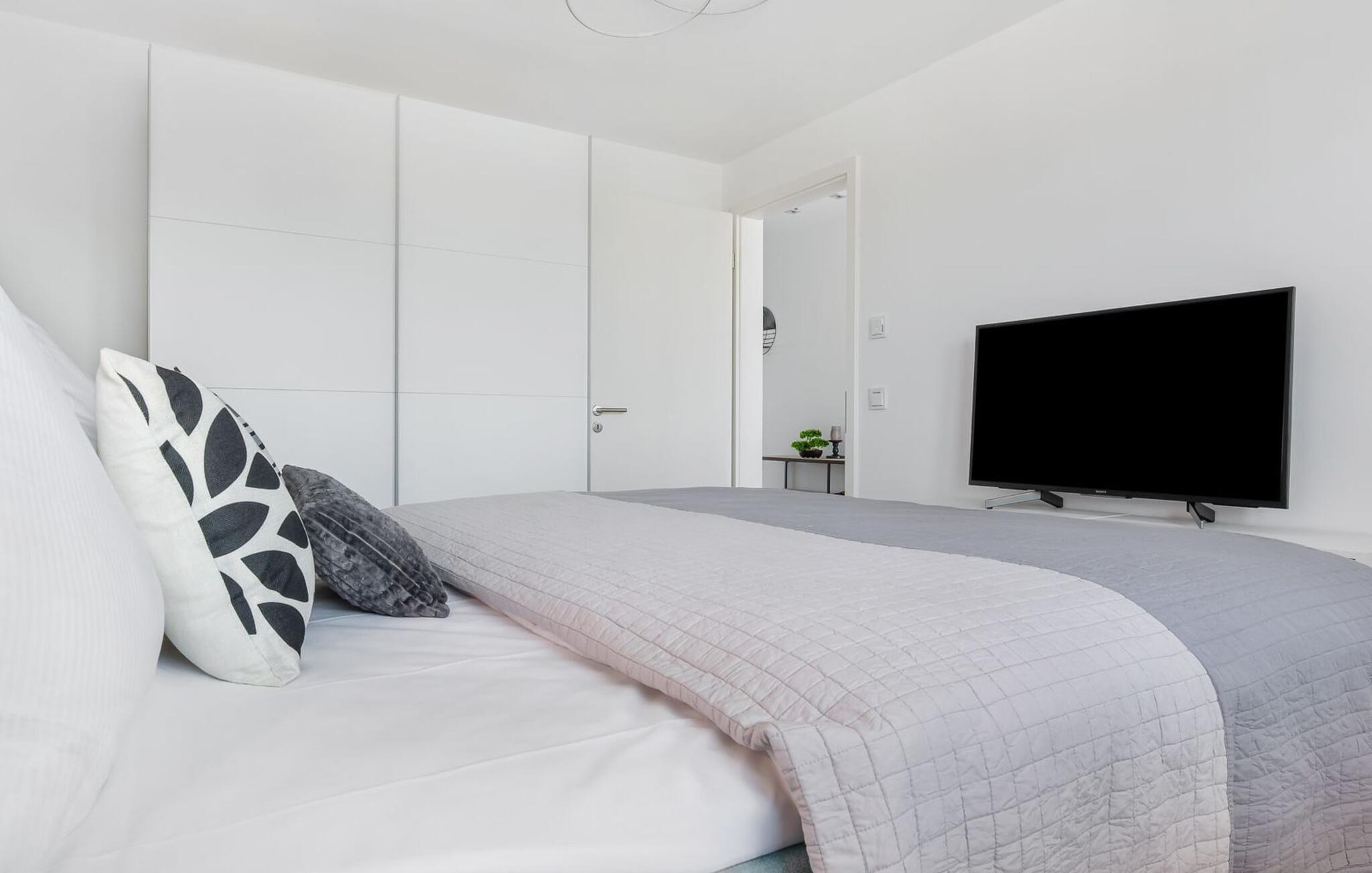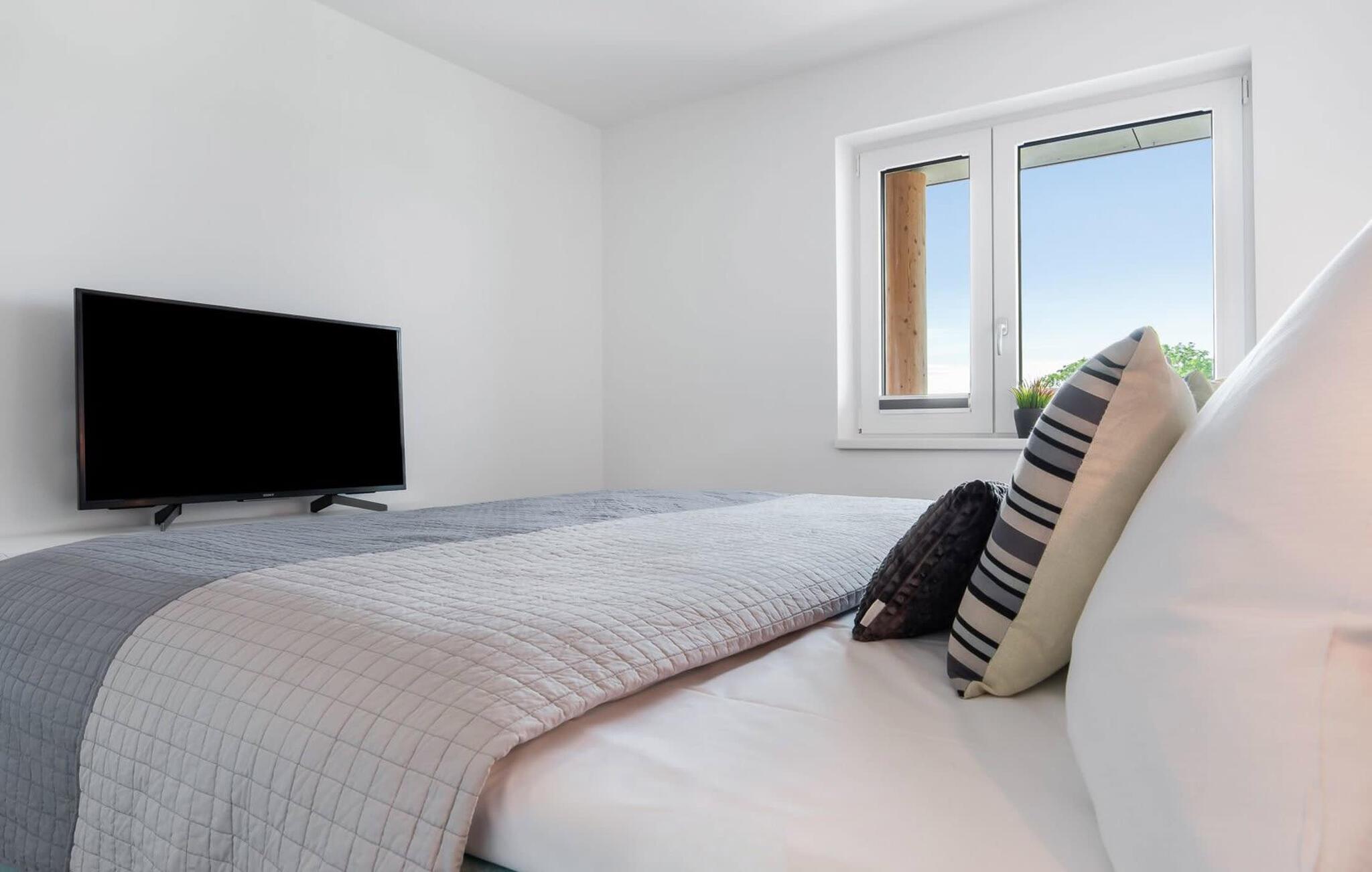 Erholsamen Urlaubsschlaf erlaubt das gemütliche Schlafzimmer, ausgestattet mit einem Doppel-Boxspringbett und einem zusätzlichen Flatscreen-TV.