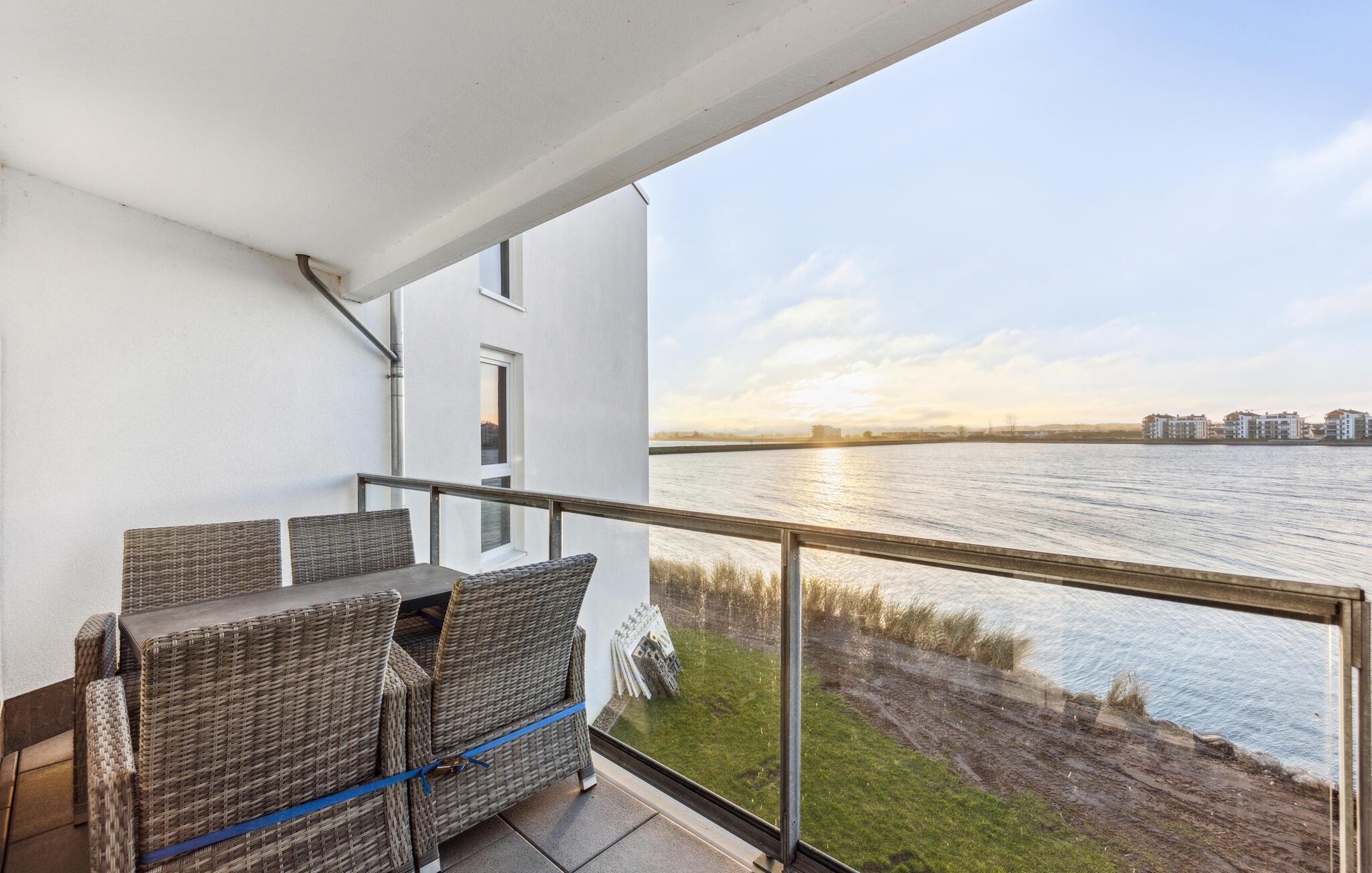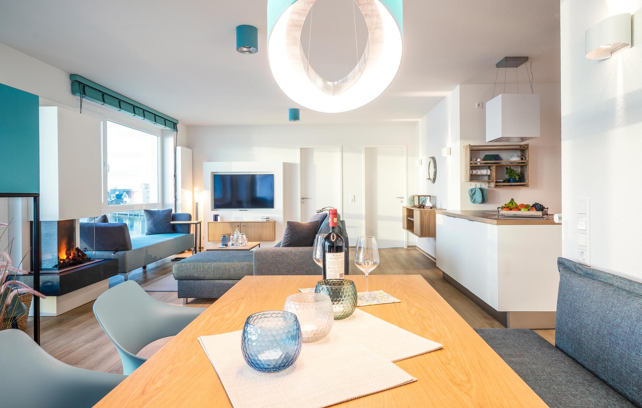 Genießen Sie Meerblick und Komfort in der stilvollen Ferienwohnung Blue Lagoon in Olpenitz, direkt am Wasser mit exklusivem Wellnessbereich.