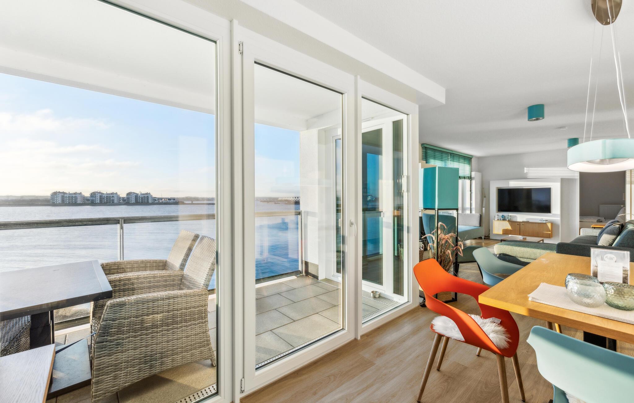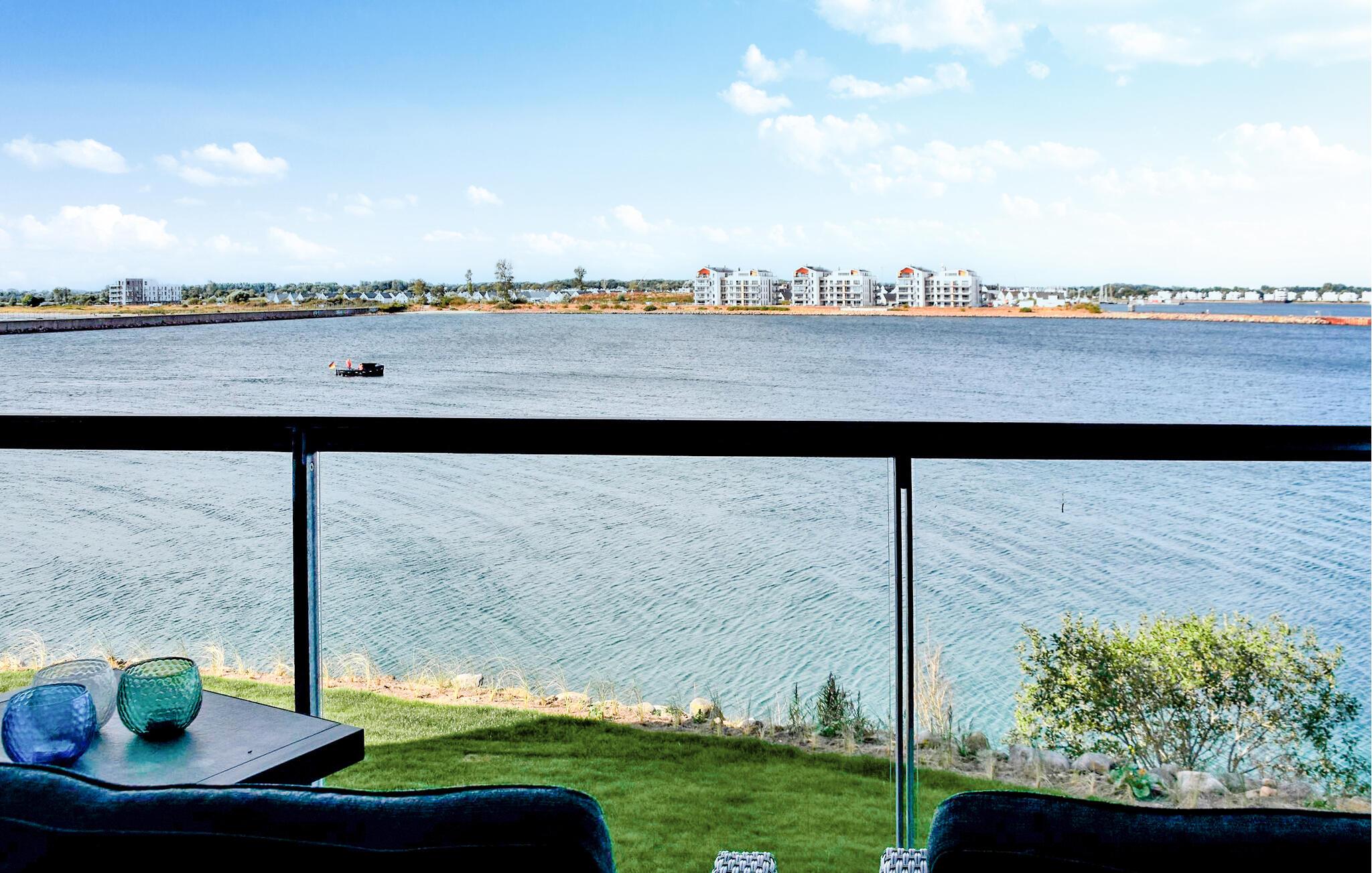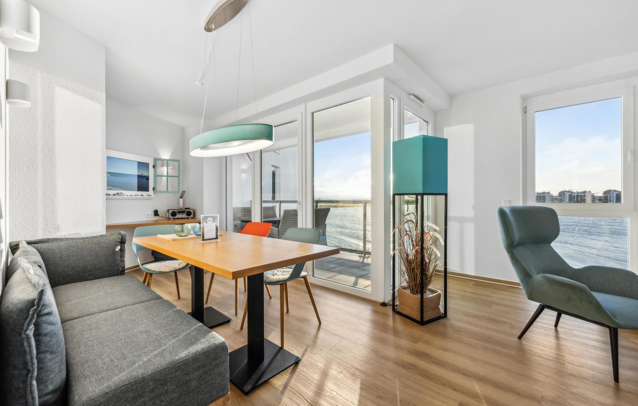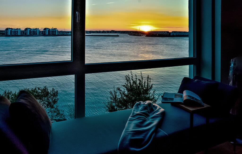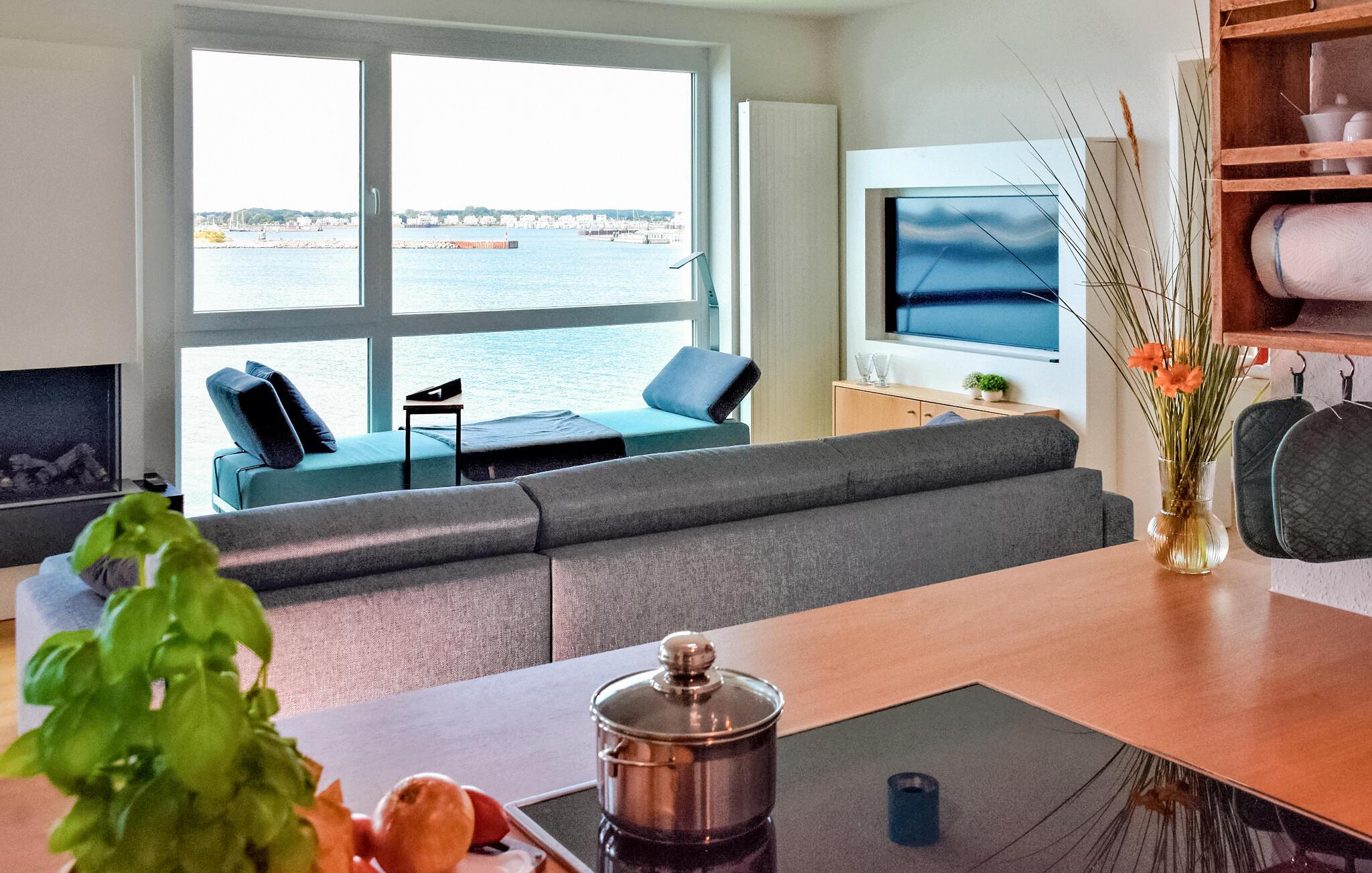 Durch die bodentiefen großen Fenster schweift der Blick über die Hafeneinfahrt, den Yachthafen, mit den vorbeisegelnden Booten, im Wasser tauchen die Kormorane und die Schweinswale ziehen oft mehrmals täglich ihre Runden.
