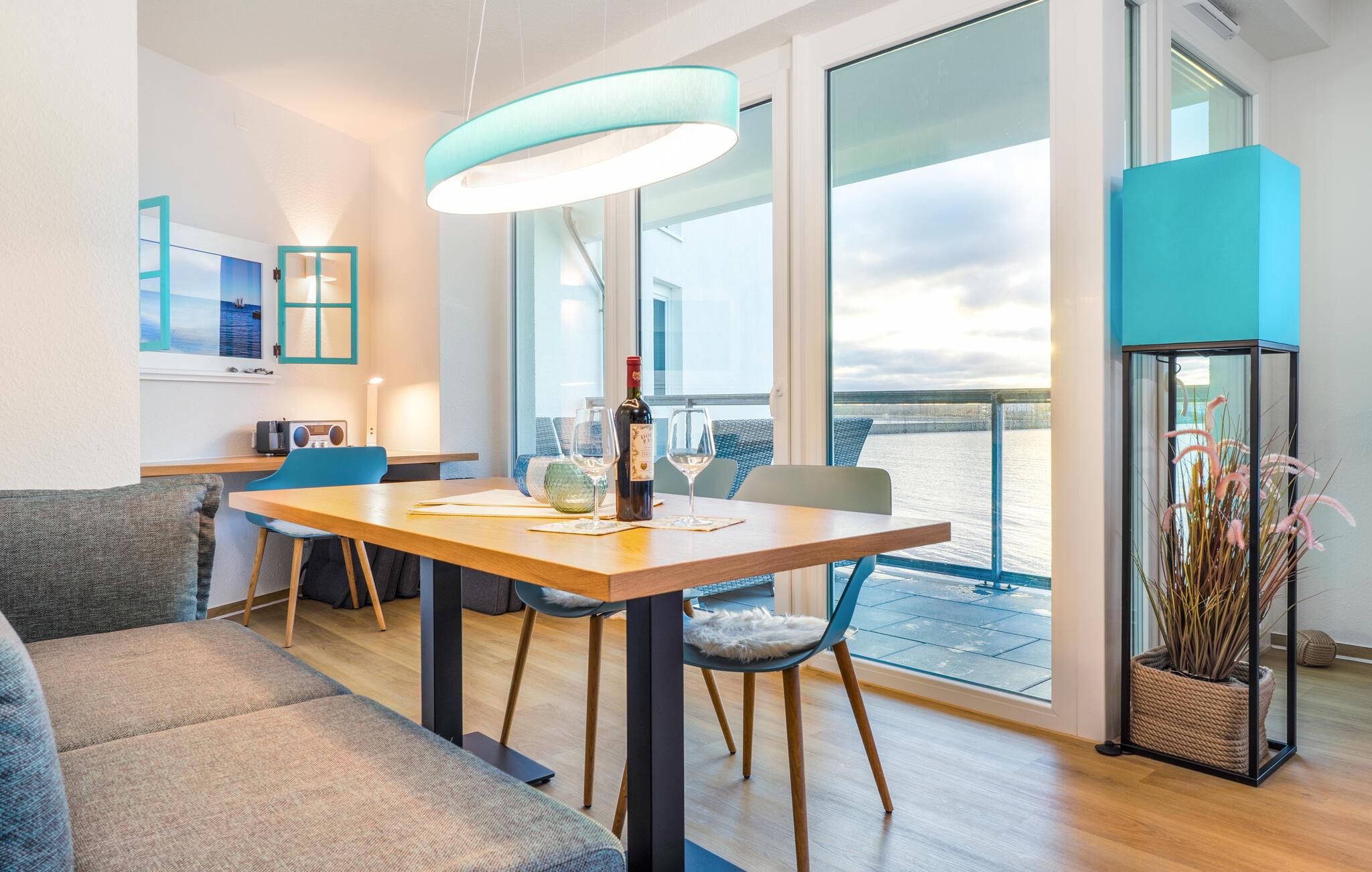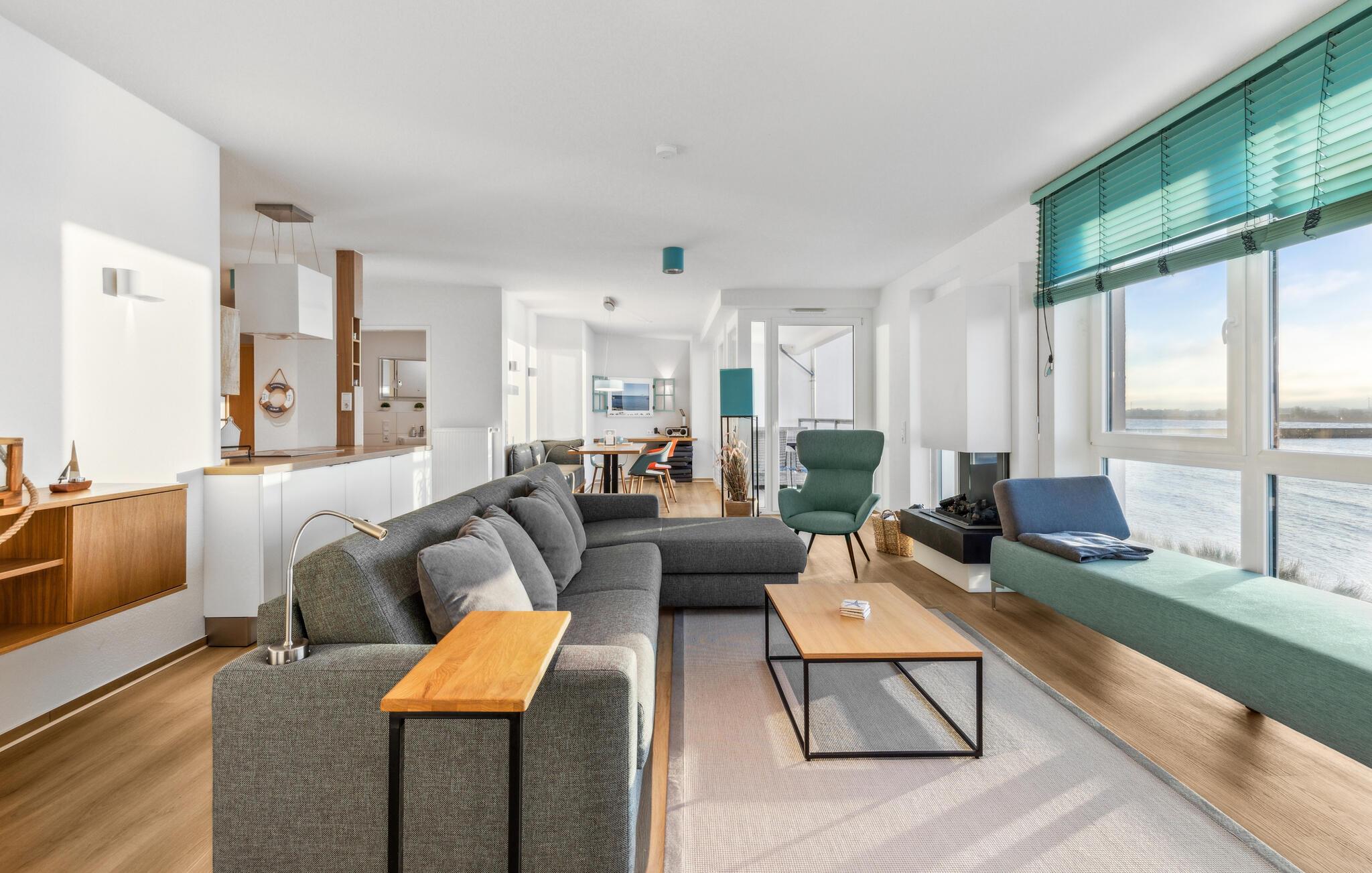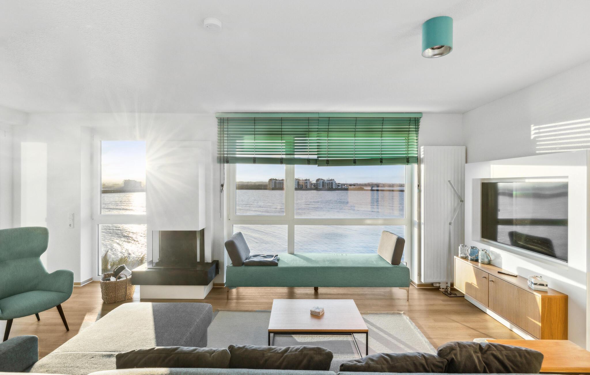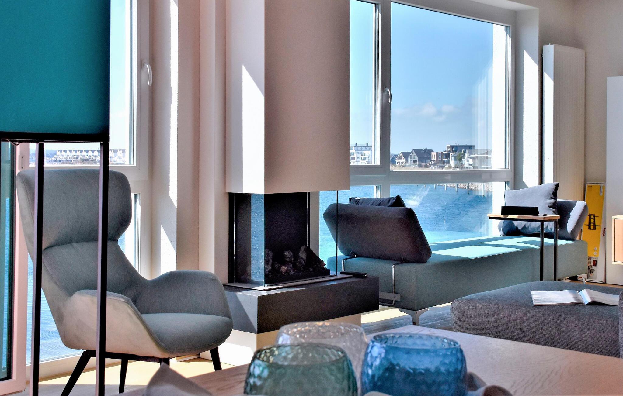 Durch die bodentiefen großen Fenster schweift der Blick über die Hafeneinfahrt, den Yachthafen, mit den vorbeisegelnden Booten, im Wasser tauchen die Kormorane und die Schweinswale ziehen oft mehrmals täglich ihre Runden.
