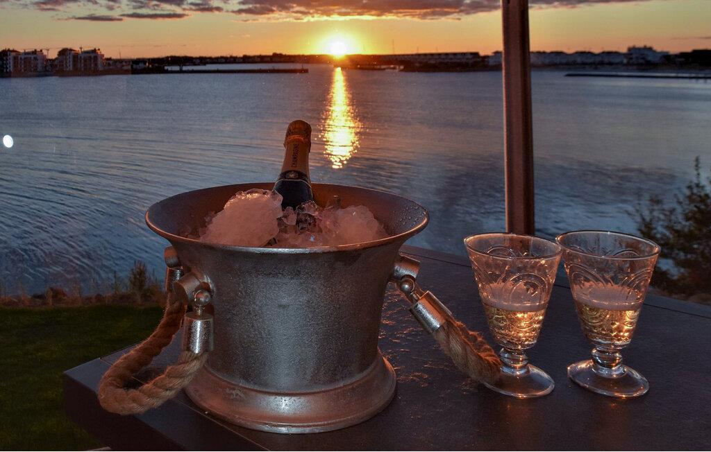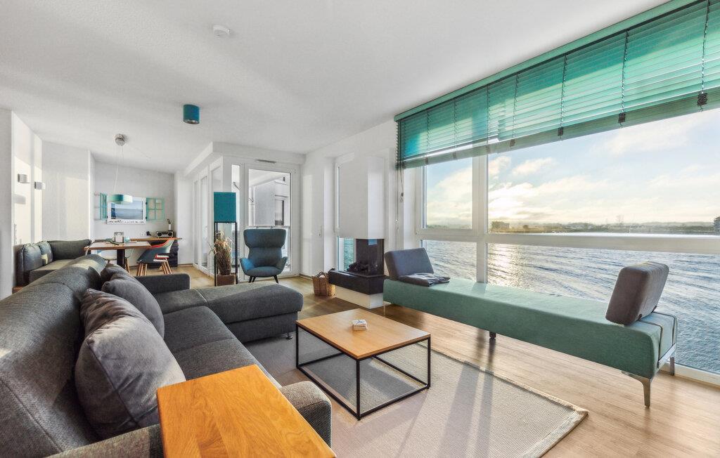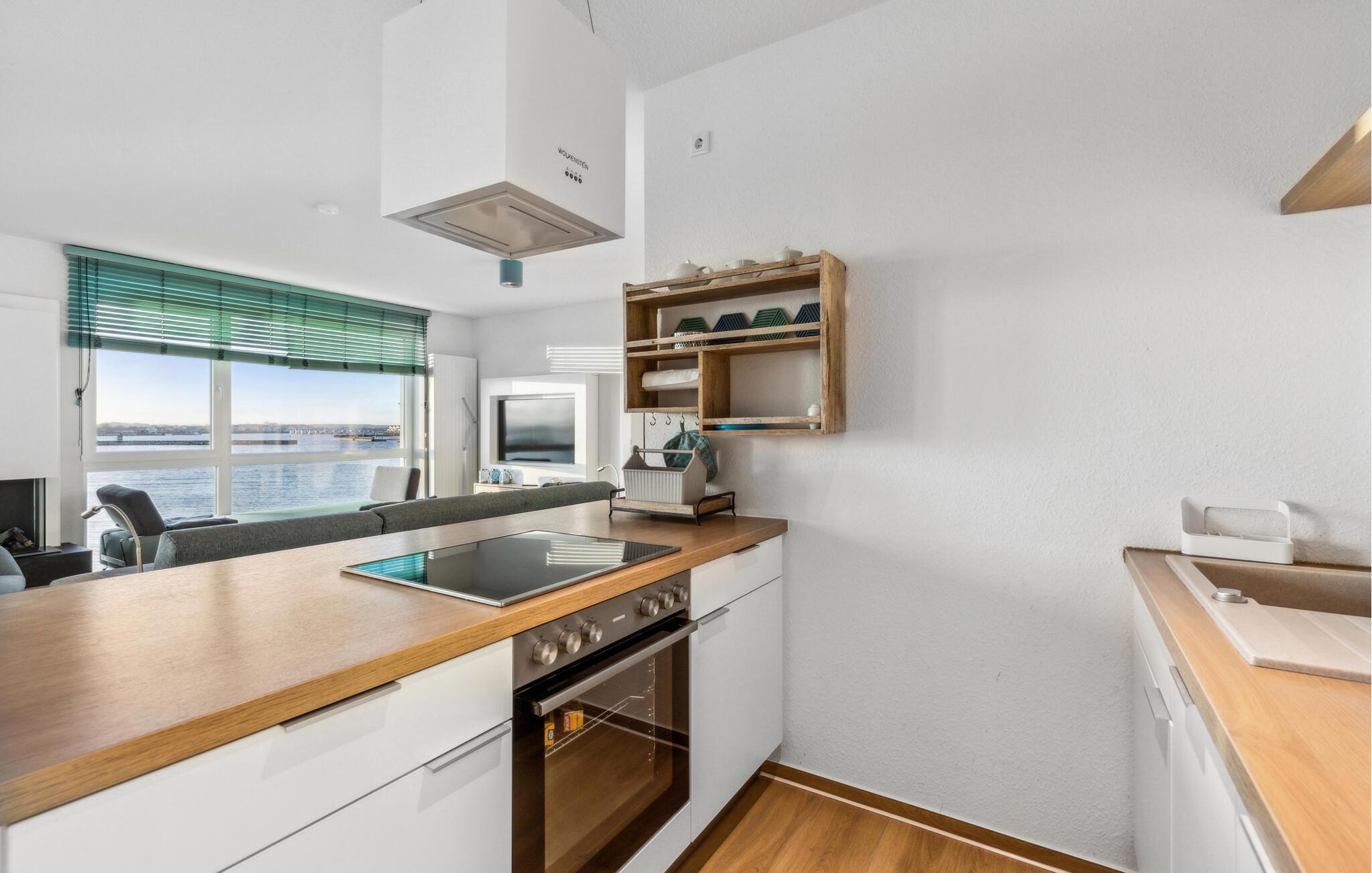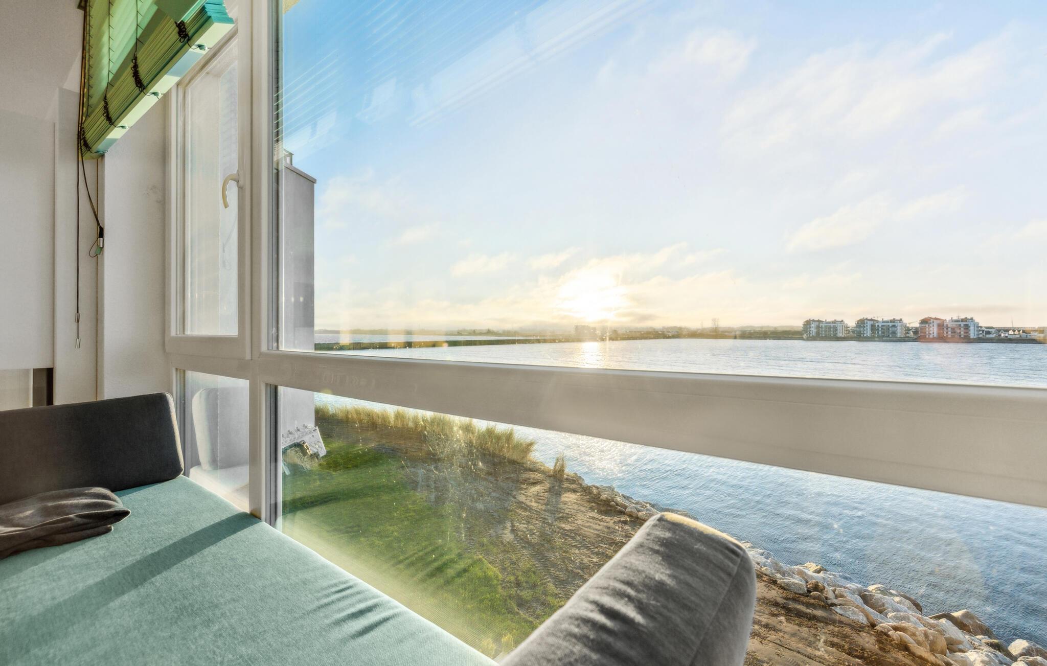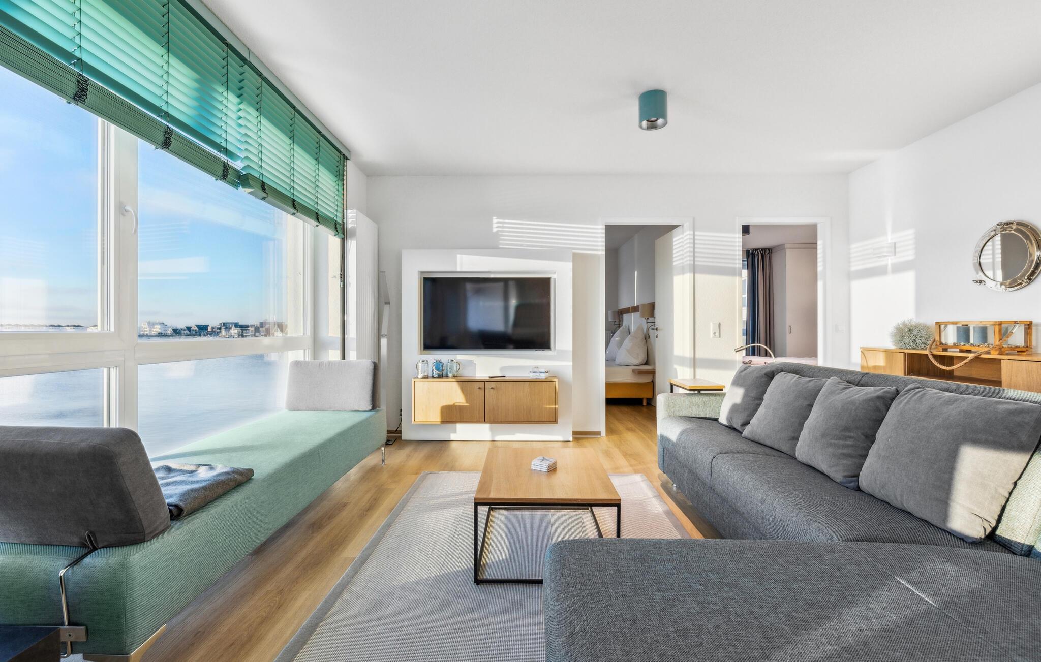 Durch die bodentiefen großen Fenster schweift der Blick über die Hafeneinfahrt, den Yachthafen, mit den vorbeisegelnden Booten, im Wasser tauchen die Kormorane und die Schweinswale ziehen oft mehrmals täglich ihre Runden.