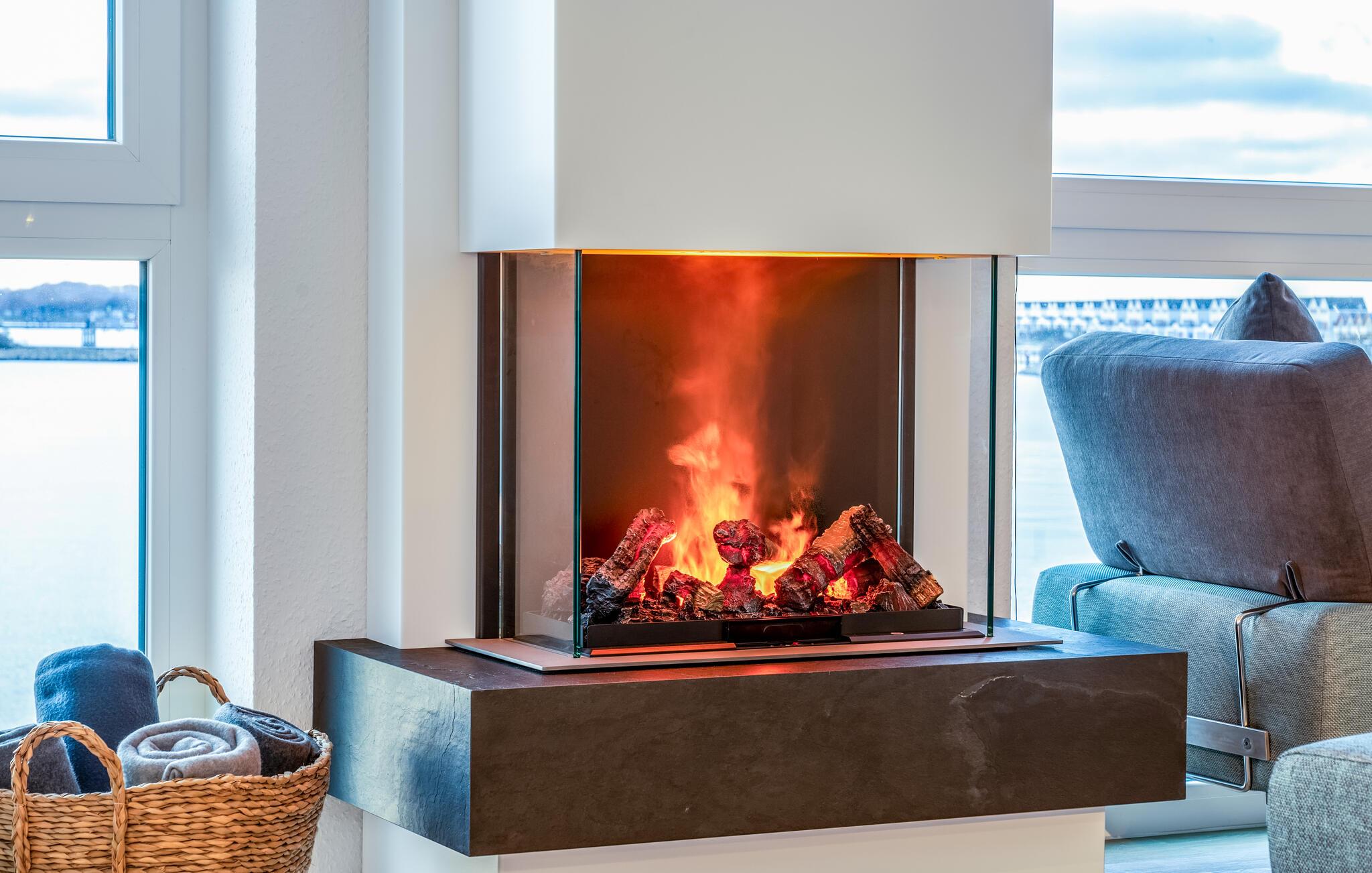 An Winterabenden genießt man den Panoramablick mit den grandiosen Sonnenuntergängen gerne vom gemütlichen Platz am Kamin.