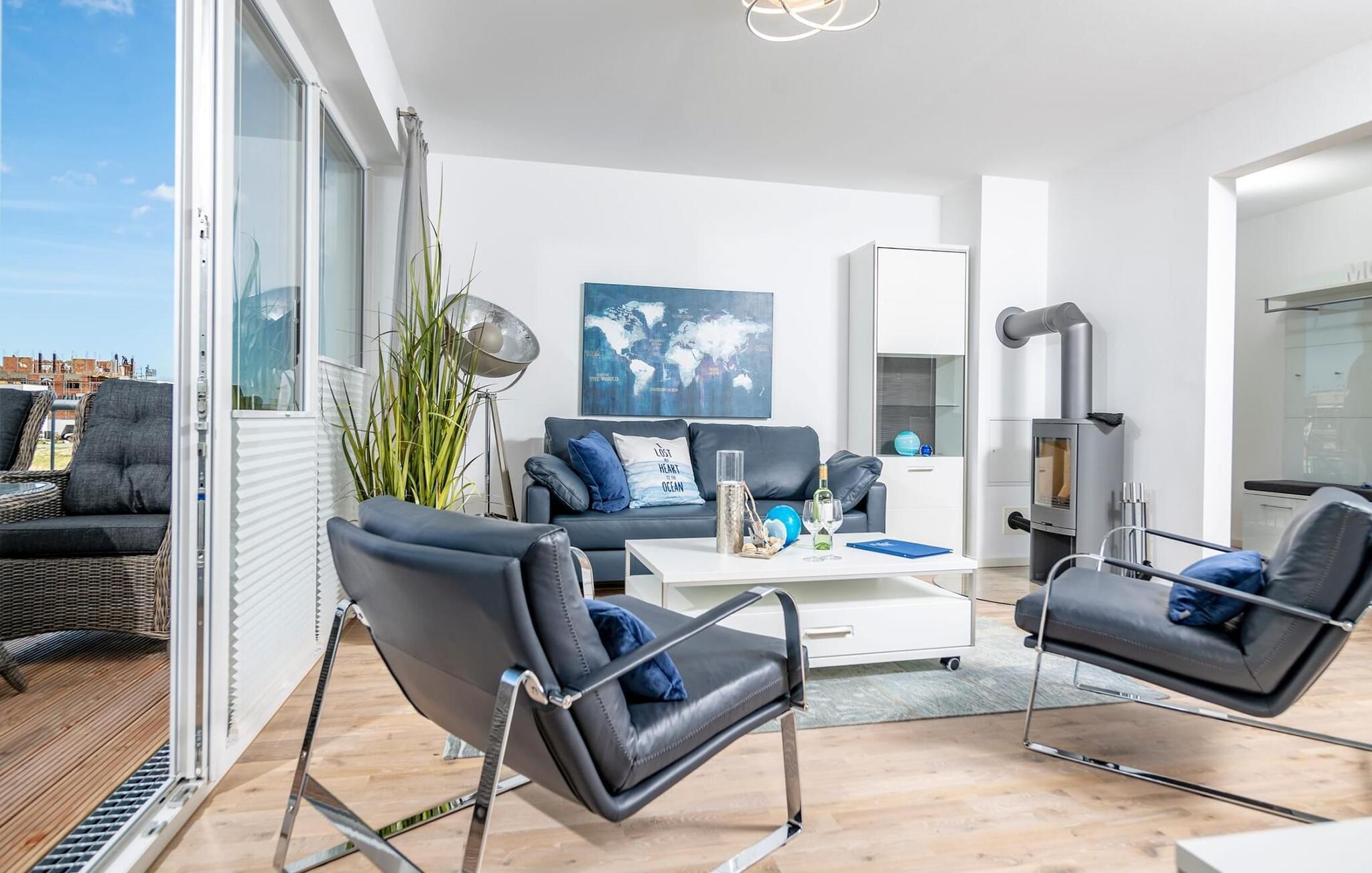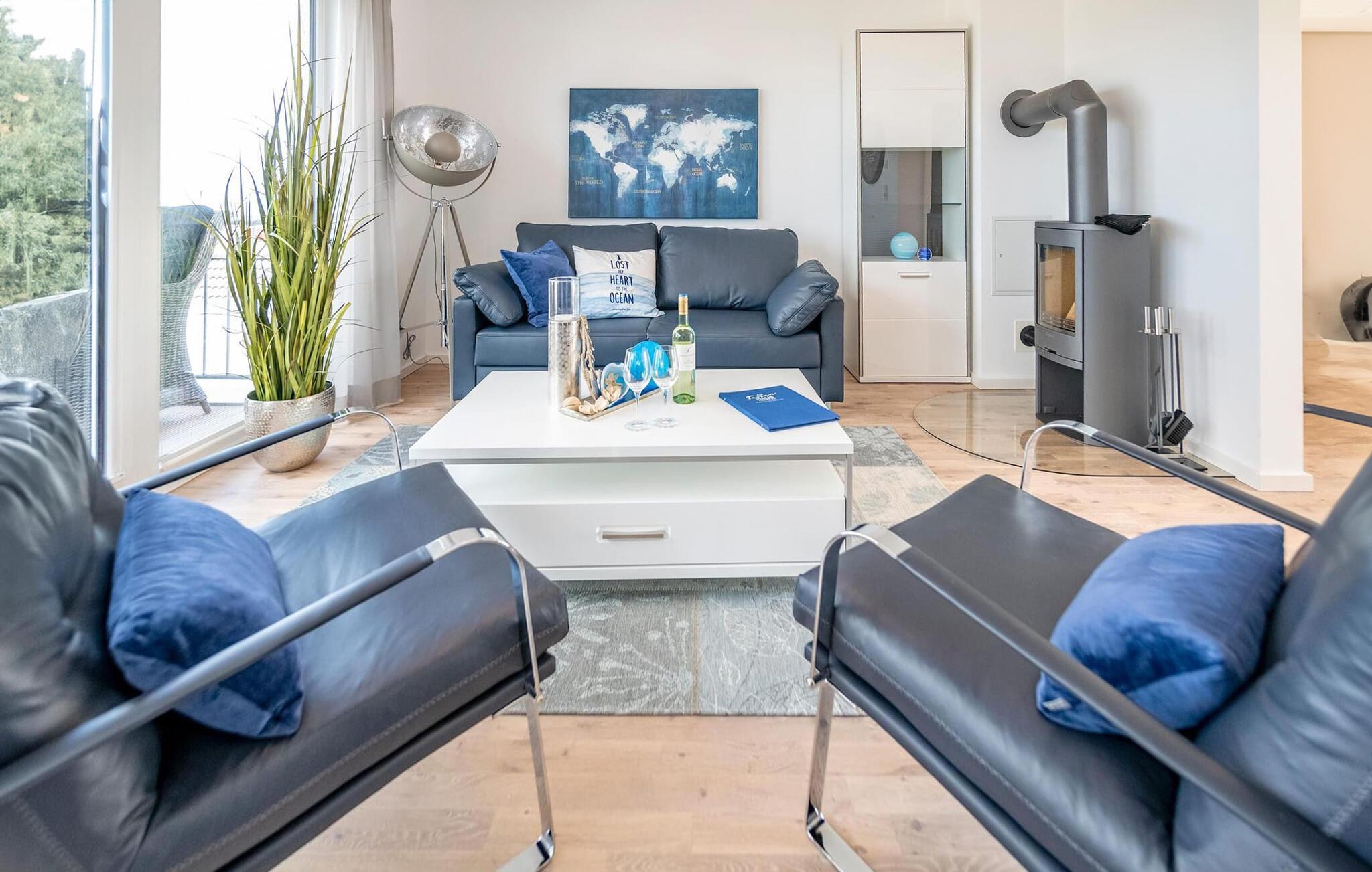 Kuschelig wird es im Wohnzimmer, denn hier lädt eine gemütliche Sitzlandschaft an Schietwettertagen zu einem Kaminabend ein.