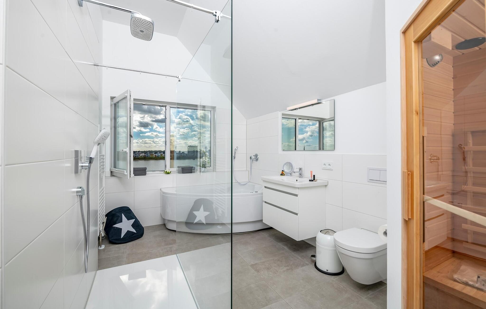 Der private Wellnessbereich lädt zum entspannen ein: Eine Infrarot-Sauna (Wärmekabine) mit Hifi-Sound-System und LED-Farblichttherapie sowie eine große Whirlpool-Badewanne mit Meerblick stehen nach dem Strandspaziergang zum Entspannen bereit.