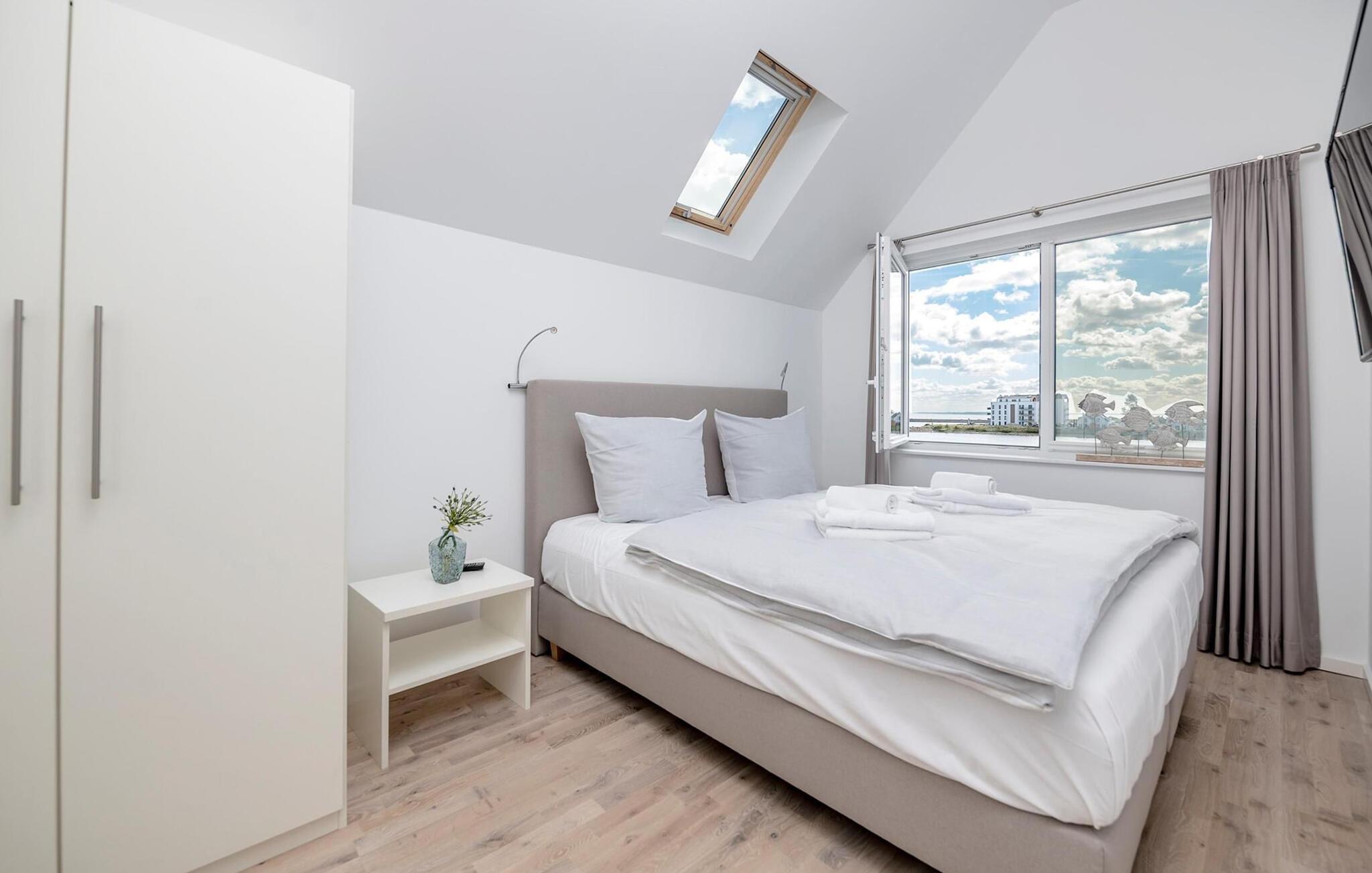 Auf der zweiten Ebene befindet sich der Ruhebereich des Ferienobjekts. Das Hauptschlafzimmer verfügt über einen traumhaften Hafenblick. Einschlafen unter Sternen, ein Dachfenster erlaubt nicht nur den Blick in den Sternenhimmel, sondern auch in traumhafte Wolkenformationen, die so charakteristisch sind für den Norden. Ein weiterer Schlafplatz (1,45x1,50 m) befindet sich auf dem Schlafsofa und ist ausschließlich für ein Kind geeignet.