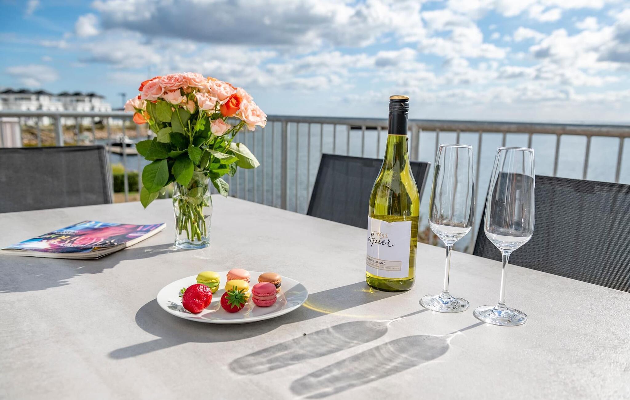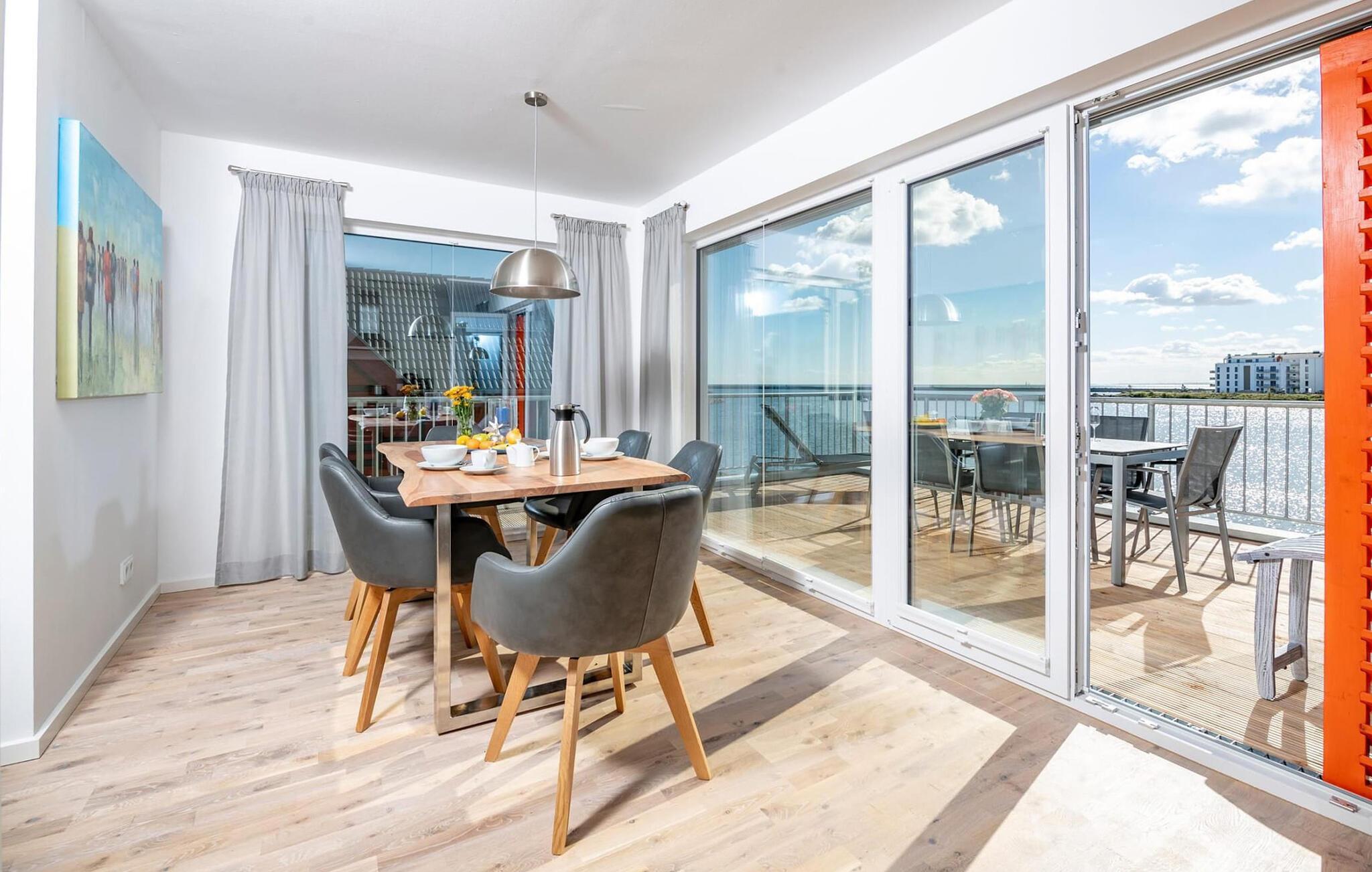 Lichtdurchflutet gestaltet sich der Wohn- und Essbereich des Ferienobjekts mit bodentiefen Panorama-Fensterfronten zu den anliegenden Terrassen auf beiden Seiten. Traumhafte Aussichten eröffnen sich auf der an den Essbereich angrenzenden Terrasse mit Blick über den Segel- und Sportboothafen des OstseeResort Olpenitz. Ob romantisches Candle-Light-Dinner oder gesellige Grillrunde. Hafenkino und traumhafte Sonnenansichten sind garantiert. Der Wohnbereich erlaubt den Blick auf den Ostseefjord Schlei.