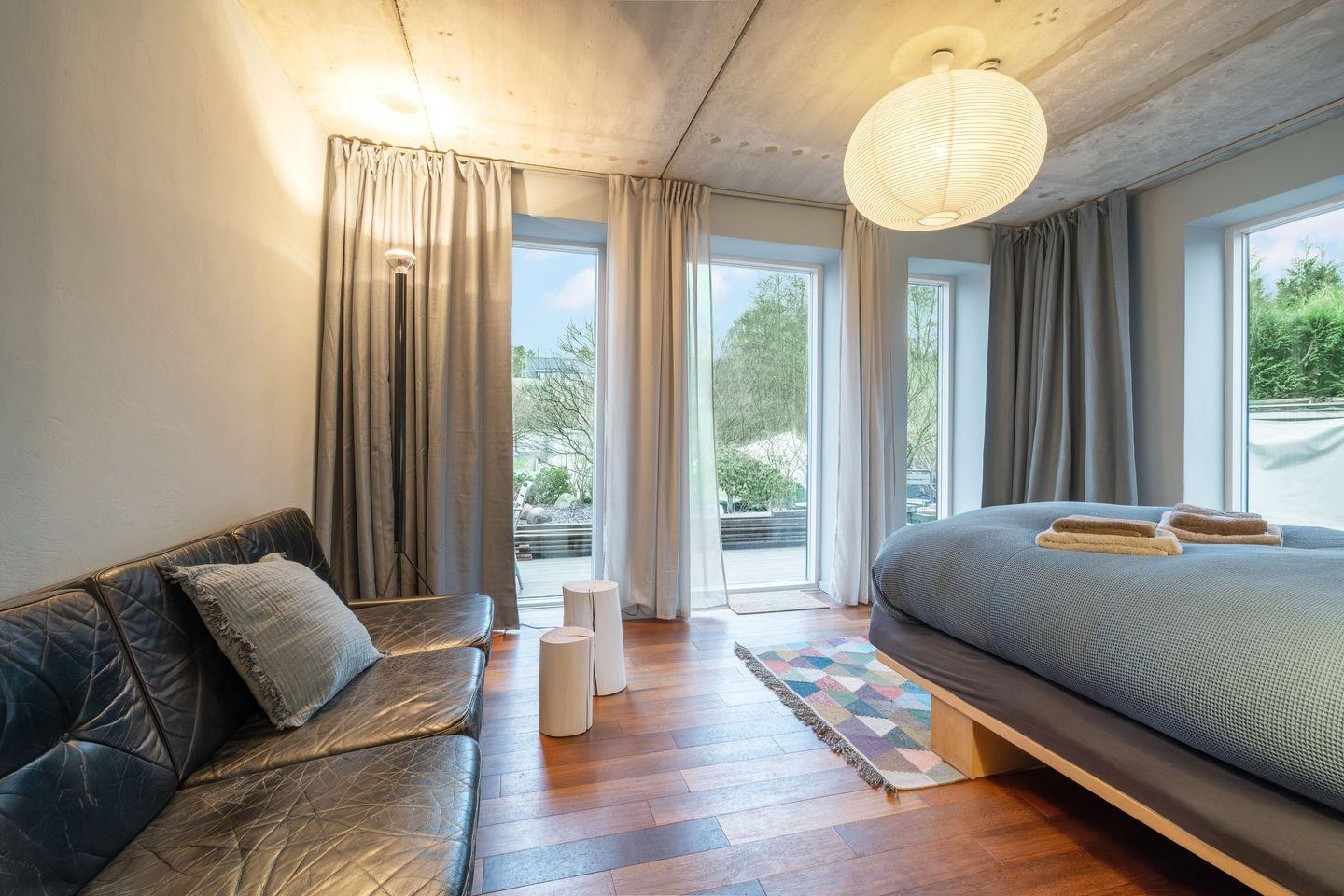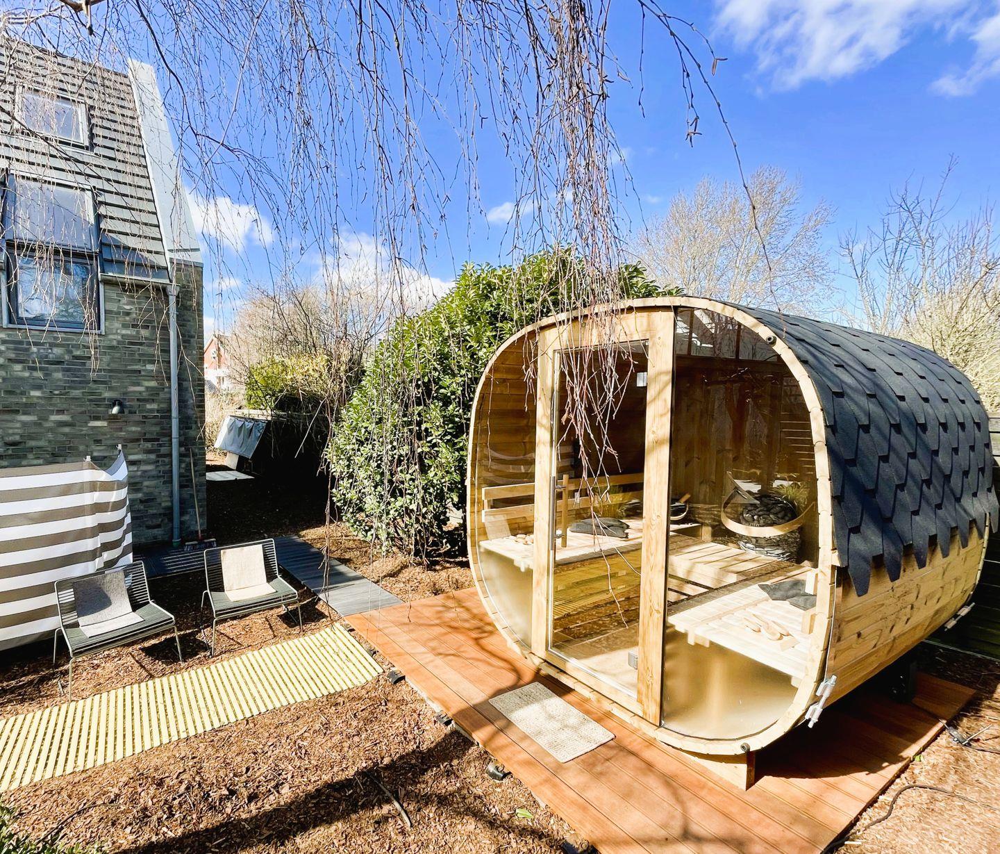 Die moderne Gartensauna mit Panoramafenster und Außendusche rundet das Angebot des Hauses ab und hält private Wohlfühlmomente zu jeder Jahreszeit bereit.