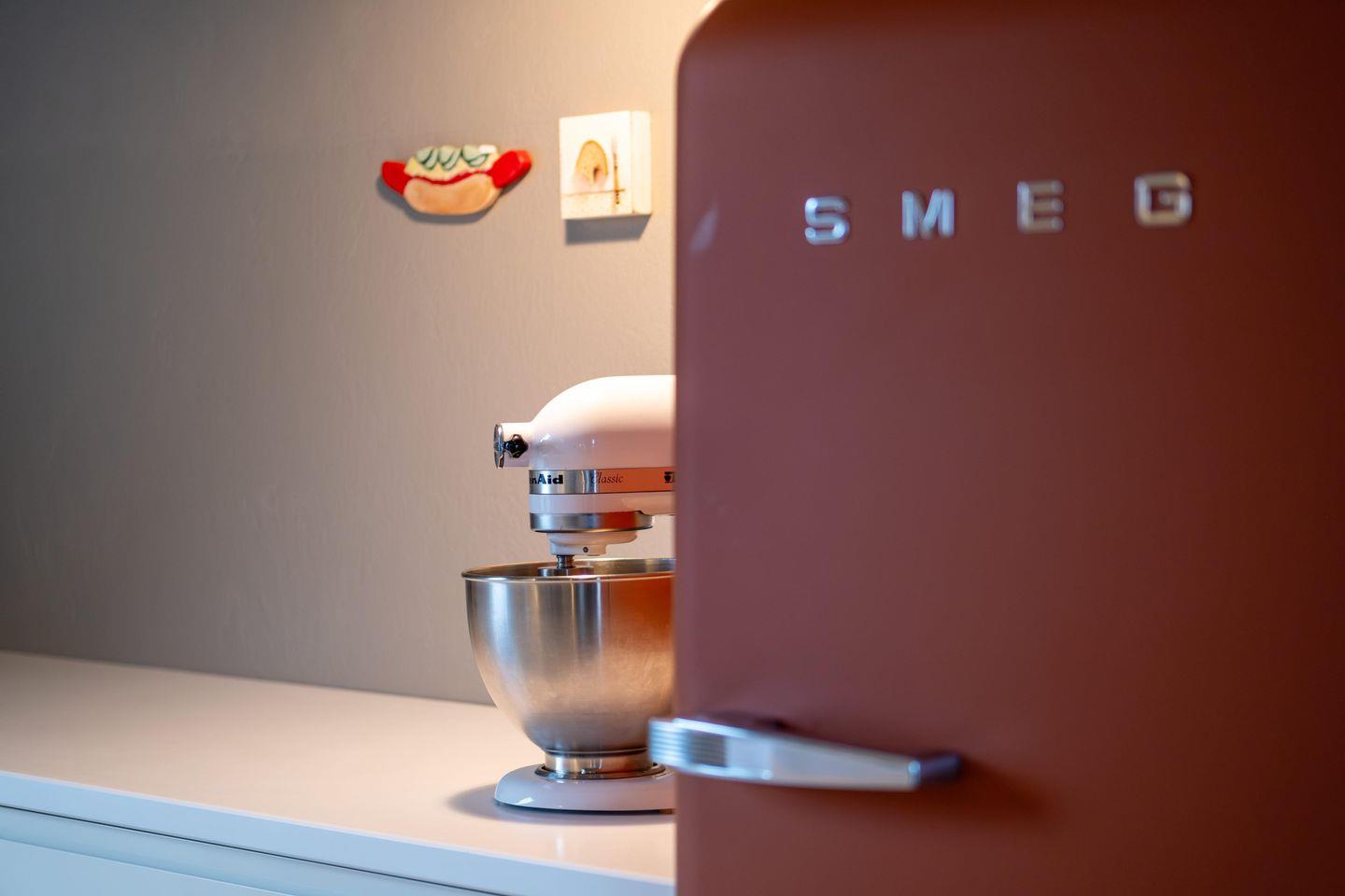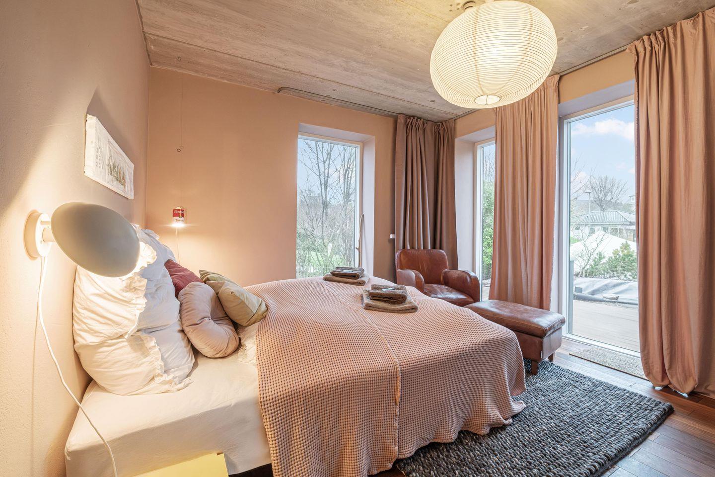 Im Erdgeschoss befinden sich die beiden Schlafzimmer mit komfortablen Doppelbetten und jeweils mit Terrassenzugang. Im blauen Schlafzimmer ist die Matratze 140 x 200 cm und im rosa Schlafzimmer 160 x 200 cm. Außerdem liegt im EG das außergewöhnliche Badezimmer mit gusseiserner Badewanne und Glas-Stein-Dusche – ein echter Hingucker. Bad und Schlafzimmer liegen gegenüber von einander und sind mit stylischen Holzschiebetüren (Achtung: hellhörig) ausgestattet.