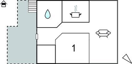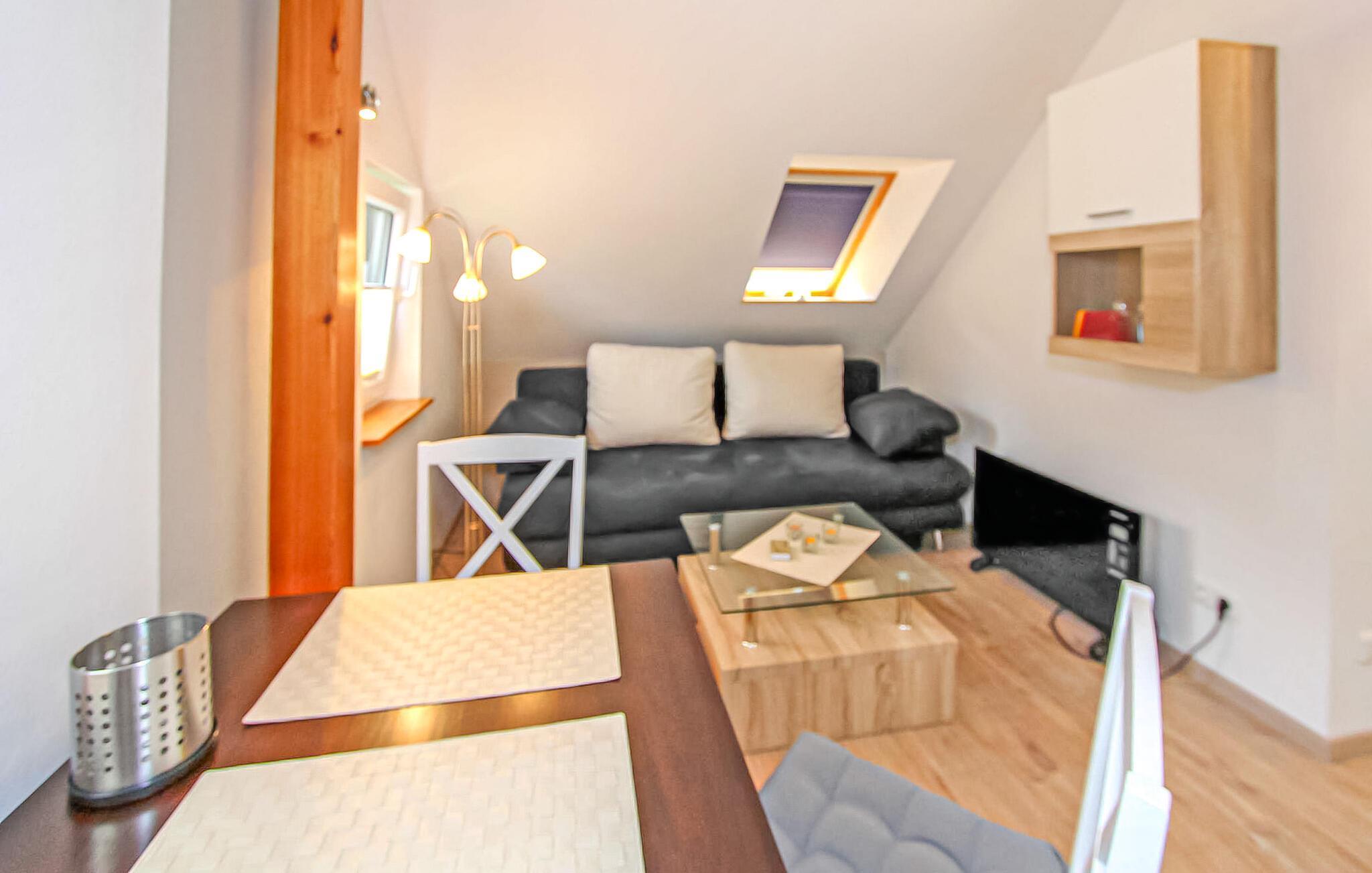 Diese 37 qm große Zweiraum-Ferienwohnung für max. 2 Personen befindet sich im Obergeschoss des Ferienhauses. Zugang über separate Außentreppe. Sie ist ausgestattet mit einem Wohnraum (Polstermöbel, Flachbild-TV), einer offenen Küchenzeile (E-Herd mit Backofen, Kühlschrank mit Tiefkühlteil, div. Küchengeräte), einem Schlafraum (Doppelbett, 1,40 m breit), sowie einem kleinen Bad mit DU/WC.
