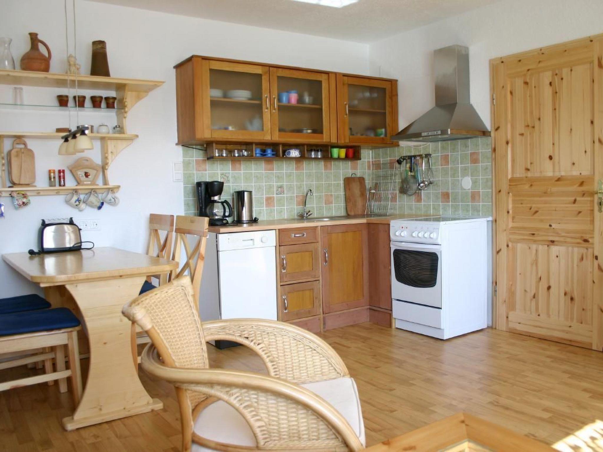 Die circa 49 Quadratmeter große Wohnung verfügt über ein großes Wohnzimmer mit integriertem Küchenbereich, ausgestattet mit Ceranfeldherd, Backofen, Kühlschrank mit Gefrierfach, Geschirrspüler, Kaffemaschine, Mikrowelle, Toaster, Wasserkocher sowie notwendigen Küchenutensilien. Des Weiteren bietet die Wohnung ein geräumiges Elternschlafzimmer mit ausreichend Stauraum, ein Kinderschlafzimmer mit einem neuen rustikalen Etagenbett, in dem auch Erwachsene bequem schlafen können, und ein Duschbad. Für Unterhaltung sorgen ein Flachbildschirm und eine Stereoanlage.