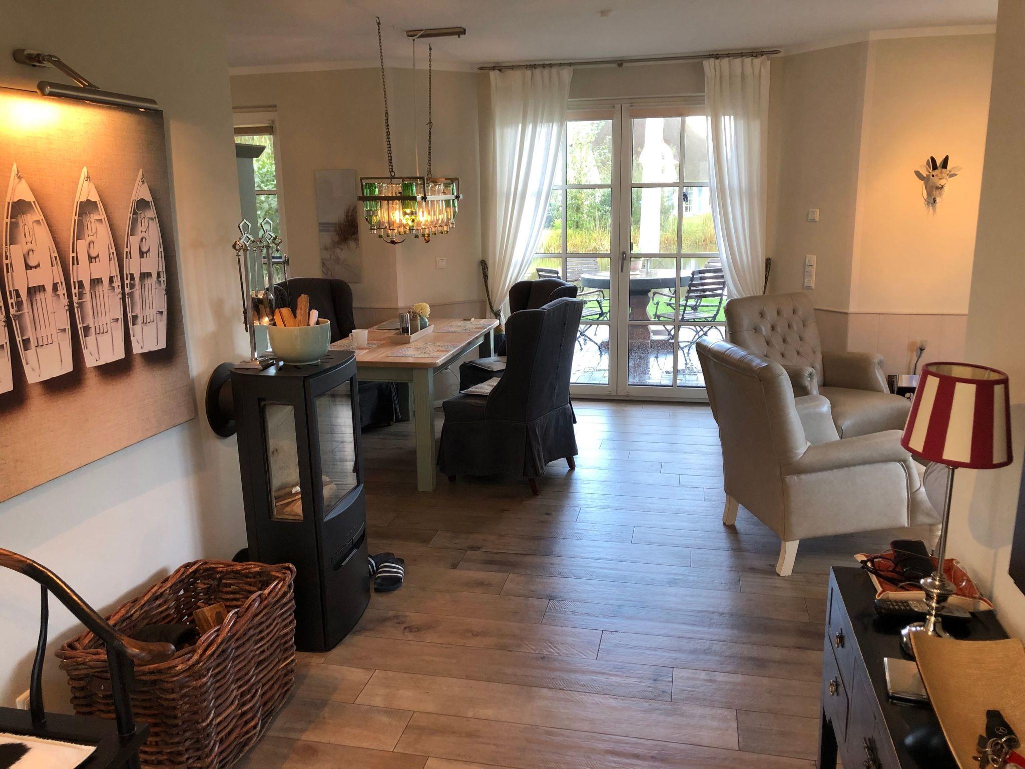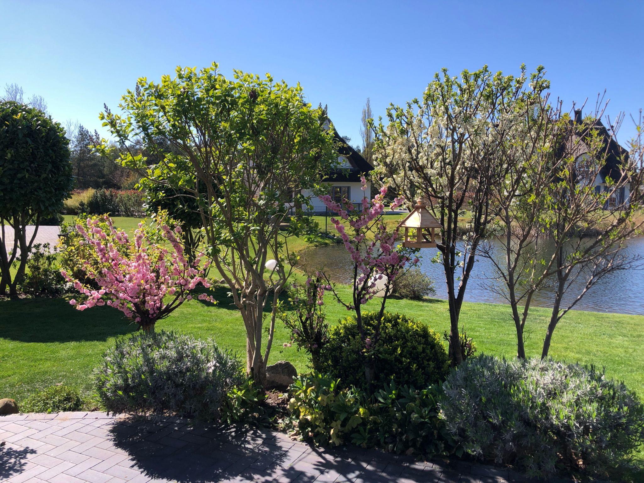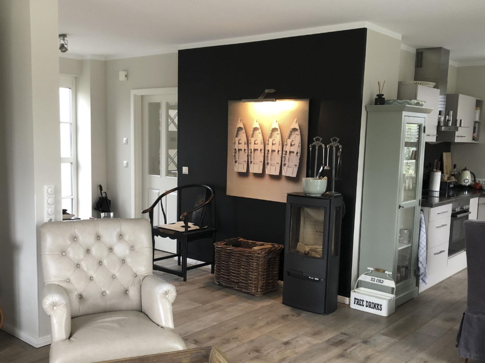 Die hochwertige Einrichtung im Landhausstil und der herrliche Garten am großen Teich, lassen Ihren Urlaub sofort beginnen. Im Erdgeschoss erwartet Sie ein großzügiger Wohn-Essbereich mit voll ausgestatteter Einbauküche, Esstisch mit Blick aufs Wasser, Sitzecke mit Flachbild-TV, Musikanlage mit iPad und kostenlosen WLAN-Internet-Zugang über Glasfasernetz. Das Haus ist mit 5 *****, der höchst möglichen Auszeichnung des DTV ausgezeichnet. Dies bedeutet eine erstklassige Ausstattung mit exklusivem Komfort sowie ein großzügiges Angebot in hervorragender Qualität und gepflegtem außergewöhnlichem Gesamteindruck. Eine Fußbodenheizung im ganzen Haus, Gäste-WC, Garderobe und Hauswirtschaftsraum mit Waschmaschine gehören zur Ausstattung. Ein Kaminofen sorgt für eine wohlige und stimmungsvolle Atmosphäre auch an kühlen Tagen. Das Holz für die Erstbefeuerung stellen wir Ihnen gerne zur Verfügung, Mehrbedarf ergänzen Sie bitte. Für einen erholsamen Schlaf befinden sich im Obergeschoss zwei Schlafzimmer mit komfortablen Boxspringbetten. Im großen Bad mit ebenerdiger großer Dusche und Eckbadewanne genießen Sie die finnische Sauna. Gerne können Sie Ihren Hund mitbringen, vorzugsweise gut erzogen. Die Mitnahme von mehreren Hunden wird hingegen nicht erlaubt, auch Katzen sind nicht gestattet. .