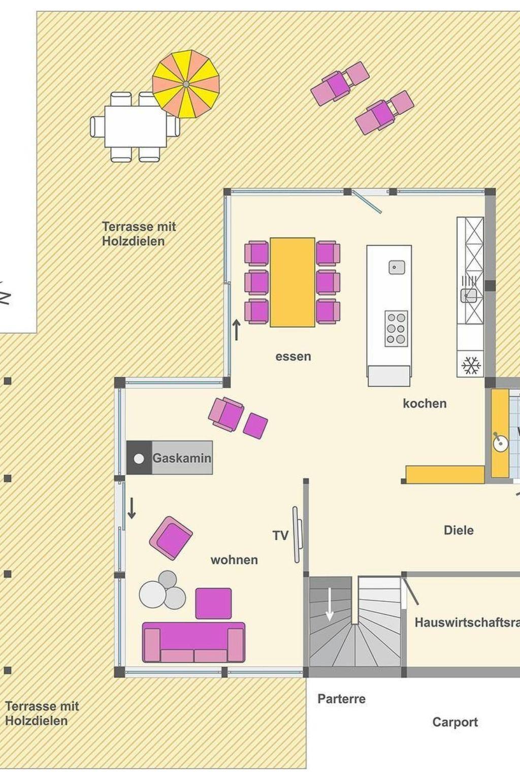 Das EG teilt sich auf mit 84 m² Wohnküche, Gäste-WC, Diele, HWR, Wohnen, Kochen und Essen. Die umlaufende Bankiraiterrasse hat eine Fläche von über 100m². Je nach Jahreszeit findet man ein gemütliches Plätzchen zum verweilen.