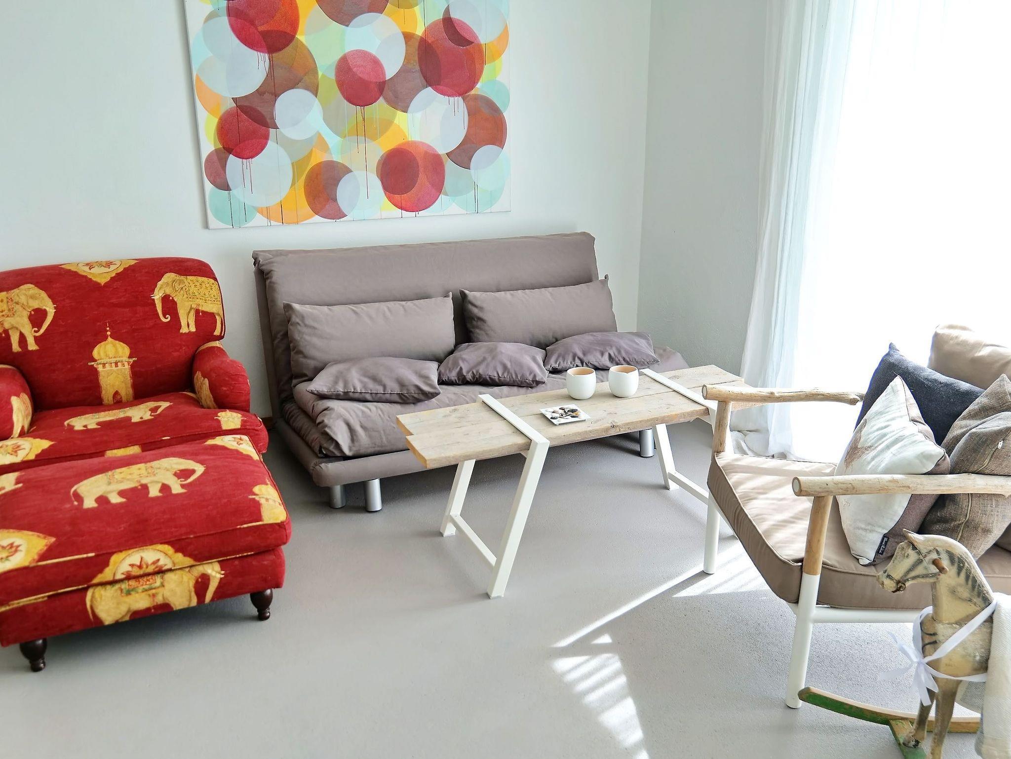 Sofa (umfunktionierbar zur Schlafcouch), Fernsehsessel mit Hocker, 2 Stühle, TV, Hifi-Anlage, Essbereich für 4 Personen