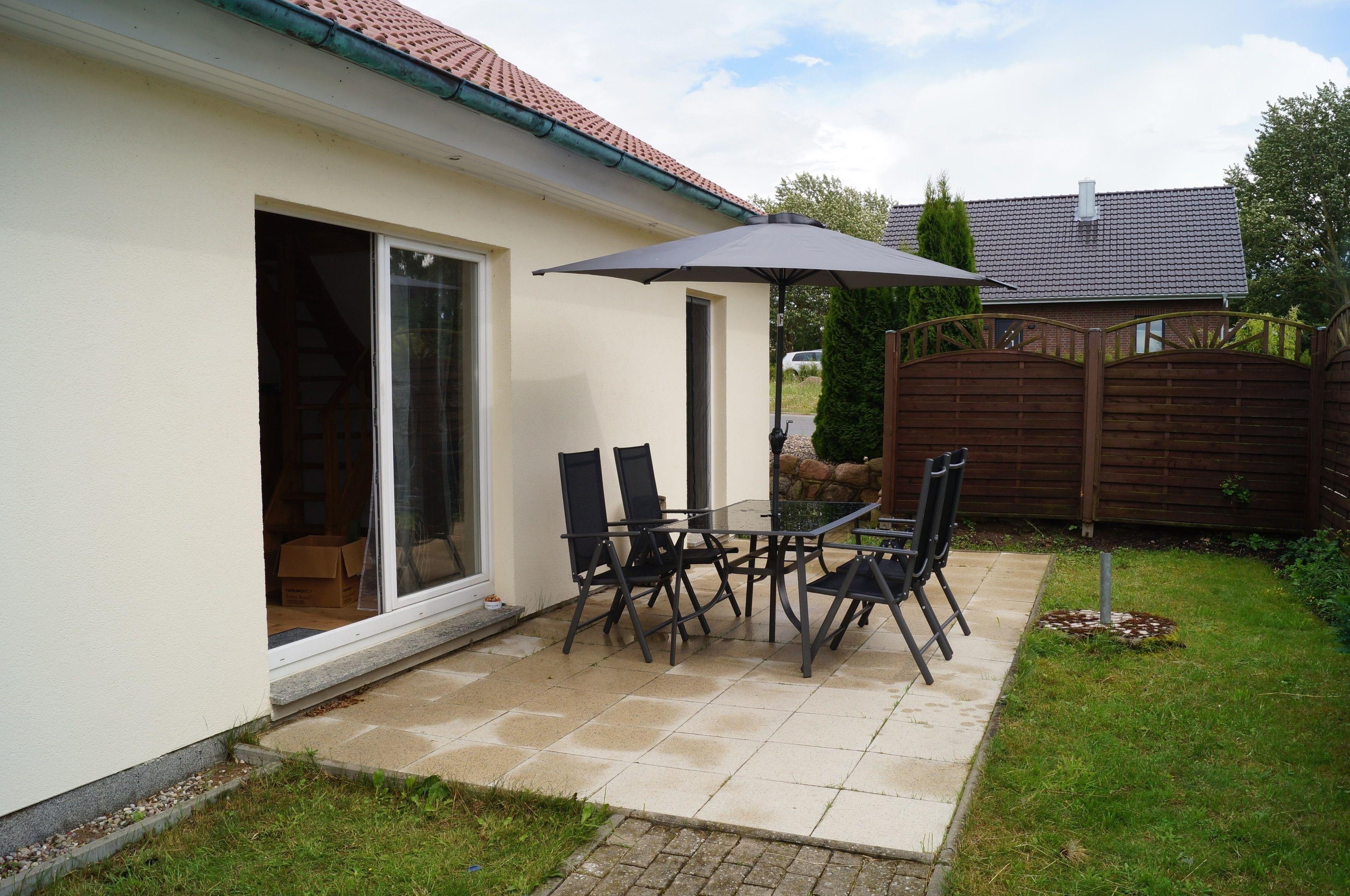 Der gemütliche Garten, den Sie direkt vom Wohnzimmer und der Küche aus erreichen, ist ausgestattet mit einer gepflasterten Terrasse mit Sitzgelegenheit für bis zu 6 Personen. Genießen Sie hier das Wetter bei gesunder Meeresluft unter dem bereit stehenden Sonnenschirm, während neben Ihnen auf dem vorhandenen Holzkohlegrill Ihr Abendessen brutzelt.