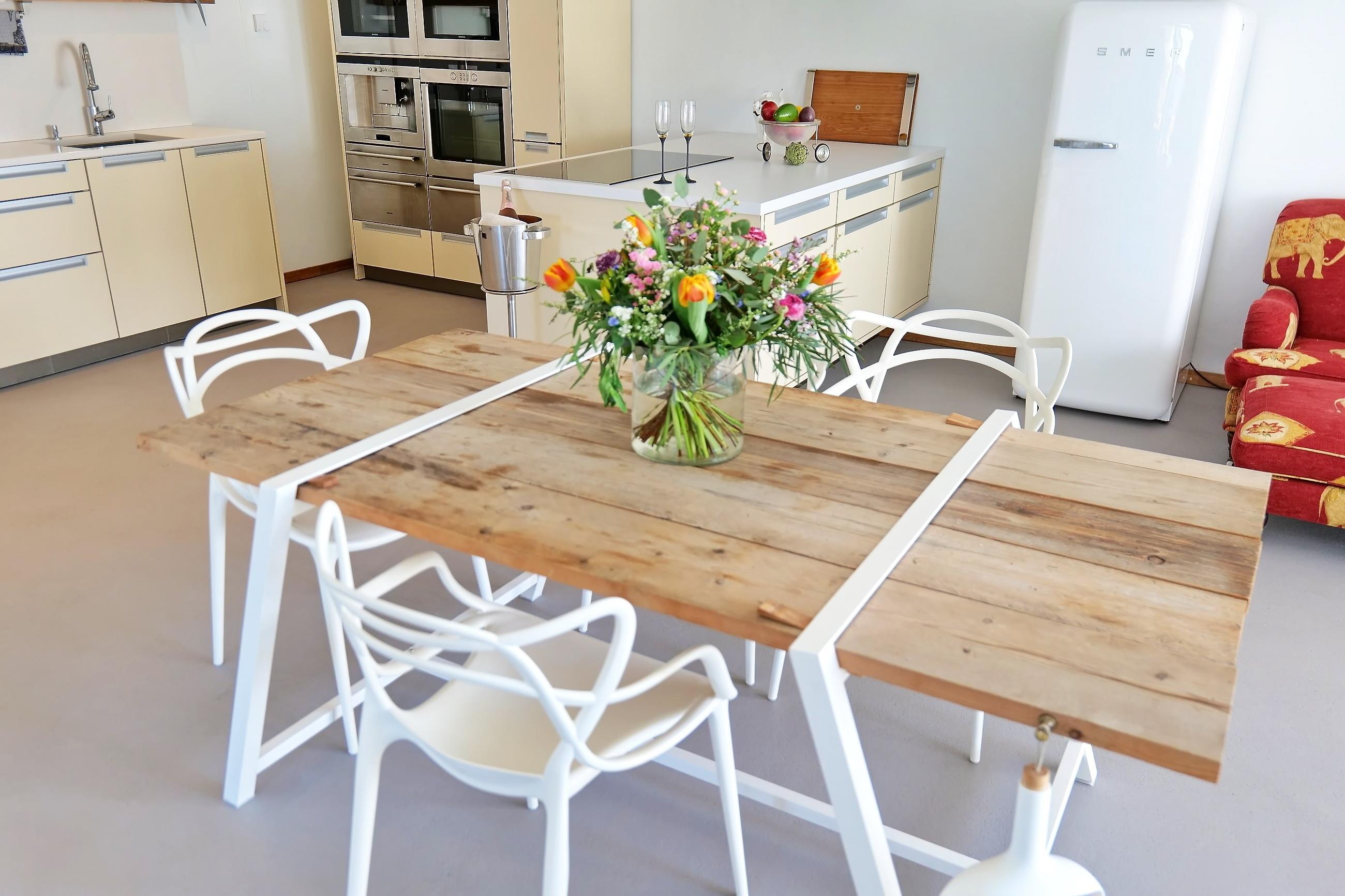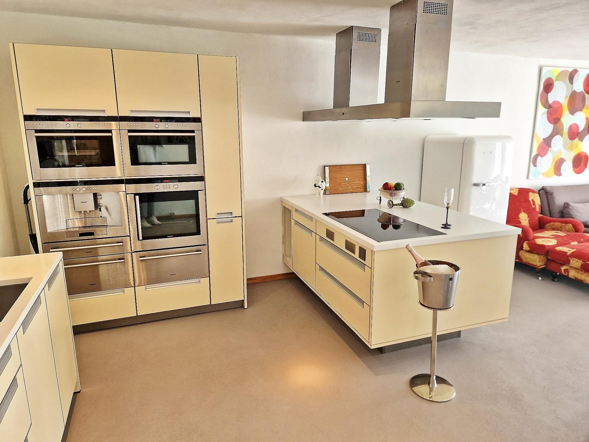 Küchenausstattung: Einbaukaffeeautomat, Toaster, Wasserkocher, Kühlschrank mit Gefrierfach und Eiswürfelfunktion, Backofen, Induktionsherd, Geschirrspüler, Geschirr, Besteckund vieles mehr)